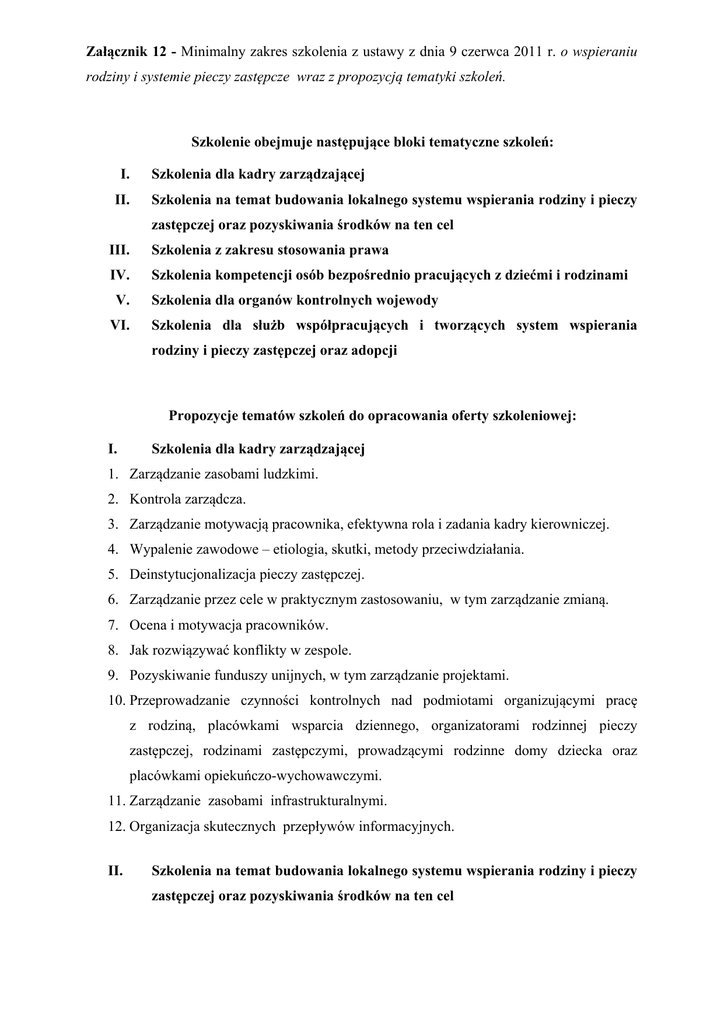 Załącznik 12 - Minimalny zakres szkolenia z ustawy z dnia 9 czerwca 2011 r. o wspieraniu rodziny i systemie pieczy zastępcze wraz z propozycją tematyki szkoleń. Szkolenie obejmuje następujące bloki tematyczne szkoleń: I. II. Szkolenia dla kadry zarządzającej Szkolenia na temat budowania lokalnego systemu wspierania rodziny i pieczy zastępczej oraz pozyskiwania środków na ten cel III. Szkolenia z zakresu stosowania prawa IV. Szkolenia kompetencji osób bezpośrednio pracujących z dziećmi i rodzinami V. VI. Szkolenia dla organów kontrolnych wojewody Szkolenia dla służb współpracujących i tworzących system wspierania rodziny i pieczy zastępczej oraz adopcji Propozycje tematów szkoleń do opracowania oferty szkoleniowej: I. Szkolenia dla kadry zarządzającej 1. Zarządzanie zasobami ludzkimi. 2. Kontrola zarządcza. 3. Zarządzanie motywacją pracownika, efektywna rola i zadania kadry kierowniczej. 4. Wypalenie zawodowe – etiologia, skutki, metody przeciwdziałania. 5. Deinstytucjonalizacja pieczy zastępczej. 6. Zarządzanie przez cele w praktycznym zastosowaniu, w tym zarządzanie zmianą. 7. Ocena i motywacja pracowników. 8. Jak rozwiązywać konflikty w zespole. 9. Pozyskiwanie funduszy unijnych, w tym zarządzanie projektami. 10. Przeprowadzanie czynności kontrolnych nad podmiotami organizującymi pracę z rodziną, placówkami wsparcia dziennego, organizatorami rodzinnej pieczy zastępczej, rodzinami zastępczymi, prowadzącymi rodzinne domy dziecka oraz placówkami opiekuńczo-wychowawczymi. 11. Zarządzanie zasobami infrastrukturalnymi. 12. Organizacja skutecznych przepływów informacyjnych. II. Szkolenia na temat budowania lokalnego systemu wspierania rodziny i pieczy zastępczej oraz pozyskiwania środków na ten cel 1. Metody i techniki w zakresie budowania lokalnego systemu wspierania rodziny i pieczy zastępczej. 2. Opracowywanie lokalnego systemu wspierania rodziny (diagnoza, wzory rzecz dziecka dokumentów, programy i cele). 3. Technika budowy polityk i strategii. 4. Usprawnianie współpracy instytucji pracujących i rodziny, celem wypracowania jednolitych na schematów postępowania w danych sytuacjach. 5. Efektywna współpraca z organizacjami pozarządowymi. 6. Pozyskiwanie środków finansowych i wdrażanie programów dotyczących wspierania rodziny i organizowania rodzinnej pieczy zastępczej. III. Szkolenia z zakresu stosowania prawa 1. Wybrane zagadnienia z zakresu prawa (rodzinnego, administracyjnego, karnego, cywilnego, pracy i zabezpieczenia społecznego). 2. Regulacje prawne w zakresie wspierania rodziny i systemu pieczy zastępczej. 3. Przetwarzanie i ochrona danych osobowych. 4. Zamówienia publiczne - procedury zasady udzielania, planowanie, szacowanie. 5. Prawo w praktyce wydawanie decyzji administracyjnych; procedura odebrania dziecka z rodziny; umowa o pracę czy zlecenie; odpowiedzialność pracownika; prawo pracy; ustawa o świadczeniach rodzinnych; ustawa o pomocy państwa w wychowaniu dzieci; Fundusz alimentacyjny; pomoc społeczna; sytuacja odebrania dziecka – ustawa o przeciwdziałaniu przemocy w rodzinie; postępowanie o ustalenie odpłatności dla rodziców biologicznych. IV. Szkolenia kompetencji osób bezpośrednio pracujących z dziećmi i rodzinami 1. Asystent rodziny – metodyka, uprawnienia i dokumentowanie pracy z rodziną. 2 2. Koordynator rodzinnej pieczy zastępczej – metodyka, uprawnienia i dokumentowanie pracy z rodzina zastępcza lub prowadzącym rodzinny dom dziecka. 3. Współpraca interdyscyplinarna - asystenta z rodzinami i służbami wspierającymi rodzinę – organizator rodzinnej pieczy zastępczej (koordynator rodzinnej pieczy zastępczej), placówki opiekuńczo - wychowawcze, ośrodki adopcyjne, rodziny zastępcze (faktyczni opiekunowie oraz opiekunowie prawni) z uwzględnieniem obowiązku wysłuchania dziecka. 4. Przygotowanie dziecka do adopcji (krajowej i zagranicznej), obowiązek wysłuchania dziecka, kluczowe etapy postępowania przedsądowego, współdziałanie rodzin zastępczych, organizatora rodzinnej pieczy zastępczej oraz ośrodków adopcyjnych. 5. Poszerzenie wiedzy oraz doskonalenie umiejętności praktycznych i kompetencji zawodowych asystentów rodziny (mediacja, komunikacja interpersonalna w pracy asystenta rodziny). 6. Superwizja pracy jako wsparcie działań m.in. asystenta rodziny, koordynatorów rodzinnej pieczy zastępczej, wychowawców w placówkach wsparcia dziennego oraz placówkach opiekuńczo wychowawczych oraz innych osób bezpośrednio pracujących z dziećmi i rodzinami . 7. Organizowanie wspomagania rozwoju dziecka z problemami emocjonalnymi i zaburzeniami zachowania. 8. Doskonalenie umiejętności opiekuńczo-wychowawczych, umiejętności radzenia sobie w sytuacjach stwarzających trudności wychowawcze. 9. Tworzenie planu pomocy dziecku jako skuteczne narzędzie pracy. 10. Tworzenie planu pracy z rodziną. 11. Efektywny opiekun usamodzielniania, jego prawa i obowiązki. 12. Problemy wynikające z opieki nad niepełnosprawnym dzieckiem. 13. Zastosowanie narzędzi psychologicznych w diagnozie rodziny – skala oceny rodziny. 14. Wzmacnianie kompetencji rodzin zastępczych. 15. Prowadzenie grup wsparcia przez koordynatorów rodzinnej pieczy zastępczej. 16. Praca z usamodzielniającym się wychowankiem pieczy zastępczej. 17. Uzależnienia wśród młodzieży i profilaktyka uzależnień. 18. Praca z dziećmi przejawiającymi zaburzenia (emocjonalne, zachowania lub zaburzenia psychiczne) i ich rodzinami. Depresja dzieci i młodzieży. 19. Dziecko cudzoziemskie w pieczy zastępczej. 20. Planowanie pracy z dzieckiem w placówce opiekuńczo – wychowawczej. 3 21. Standaryzacja w placówkach opiekuńczo – wychowawczych. 22. Sposoby radzenia z zrachowaniami agresywnymi wśród rodziców, dzieci i młodzieży. 23. Jak budować swój autorytet- warsztaty dla wychowawców. Jak radzić sobie z agresją werbalną wychowanków ? Jak tworzyć kontrakty z grupą wychowawczą?