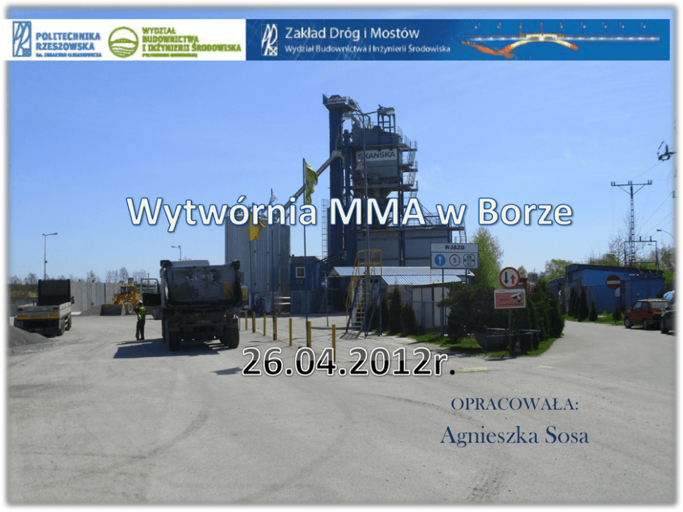 . OPRACOWAŁA: Agnieszka Sosa Typy wytwórni Ammann (klasyfikacja ze względu na umiejscowienie i technologię mieszania składników) Podstawowymi elementami wytwórni są następujące urządzenia: • Zbiorniki kruszywa z dozatorami(8 szt x10m3), • Suszarka kruszywa, • Waga kruszywa i zbiorniki frakcji, • Zbiorniki i waga wypełniaczy (2szt x100m3), • Zbiornik asfaltu(4szt x60m3), • Mieszalnik, • Zbiorniki gotowej masy (2szt x100 ton) Schemat wytwórni typu Ammann Uniglobe Proces technologiczny wytwarzania MMA 1. Składowanie i wstępne dozowanie kruszywa Podstawowy surowiec w postaci kruszywa o różnej frakcji dostarczany jest do zbiorników surowca. Następnie jest dozowany na taśmociąg, którym transportowany jest do bębna suszarki. 2. Suszenie, podgrzewanie i odpylanie kruszywa. Zadaniem suszarki jest podgrzanie kruszywa do odpowiednio wysokiej temperatury. Dodatkowo kruszywo jest odpylane. 3. Sortowanie i dozowanie gorącego kruszywa, asfaltu i dodatków Podgrzane kruszywo transportowane jest do wielopokładowego sortownika, gdzie następuje jego rozdzielenie na poszczególne frakcje. Następnie materiał pobierany jest do dalszego etapu produkcji. Składnikami, które też biorą udział w tym procesie są także wypełniacze, asfalt, dodatki uszlechatniające, a także materiały z odzysku. 4. Mieszanie i składowanie gotowej mieszanki Wszystkie składniki ważone są w odpowiednich wagach, w odpowiedniej kolejności i żądanej ilości, a następnie dozowane do mieszalnika, gdzie następuje ich mieszanie przez wymagany okres czasu. Gotowy produkt może byd ładowany bezpośrednio na samochody lub przez pewien czas przechowywany w izolowanym zasobniku. Procesy technologiczne w wytwórniach pozwalają na: •Produkcję mieszanek mineralno-asfaltowych, •Produkcję mieszanki z dodaniem starej masy na zimno do mieszalnika, •Produkcję mieszanki z dodatkiem starej masy na gorąco, podgrzewanej w bębnie równoległym System sterowania Procesami technologicznymi w wytwórni kieruje komputer ze sterownikiem przemysłowym. Automatyka zapewnia wizualizację pracy poszczególnych maszyn, sygnalizuje stany alarmowe oraz sporządza raporty i zestawienia. Zapamiętuje recepty i pozwala sterowad dozatorem poszczególnych składników i pracą maszyn. Dziękuję za uwagę!