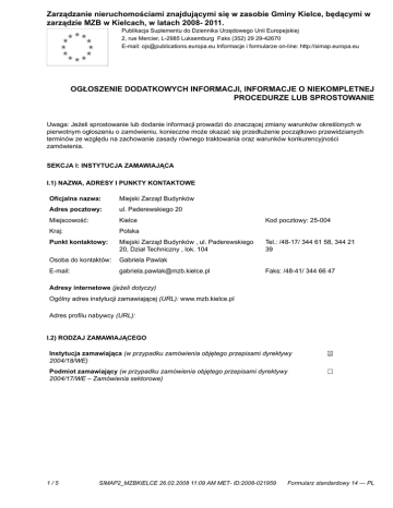 Zarządzanie nieruchomościami znajdującymi się w zasobie Gminy Kielce, będącymi w zarządzie MZB w Kielcach, w latach 2008- 2011. Publikacja Suplementu do Dziennika Urzędowego Unii Europejskiej 2, rue Mercier, L-2985 Luksemburg Faks (352) 29 29-42670 E-mail: [email protected] Informacje i formularze on-line: http://simap.europa.eu OGŁOSZENIE DODATKOWYCH INFORMACJI, INFORMACJE O NIEKOMPLETNEJ PROCEDURZE LUB SPROSTOWANIE Uwaga: Jeżeli sprostowanie lub dodanie informacji prowadzi do znaczącej zmiany warunków określonych w pierwotnym ogłoszeniu o zamówieniu, konieczne może okazać się przedłużenie początkowo przewidzianych terminów ze względu na zachowanie zasady równego traktowania oraz warunków konkurencyjności zamówienia. SEKCJA I: INSTYTUCJA ZAMAWIAJĄCA I.1) NAZWA, ADRESY I PUNKTY KONTAKTOWE Oficjalna nazwa: Miejski Zarząd Budynków Adres pocztowy: ul. Paderewskiego 20 Miejscowość: Kielce Kraj: Polska Punkt kontaktowy: Miejski Zarząd Budynków , ul. Paderewskiego 20, Dział Techniczny , lok. 104 Osoba do kontaktów: Gabriela Pawlak E-mail: [email protected] Kod pocztowy: 25-004 Tel.: /48-17/ 344 61 58, 344 21 39 Faks: /48-41/ 344 66 47 Adresy internetowe (jeżeli dotyczy) Ogólny adres instytucji zamawiającej (URL): www.mzb.kielce.pl Adres profilu nabywcy (URL): ________________________________________ I.2) RODZAJ ZAMAWIAJĄCEGO Instytucja zamawiająca (w przypadku zamówienia objętego przepisami dyrektywy 2004/18/WE) Podmiot zamawiający (w przypadku zamówienia objętego przepisami dyrektywy 2004/17/WE – Zamówienia sektorowe) 1/5 SIMAP2_MZBKIELCE 26.02.2008 11:09 AM MET- ID:2008-021959 Formularz standardowy 14 — PL Zarządzanie nieruchomościami znajdującymi się w zasobie Gminy Kielce, będącymi w zarządzie MZB w Kielcach, w latach 2008- 2011. SEKCJA II: PRZEDMIOT ZAMÓWIENIA II.1) OPIS II.1.1) Nazwa nadana zamówieniu przez instytucję zamawiającą (podano w pierwotnym ogłoszeniu) Zarządzanie nieruchomościami znajdującymi się w zasobie Gminy Kielce, będącymi w zarządzie MZB w Kielcach, w latach 2008- 2011. II.1.2) Krôtki opis (podano w pierwotnym ogłoszeniu) Przedmiotem zamówienia jest wykonanie usługi polegającej na zarządzaniu nieruchomościami zabudowanymi budynkami o charakterze mieszkalnym i niemieszkalnym znajdującymi się w zasobie Gminy Kielce, będącymi w zarządzie MZB w Kielcach oraz utrzymaniu w należytym stanie i czystości terenów przynależnych. Ogólna powierzchnia użytkowa lokali mieszkalnych i niemieszkalnych objętych zarządzaniem wg stanu na dzień 01.02.2008r. wynosi 118.529,00m2. Szczegółowy zakres zadań zlecanych Wykonawcy zawarty jest w projekcie umowy i wykazie zadań zarządcy stanowiących załączniki do specyfikacji. II.1.3) Wspólny Słownik Zamówień (CPV) (podano w pierwotnym ogłoszeniu) Główny przedmiot 2/5 Słownik główny Słownik uzupełniający (jeżeli dotyczy) 70330000 ______________________________ SIMAP2_MZBKIELCE 26.02.2008 11:09 AM MET- ID:2008-021959 Formularz standardowy 14 — PL Zarządzanie nieruchomościami znajdującymi się w zasobie Gminy Kielce, będącymi w zarządzie MZB w Kielcach, w latach 2008- 2011. SEKCJA IV: PROCEDURA IV.1) RODZAJ PROCEDURY IV.1.1) Rodzaj procedury (podano w pierwotnym ogłoszeniu) Otwarta Ograniczona Ograniczona przyspieszona Negocjacyjna Negocjacyjna przyspieszona Dialog konkurencyjny IV.2) INFORMACJE ADMINISTRACYJNE IV.2.1) Numer referencyjny nadany sprawie przez instytucję zamawiającą /podmiot zamawiający (podano w pierwotnym ogłoszeniu, o ile dotyczy) MZB/TR/ZARZ-GM/O8 IV.2.2) Dane referencyjne ogłoszenia w przypadku ogłoszeń przesłanych drogą elektroniczną (jeżeli są znane): Pierwotne ogłoszenie przesłane przez: OJS eSender Login: Login: SIMAP2_MZBKIELCE Dane referencyjne ogłoszenia: 2008-021700 (rok i numer dokumentu) IV.2.3) Ogłoszenie, którego dotyczy niniejsza publikacja (jeżeli dotyczy) _________________ z dnia __________ IV.2.4) Data wysłania niniejszego ogłoszenia: 25/02/2008 3/5 SIMAP2_MZBKIELCE 26.02.2008 11:09 AM MET- ID:2008-021959 Formularz standardowy 14 — PL Zarządzanie nieruchomościami znajdującymi się w zasobie Gminy Kielce, będącymi w zarządzie MZB w Kielcach, w latach 2008- 2011. SEKCJA VI: INFORMACJE UZUPEŁNIAJĄCE VI.1) OGŁOSZENIE DOTYCZY (o ile ma zastosowanie; zaznaczyć tyle punktów, ile jest to konieczne) Procedury niepełnej Sprostowania Informacji dodatkowych VI.3) INFORMACJE DO POPRAWIENIA LUB DODANIA (o ile dotyczy; należy określić miejsce, w którym tekst lub daty mają być zmienione lub dodane, proszę zawsze podawać odpowiedni numer sekcji i akapitu pierwotnego ogłoszenia) VI.3.1) Zmiana oryginalnej informacji podanej przez instytucję zamawiającą Publikacja w witrynie TED niezgodna z oryginalną informacją, przekazaną przez instytucję zamawiającą W obu przypadkach VI.3.2) W ogłoszeniu pierwotnym W odpowiedniej dokumentacji przetargowej "więcej informacji w odpowiedniej dokumentacji przetargowej" W obu przypadkach "więcej informacji w odpowiedniej dokumentacji przetargowej" VI.3.3) Tekst, który należy poprawić w pierwotnym ogłoszeniu (jeżeli dotyczy) Miejsce, w którym znajduje się zmieniany tekst: SEKCJA I: INSTYTUCJA ZAMAWIAJĄCEGO PKT I.1) NAZWA, ADRESY I PUNKTY KONTAKTOWE PPKT:Punkt kontaktowy: Zamiast: Powinno być: Miejski Zarząd Budynków, ul. Paderewskiego 20, Dział Techniczny, lok.104 Tel.:/48-17/344 61 58, 344 21 39. Miejski Zarząd Budynków w Kielcach, ul. Paderewskiego 20, Dział Techniczny, lok. 104. Tel.:/48-41/344 61 58, 344 21 39. VI.3.4) Daty, które należy poprawić w pierwotnym ogłoszeniu (jeżeli dotyczy) Miejsce, w którym znajdują się zmieniane daty: ____________________ ____________________ 4/5 Zamiast: Powinno być: (dd/mm/rrrr) (gg:mm) (dd/mm/rrrr) (gg:mm) __________ _____ __________ _____ SIMAP2_MZBKIELCE 26.02.2008 11:09 AM MET- ID:2008-021959 Formularz standardowy 14 — PL Zarządzanie nieruchomościami znajdujący