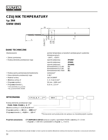 CZUJNIK TEMPERATURY 364 SWW 0945 Typ Æ25 Æ L Æ19 LK 2 otw Æ3,7 15 DANE TECHNICZNE •Zastosowanie pomiar temperatury w kana³ach wentylacyjnych systemów klimatyzacyjnych • Zakres pomiarowy –100°C...+250°C • Rodzaj elementu przetwarzaj¹cego opornik platynowy (Pt100)*) opornik platynowy (Pt500) opornik platynowy termoelement Cu-CuNi termoelement Fe-CuNi termoelement NiCr-NiAl (Pt1000) (T) (J) (K) • Rodzaj spoiny pomiarowej termoelementu izolowana*) • Klasa elementu przetwarzaj¹cego 2 (B)*) • Materia³ os³ony stal 1H18N9T • Œrednica os³ony Æ 3, 4, 5 lub 6 mm*) • D³ugoœæ czujnika L 50 mm...1000 mm*) • D³ugoœæ przewodu LK 0,15 m...2,5 m*) * Inne parametry na ¿yczenie * Na ¿yczenie Ni100, Ni1000 WYKONANIA CT(5,6,7...)** 364 Rodzaj elementu przetwarzaj¹cego Pt100, Pt500, Pt1000, J, K, T*) Œrednica os³ony Æ = 3, 4, 5 lub 6 mm*) D³ugoœæ czujnika L = 50 mm ... 1000 mm*) D³ugoœæ przewodu LK = 0,15 m ... 2,5 m*) Przyk³ad zamawiania: **Oznaczenie serii producenta nie wp³ywa na charakterystykê czujnika CT-364Pt100-3-150-0,5 oznacza czujnik z opornikiem Pt100 o œrednicy Æ = 3 mm i d³ugoœci L = 150 mm z przewodem o d³ugoœci LK = 0,5 m. Na ¿yczenie bezp³atne Œwiadectwo jakoœci okreœlaj¹ce klasê czujnika lub odp³atne Œwiadectwo kalibracji dla dowolnych temperatur z oznaczonymi odchy³kami 32