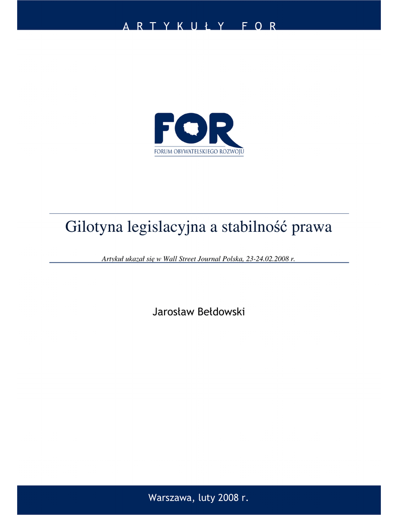 Gilotyna legislacyjna a stabilność prawa Artykuł ukazał się w Wall Street Journal Polska, 23-24.02.2008 r. Jarosław Bełdowski Warszawa, luty 2008 r. Z nadzieją na nowy wątek w dyskusji deregulacyjnej w Polsce sięgnąłem po artykuł Michała Krupińskiego, byłego Wiceministra Skarbu Państwa pt. „Potrzebna gilotyna na niepotrzebne przepisy” opublikowany na łamach WSJP w ostatni piątek. Z każdym przeczytanym zdaniem zachodziłem w głowę: jak to możliwe, że osoba uchodząca za mózg niedoszłej reformy deregulacyjnej w poprzednim rządzie pozwoliła sobie na tekst pełen tylu nieścisłości. Sukcesy i porażki PiS według raportu Doing Business To prawda, że polska gospodarka jest przeregulowana. Wskazuje na to nie tylko coroczny raport „Doing Business” Banku Światowego, ale także inne rankingi wolności gospodarczej. Odwoływanie się jednak do „Doing Business” wymaga rzetelności i wiedzy na temat metodologii tego badania. Po pierwsze: nie godzi się upraszczać, że Polska w odniesieniu do uzyskiwania koncesji i zezwoleń zajmuje 156 miejsce. Ten fragment rankingu cząstkowego „Doing Business” odnosi się bowiem wyłącznie do uzyskiwania przed przedsiębiorców pozwoleń budowlanych i nie rozciąga się, jak chciałby autor, na całą sferę reglamentacji gospodarki. Po drugie: raport „Doing Business”, wskazując na 30 dni potrzebnych do rejestracji firmy (a dokładnie 31 dni w raporcie z 2008 r.) nie odnosi się do rozpoczęcia jednoosobowej działalności gospodarczej, lecz dotyczy rejestracji spółki z ograniczoną odpowiedzialnością. Nie muszę dowodzić, że te dwie formy aktywności gospodarczej różnią się od siebie pod względem procedury rejestracyjnej. Po trzecie: prawdą jest, że rząd Jarosława Kaczyńskiego chwalony jest na stronach internetowych Banku Światowego za przeprowadzenie zmian w zakresie sądownictwa gospodarczego. Autor jednak nie dodaje, że poprzedni rząd dokonał niesłychanego wyczynu w historii tego rankingu. Polska w grupie krajów Europy Środkowej w ogólnym rankingu swobody prowadzenia działalności gospodarczej utraciła 6 pozycji, spadając z 68. miejsca na 74. miejsce (nie zaś, jak podaje autor, 73. miejsce). Przejdźmy jednak do wątku „heroicznych zmian”, jakie starał się wprowadzić poprzedni rząd. 2 Ranking swobody prowadzenia działalności gospodarczej dla krajów Europy Środkowej w latach 2006 - 2008 2007 2008 Czechy 61 56 Słowacja 31 32 Węgry 51 45 Bułgaria 54 46 Rumunia 55 48 Łotwa 20 22 Litwa 24 26 Estonia 18 17 Słowenia 53 55 Polska 68 74 Źródło: www.doingbusiness.org/economyrankings Niedoszli reformatorzy i fetysz jednego okienka Doświadczeń reformatorów zawsze warto wysłuchiwać. Nie da się jednak ukryć, że poprzednie dwa lata rządów dla poszerzenia swobody gospodarczej zostały zmarnowane. Trochę więc zaskakujące jest udzielanie rad w odwołaniu do Miltona Friedmanna: „że rząd powinien być gotowy wprowadzić najważniejsze zmiany w ciągu pierwszych sześciu miesięcy swojego rządzenia, gdy nadzieje są największe, a opór do zmian może zostać pokonany siłą rozpędu”. Pozostawiam czytelnikom interpretację tego, jak pan minister sam posługiwał się w życiu publicznym tą złotą myślą. Podzielę się jednak refleksją na temat koncepcji, która tak bardzo leży na jego sercu – jedno okienko. Od lat obserwuję polityków, którzy zapalają się do tej idei mającej się średnio do rzeczywistości gospodarczej. Owszem, ma ona znaczenie symboliczne, ale nie przesadzajmy, że musi się to przełożyć się na gwałtowny rozwój przedsiębiorczości w Polsce. Istotniejsze bowiem dla jej rozwoju jest stabilne i dobre prawo, w szczególności w obszarze danin państwowych, stosunków pracy oraz mitręgi biurokratycznej (ta jest o wiele bardziej dokuczliwa po rozpoczęciu działalności gospodarczej). 3 Wszystkiemu winna III RP Komentarza wymaga także próba oceny sytuacji historycznej, którą określa pan minister celnie „niewolą gospodarczą”. Na tym bon mocie celność się jednak kończy, bo już zdania: „polski kapitalizm rodził się w warunkach, gdy nie istniało ograniczenie rynku zbytu, gdy działały miliony małych firm, które mogły swobodnie się rozwijać, to już w połowie lat 90. w warunkach spowolnienia gospodarczego walka konkurencyjna stawała się bardzo ostra. Wtedy to właśnie już nie talent przedsiębiorcy i jego praca decydowały o wygranej na rynku, ale bardzo często znajomości z władzą oraz umiejętność przekucia ich na konkretne przepisy prawa” są nietrafne. Przypomnijmy więc jak wyglądało „spowolnienie” gospodarcze w Polsce w połowie lat 90. Zgodnie z danymi Międzynarodowego Funduszu Walutowego wzrost gospodarczy w Polsce w roku 1993 r. wyniósł 4,3 % PKB, w 1994 roku – 5,2 % PKB, w 1995 roku – 6,7 % PKB, w 1996 roku – 6,2 % PKB, a w 1997 roku – 7,1 % PKB. Gdzie to spowolnienie, które doprowadziło do uruchomienia różnych niecnych przedsiębiorców „załatwiających sobie konkretne przepisy prawa” w połowie lat dziewięćdziesiątych? Coś ciekawego można jednak wyłowić Czy coś godnego uwagi jednak można wyłowić z tekstu Ministra Krupińskiego? Osobiście podzielam jego opinię, że w Polsce przydałaby się „gilotyna legislacyjna”. Nie jestem jednak przekonany, że same ministerstwa gotowe byłyby na proponowanie likwidacji niepotrzebnych przepisów, które następnie miałby korygować samodzielny panel ekspertów. Można się tu dopatrzyć próby rozwiązania problemu, z którym zderza się każdy rząd – uzgodnień międzyresortowych. Wielu ministrów przekonało się już boleśnie, jak ich propozycja może zostać wywrócona do góry nogami przez aparat urzędniczy. W sumie szkoda, że ten wątek nie został rozwinięty, bo mógłby wnieść coś nowego do dyskusji deregulacyjnej, a nie tylko hagiograficzny opis niezłomnych działań poprzedniego r