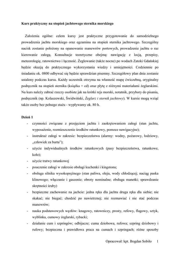 Kurs praktyczny na stopień jachtowego sternika morskiego Założenia ogólne: celem kursy jest praktyczne przygotowanie do samodzielnego prowadzenia jachtu morskiego oraz egzaminu na stopień sternika jachtowego. Szczególny nacisk zostanie położony na opanowanie manewrów portowych, prowadzenie jachtu o raz kierowanie załogą. Konsultacje teoretyczne obejmą: nawigację z locją, przepisy, meteorologię, ratownictwo i łączność. Żeglowanie (także nocne) po wodach Zatoki Gdańskiej będzie okazją do praktycznego wykorzystania wiedzy i umiejętności. Codziennie po śniadaniu ok. 0800 odbywać się będzie sprawdzian pisemny. Szczegółowy plan dnia zostanie ustalony podczas kursu. Każdy uczestnik otrzyma na własność mapę ćwiczebną, oryginalny podręcznik na stopień sternika (książka + cd) oraz płytę z różnymi materiałami żeglarskimi. Na kurs należy zabrać rzeczy osobiste jak na krótki rejs morski, notatnik, przybory do pisania, podręcznik (np. Kolaszewski, Świdwiński, Żeglarz i sternik jachtowy). W kursie mogą wziąć także osoby bez pełnego stażu - wypływamy ok. 80 h. Dzień 1 - czynności związane z przejęciem jachtu i zaokrętowaniem załogi (stan jachtu, wyposażenie, rozmieszczenie środków ratunkowy, pomoce nawigacyjne); - instruktaż załogi w zakresie: bezpieczeństwa (alarmy: wodny, pożarowy, łodziowy, „człowiek za burta”); - użycie indywidualnych środków ratunkowych (pasy bezpieczeństwa, ratunkowe, koło); - użycie tratwy ratunkowej - pouczenie załogi w zakresie obsługi kuchenki i kingstonu; - obsługa silnika wysokoprężnego (stan paliwa, oleju, wody chłodzącej; naciąg paska klinowego; włączanie i gaszenie; obroty nominalne; obsługa manetki; sprawdzanie skrętności śruby) - bezpieczne zachowanie na jachcie: jedna ręka dla jachtu druga ręka dla siebie; nie skakać; nie biegać; chodzić po nawietrznej; nie rozmawiać i nie stać podczas manewrów; - nauka podstawowych węzłów: knagowy, ratowniczy, prosty, refowy, flagowy, sztyk, wyblinka, cumowy żeglarski, rybacki; - działanie cum i szpringów; odbijacze; cuma dziobowa, rufowa; szpring dziobowy i rufowy; bezpieczna i prawidłowa praca na cumach i szpringach; różne sposoby Opracował: kpt. Bogdan Sobiło 1 zakładania lin na nabrzeżu: pachołek, knaga, ucho; zakładanie lin na biegowo; prawidłowe wykładanie odbijaczy i ich mocowanie; posługiwanie się bosakiem i wiadrem; - stawianie, zrzucanie i refowanie żagli; obsługa kabestanu i windy falowej; użycie rolfoka; knagowanie, buchtowanie; - podawanie cum na keję; prawidłowa praca „desantu” i „oka”; - manewry przy nabrzeżu: ferholung i overholung; odstawianie dziobu, odstawianie rufy; - manewry portowe na silniku: sterowanie do przodu i wstecz; nadrzucanie rufy; dojście i odejście longside; - klar portowy i klar morski jachtu; - zasady prowadzenia dziennika jachtowego - sygnały wzywanie pomocy (Załącznik IV MPDM) Dzień 2 - hamowanie cumą rufową/szpringiem dziobowym; - dociąganie do kei na szpringu dziobowym/rufowym; - manewry na silniku: różne warianty dojścia i odejścia; - zacieśnianie cyrkulacji na silniku; zawracanie na 3 w ciasnym miejscu; - manewry na żaglach: ostrzenie/odpadanie; zwroty przez sztag i rufę; zacieśnianie cyrkulacji; - system IALA - prawidła 1-10 MPDM - Kodeks morski – prawa i obowiązki kapitana - postępowanie po awarii lub wypadku jachtu - podstawy meteorologii - przygotowanie do odbioru i notowanie radiowych prognoz meteorologicznych; - odbiór i notowanie prognoz pogody Witowo Radio Dzień 3 - dojście i odejście od nabrzeża na silniku - manewry na żaglach: ostrzenie/odpadanie; zwroty przez sztag i rufę; alarm „człowiek za burtą”; stawanie w dryf; Opracował: kpt. Bogdan Sobiło 2 - dojście i odejście do nabrzeża na żaglach - prezentacja locji, spisu świateł, almanachu żeglarskiego; - charakterystyka świateł nawigacyjnych; - nawigacyjne przygotowanie wejścia do portu; - prawidła 11-19 MPDM - Nawiązywanie łączności radiowej na morzu - Łączność MAYDAY, PAN PAN, SECURITE - Służba SAR; współpraca załogi jachtu z jednostką ratunkową - odbiór prognoz pogody Witowo Radio i ich interpretacja Dzień 4 - dojście i odejście od nabrzeża na silniku - zacieśnianie cyrkulacji - podejście do boi i do dalby (na silniku i na żaglach) - prawidła 20-31 MPDM - znaki dzienne zgodne z MPDM; - sygnały dźwiękowe zgodne z MPDM; - mapa morska: rzut, skala, wydawca, geodezyjny system odniesienia, korekta, numer; - określanie pozycji geograficznej punktu na mapie; - nanoszenie pozycji na mapę; - przyrządy nawigacyjne: ekierka, przenośnik, kompas magnetyczny, log, sonda; - kursy i namiary: KK, KM, KR, KD, dewiacja, deklinacja, poprawka na wiatr, NK, NM, NR; - prognoza pogody Witowo Radio w wersji angielskiej - ratownictwo: system GMDSS, SAR; alarmowanie w niebezpieczeństwie (UKF, EPIRB, pirotechnika); użycie tratwy ratunkowej; - manewry awaryjne Dzień 5 - dojście i odejście od nabrzeża - „cumowanie śródziemnomorskie” - nakres drogi jachtu na mapie; pozycja: zliczona, obserwowana, prawdopodobna - linie pozycyjne: z namiaru, kata pionowego, poziomego, izobaty, nabieżnika, światła sektorowego Opracował: kpt. Bogdan Sobiło 3 - zastosowanie GPS w nawigacji jachtowej: działanie systemu i jego ograniczenia; geodezyjny system odniesienia; waypoint (WPT), track (T), course to steer (CTS), range (RNG), bearing (BRG), cross track error (XTE), speed over ground (SOG), route, leg, estimated time of arrival (ETA), time to go (TTG) - prawidła 32 – 38 MPDM (oraz załącznik II) - praktyczne wykorzystanie locji, spisu świateł, spisu sygnałów radiowych, almanachu żeglarskiego - przygotowanie do pływania nocnego - odbiór i interpretacja prognoz pogody (NAVTEX, mapa faksymilowa) - nawigacyjne planowanie podróży - programowanie GPS - przejście do Jastarni lub Helu - identyfikacja dziennych i nocnych znaków nawigacyjny
