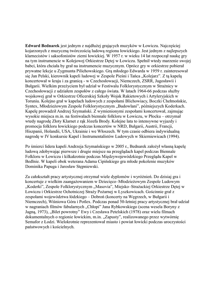 Edward Bednarek jest jednym z najdłużej grających muzyków w Łowiczu. Najczęściej kojarzonych z muzyczną twórczością ludową regionu łowickiego. Jest jednym z najlepszych klarnecistów i saksofonistów ziemi łowickiej. W 1957 r. w wieku 14 lat rozpoczął naukę gry na tym instrumencie w Kolejowej Orkiestrze Dętej w Łowiczu. Spełnił wtedy marzenie swojej babci, która chciała by grał na instrumencie muzycznym. Oprócz gry w orkiestrze pobierał prywatne lekcje u Zygmunta Pilichowskiego. Grą młodego Edwarda w 1959 r. zainteresował się Jan Pelski, kierownik kapeli ludowej w Zespole Pieśni i Tańca „Kolejarz”. Z tą kapelą koncertował w kraju i za granicą - w Czechosłowacji, Niemczech, ZSRR, Jugosławii i Bułgarii. Wielkim przeżyciem był udział w Festiwalu Folklorystycznym w Strażnicy w Czechosłowacji z udziałem zespołów z całego świata. W latach 1964-66 podczas służby wojskowej grał w Orkiestrze Oficerskiej Szkoły Wojsk Rakietowych i Artyleryjskich w Toruniu. Kolejno grał w kapelach ludowych z zespołami Blichowiacy, Boczki Chełmońskie, Syntex, Młodzieżowym Zespole Folklorystycznym „Budowlani”, późniejszych Koderkach. Kapelę prowadził Andrzej Szymański. Z wymienionymi zespołami koncertował, zajmując wysokie miejsca m.in. na festiwalach biennale folkloru w Łowiczu, w Płocku – otrzymał wtedy nagrodę Złoty Klarnet z rąk Józefa Brody. Kolejne lata to intensywne wyjazdy i promocja folkloru łowickiego podczas koncertów w NRD, Bułgarii, Austrii, Francji, Hiszpanii, Holandii, USA, Ukrainie i we Włoszech. W tym czasie odbiera indywidualną nagrodę w IV konkursie Kapel i Instrumentalistów Ludowych w Skierniewicach (1994). Po śmierci lidera kapeli Andrzeja Szymańskiego w 2005 r., Bednarek założył własną kapelę ludową zdobywając pierwsze i drugie miejsce na przeglądach kapel podczas Biennale Folkloru w Łowiczu i kilkakrotnie podczas Międzywojewódzkiego Przeglądu Kapel w Bedlnie. W kapeli obok weterana Adama Cipińskiego gra młode pokolenie muzyków Dominika Papuga i Jarosław Stępniewski. Za całokształt pracy artystycznej otrzymał wiele dyplomów i wyróżnień. Do dzisiaj gra i koncertuje z wielkim zaangażowaniem w Dziecięco–Młodzieżowym Zespole Ludowym „Koderki”, Zespole Folklorystycznym „Masovia”, Miejsko–Strażackiej Orkiestrze Dętej w Łowiczu i Orkiestrze Ochotniczej Straży Pożarnej w Łyszkowicach. Gościnnie grał z zespołami województwa łódzkiego – Dobroń (koncerty na Węgrzech, w Bułgarii i Niemczech), Wiśniowa Góra i Potlex. Podczas ponad 50-letniej pracy artystycznej brał udział w nagraniach filmów fabularnych „Chłopi” Jana Rybkowskiego (scena wesela Boryny z Jagną, 1973), „Bilet powrotny” Ewy i Czesława Petelskich (1978) oraz wielu filmach dokumentalnych o regionie łowickim, m.in. „Zapusty”, realizowanego przez wytwórnię Semafor z Łodzi. Wielokrotnie reprezentował miasto i powiat łowicki podczas uroczystości państwowych i kościelnych.