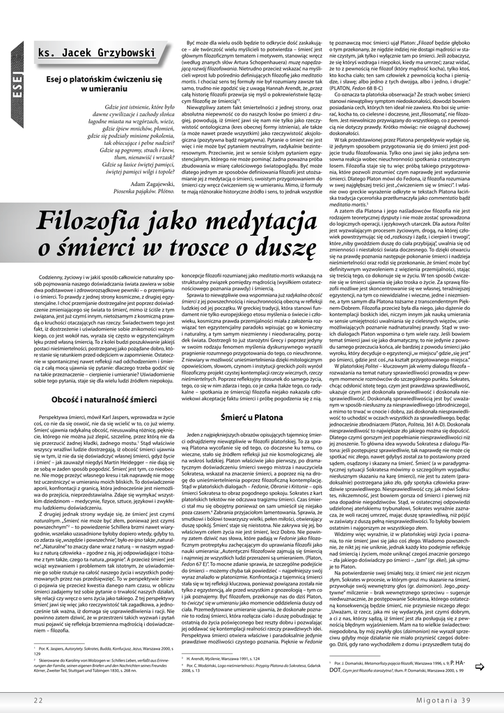 ESEJ ks. Jacek Grzybowski Esej o platońskim ćwiczeniu się w umieraniu Gdzie jest istnienie, które było dawne cywilizacje i zachody słońca łagodne miasta na wzgórzach, wieże, gdzie śpiew mnichów, płomień, gdzie się podziały minione pokolenia, tak obiecujące i pełne nadziei? Gdzie są pogromy, strach i krew, tłum, nienawiść i wrzask? Gdzie są łasice świętej pamięci, świętej pamięci wilgi i topole? Adam Zagajewski, Piosenka pająków. Płótno. Być może dla wielu osób będzie to odkrycie dość zaskakujące – ale twórczość wielu myślicieli to potwierdza – śmierć jest głównym filozoficznym tematem i motywem, stanowiąc wręcz (według znanych słów Artura Schopenhauera) muzę napędzającą rozwój filozofowania. Nietrudno przecież wskazać na myślicieli wprost lub pośrednio definiujących filozofię jako meditatio mortis. I chociaż sens tej formuły nie był rozumiany zawsze tak samo, trudno nie zgodzić się z uwagą Hannah Arendt, że „przez całą historię filozofii przewija się myśl o pokrewieństwie łączącym filozofię ze śmiercią”3. Niewątpliwy zatem fakt śmiertelności z jednej strony, oraz absolutna niepewność co do naszych losów po śmierci z drugiej, powodują, iż śmierć jawi się nam nie tylko jako rzeczywistość ontologiczna (kres obecnej formy istnienia), ale także (a może nawet przede wszystkim) jako rzeczywistość aksjologiczna (pozytywna bądź negatywna). Pytanie o śmierć nie jest więc i nie może być pytaniem neutralnym, radykalnie bezinteresownym. Przeciwnie, jest w sensie ścisłym pytaniem egzystencjalnym, którego nie może pominąć żadna poważna próba zbudowania w miarę całościowego światopoglądu. Być może dlatego jednym ze sposobów definiowania filozofii jest utożsamianie jej z medytacją o śmierci, swoistym przygotowaniem do śmierci czy wręcz ćwiczeniem się w umieraniu. Mimo, iż formuły te mają różnorakie historyczne źródło i sens, to jednak wszystkie Filozofia jako medytacja o śmierci w trosce o duszę Codzienny, życiowy i w jakiś sposób całkowicie naturalny sposób pojmowania naszego doświadczania świata zawiera w sobie dwa podstawowe i zdroworozsądkowe pewniki – o przemijaniu i o śmierci. To prawdy z jednej strony kosmiczne, z drugiej egzystencjalne. I choć przemijanie dostrzegalne jest poprzez doświadczenie zmieniającego się świata to śmierć, mimo iż ściśle z tym związana, jest już czymś innym, nietożsamym z kosmiczną prawdą o kruchości otaczających nas rzeczy. Świadectwem tego jest fakt, iż dostrzeżenie i uświadomienie sobie znikomości wszystkiego, co jest wokół nas, wyraża się często w egzystencjalnym lęku przed własną śmiercią. To z kolei budzi poszukiwanie jakiejś postaci nieśmiertelności, postrzeganej jako pożądane dobro, które stanie się ratunkiem przed odejściem w zapomnienie. Ostatecznie w spontanicznej nawet refleksji nad odchodzeniem i śmiercią z całą mocą ujawnia się pytanie: dlaczego trzeba godzić się na takie przeznaczenie – cierpienie i umieranie? Uświadomienie sobie tego pytania, staje się dla wielu ludzi źródłem niepokoju. Obcość i naturalność śmierci Perspektywa śmierci, mówił Karl Jaspers, wprowadza w życie coś, co nie da się oswoić, nie da się wcielić w to, co już wiemy. Śmierć ujawnia radykalną obcość, nieusuwalną różnicę, pęknięcie, którego nie można już zlepić, szczelinę, przez którą nie da się przerzucić żadnej kładki, żadnego mostu.1 Stąd właściwie wszyscy wrażliwi ludzie dostrzegają, iż obcość śmierci ujawnia się w tym, iż nie da się doświadczyć własnej śmierci, gdyż bycie i śmierć – jak zauważył niegdyś Martin Heidegger – nie dają się ze sobą w żaden sposób pogodzić. Śmierć jest tym, co nieobecne. Nie mogę przeżyć własnego kresu i tak naprawdę nie mogę też uczestniczyć w umieraniu moich bliskich. To doświadczenie aporii, konfrontacji z granicą, która jednocześnie jest niemożliwa do przejścia, nieprzedstawialna. Zdaje się wymykać wszystkim dziedzinom – medycynie, fizyce, sztuce, językowi i zwykłemu ludzkiemu doświadczeniu. Z drugiej jednak strony wydaje się, że śmierć jest czymś naturalnym. „Śmierć nie może być złem, ponieważ jest czymś powszechnym”2 – to powiedzenie Schillera brzmi nawet wiarygodnie, wszelako uzasadnione byłoby dopiero wtedy, gdyby to, co zdarza się „wszędzie i powszechnie”, było eo ipso także „naturalne”. „Naturalne” to znaczy dane wraz z naturą – w naszym wypadku z naturą człowieka – zgodne z nią, jej odpowiadające i tożsame z tym także, czego ta natura „pragnie”. A przecież śmierć jest wciąż wyzwaniem i problemem tak istotnym, że uświadomienie go sobie rzutuje na całość naszego życia i wszystkich podejmowanych przez nas przedsięwzięć. To w perspektywie śmierci pojawia się przecież kwestia danego nam czasu, w obliczu śmierci zadajemy też sobie pytanie o trwałość naszych działań, siłę relacji czy wręcz o sens życia jako takiego. Z tej perspektywy śmierć jawi się więc jako rzeczywistość tak zagadkowa, a jednocześnie tak ważna, iż domaga się usprawiedliwienia i racji. Nie powinno zatem dziwić, że w przestrzeni takich wyzwań i pytań musi pojawić się refleksja brzemienna mądrością i doświadczeniem – filozofia. Por. K. Jaspers, Autorytety. Sokrates, Budda, Konfucjusz, Jezus, Warszawa 2000, s 129 koncepcje filozofii rozumianej jako meditatio mortis wskazują na strukturalny związek pomiędzy mądrością (wysiłkiem ostatecznościowego poznania prawdy) i śmiercią. Sprawia to niewątpliwie owa wspomniana już radykalna obcość śmierci z jej powszechnością i nieuchronnością obecną w refleksji ludzkiej od jej początku. W greckiej tradycji, która stanowi fundament nie tylko europejskiego etosu myślenia o świecie i człowieku, kosmiczna prawda przemijalności 