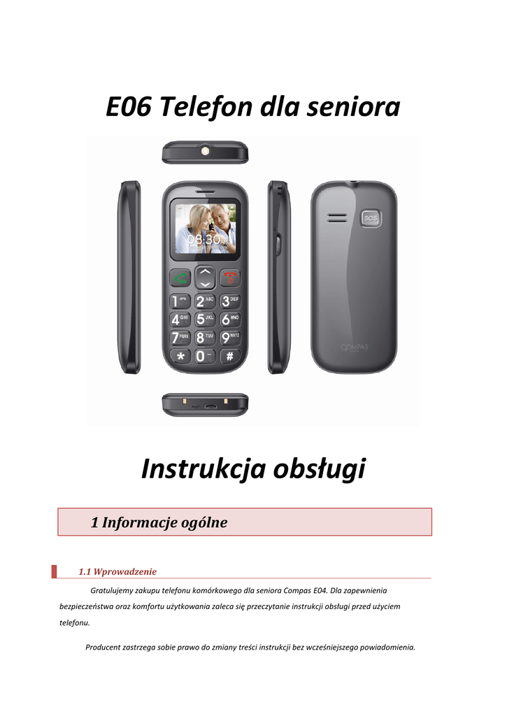 E06 Telefon dla seniora Instrukcja obsługi 1 Informacje ogólne 1.1 Wprowadzenie Gratulujemy zakupu telefonu komórkowego dla seniora Compas E04. Dla zapewnienia bezpieczeostwa oraz komfortu użytkowania zaleca się przeczytanie instrukcji obsługi przed użyciem telefonu. Producent zastrzega sobie prawo do zmiany treści instrukcji bez wcześniejszego powiadomienia. 1.2 Bezpieczeństwo Dla bezpieczeostwa użytkownika i właściwego użytkowania telefonu przeczytaj poniższą instrukcję przed rozpoczęciem użytkowania telefonu. W przypadku użytkowników z chorobami serca, należy zwrócid szczególną uwagę na głośnośd połączenia przychodzącego Należy wyłączyd telefon przed wyjściem baterii Chroo telefon i jego akcesoria przed kontaktem z wilgocią Nie trzymaj telefonu blisko ognia, bezpośrednio na słoocu lub w zbyt wysokiej bądź niskiej temperaturze Podczas użytkowania i ładowania telefon może byd gorący Nie pozostawiaj telefonu zbyt długo bez baterii lub zasilania, może to spowodowad utratę danych Nie dopuszczaj do zwarcia biegunów baterii Nie wymieniaj własnoręcznie części do telefonu, korzystaj tylko z dołączonej baterii 2 Informacje ogólne 2.1 Specyfikacja produktu Telefon Model: E06 GSM 850/900/1800/1900MHZ Bateria Li-ion 600mAh Procesor MTK6280M Ekran Kolorowy 1,77’ Typ Klasyczny Akcesoria Bateria, ładowarka, instrukcja obsługi 2 2.2 Pierwsze uruchomienie Zdejmij tylną pokrywę telefonu podważając ją w lewym dolnym rogu przy pomocy dedykowanego wycięcia w obudowie, włóż baterię i zamknij pokrywę telefonu. Po wyciągnięciu z pudełka bateria powinna byd naładowana w ok. 50%. Przy pierwszych trzech procesach ładowania zaleca się rozładowanie baterii do kooca i jej ponowne naładowanie, tak aby osiągnąd maksymalną efektywnośd baterii. Po załadowaniu akumulatora włącz telefon przytrzymując czerwony przycisk z słuchawką około 3 sekund. Po krótkim czasie bezczynności klawiatura telefonu zostanie zablokowana celem uniknięcia przypadkowego przyciskania przycisków, aby ją odblokowad naciśnij i przytrzymaj zielony przycisk słuchawki przez około 3 sekundy – pojawi się komunikat „klawiatura odblokowana”. Nie istnieje z góry określona wartośd czasowa, przez którą musisz ładowad baterię, możesz korzystad również z urządzenia podczas ładowania. 2.3 Karta SIM Aby nawiązad połączenie z siecią GSM należy wcześniej włożyd do telefonu działającą kartę SIM. Wszystkie informacje o połączeniach sieciowych i rekordy połączeo są przechowywane w obszarze metalowym karty SIM. W celu uniknięcia utraty danych z karty SIM, należy umieścid kartę SIM z dala od miejsca energii elektrycznej lub magnetyzmu i nie dotykad metalowego obszaru karty SIM. Gdy karta SIM jest uszkodzona, nie można zalogowad się w sieci GSM wówczas należy zgłosid ten fakt do swojego operatora. Urządzenie obsługuje do dwóch kart SIM. Uwaga: Należy wyłączad telefon przed wyjęciem karty SIM. Nie należy wkładad ani wyjmowad karty SIM, gdy telefon jest włączony, w przeciwnym razie karta SIM może zostad uszkodzona. 2.4 Karta pamięci Urządzenie korzysta z zewnętrznych kart pamięci (microSD). Po wyjęciu baterii, przesuo w lewo pokrywę karty i podnieś ją. Umieśd kartę pamięci w uchwycie, załóż pokrywę i przesuo ją lekko w prawo. Kartę pamięci możemy wykorzystad do przechowywania dodatkowych danych np. zdjęd. 3 2.5 Dodatki i skróty LATARKA - telefon ma wbudowaną latarkę aby z niej skorzystad przyciśnij i przytrzymaj około 2 sekundy przycisk znajdujący się na prawej bocznej ściance telefonu. Przycisk jednocześnie odpowiada za głośnośd, w górę i w dół regulujemy poziom głośności. Należy używad regulacji podczas rozmowy. SOS – przycisk umiejscowiony jest z tyłu telefonu z symbolem SOS , po krótkim przytrzymaniu (około 2 sekundy) telefon wydaje dźwięki sygnału alarmowego. Aby wyłączyd alarm wybierz przycisk z czerwoną słuchawką Przycisk . przytrzymując 2-3 sekundy możemy aktywowad lub wyłączyd tryb cichy w telefonie , aktywny tryb oznacza wyłączony dzwonek przychodzący, nie aktywny telefon jest ma włączony dzwonek. 2.6 Wykonywanie połączeń Aby wykonad połączenie należy wybrad numer korzystając z klawiatury numerycznej, bądź zapisanych wcześniej kontaktów z książki telefonicznej a następnie wcisnąd zielony przycisk słuchawki, celem zakooczenia połączenia wybierz czerwony przycisk słuchawki. Aby odebrad połączenie należy wybrad zielony przycisk słuchawki, przycisk słuchawki. 4 aby zakooczyd wybierz czerwony 3 Menu telefonu Aby przejśd do MENU telefonu należy wybrad zielony przycisk słuchawki: wybierając klawisz nawigacyjny w górę lub w dól przechodzimy do kolejnych pod menu KONTAKTY - to inaczej książka telefoniczna umożliwia zapisanie nam kontaktów znajomych, poprzez wprowadzenie nazwy (imienia) i numeru telefonu kontaktowego. Książka telefoniczna pozwala na zapisanie w telefonie imion, nazwisk i numerów telefonów. WIADOMOŚCI - Telefon umożliwia wysyłanie wiadomości tekstowych. REJESTR POŁACZEO - to rejestr wykonywanych przez nas połączeo. Historia połączeo pokazuje wszystkie połączenia zarówno wybrane jak i odebrane. MULTIMEDIA - folder zdjęcia jest miejscem na przechowywanie plików ze zdjęciami. W tym miejscu możemy przeglądad i usuwad swoje zdjęcia. Do dyspozycji mamy również odtwarzacze audio i wideo, nagrywanie dźwięku czyli dyktafon jak również wbudowane Radio FM. NARZĘDZIA – tu znajdziemy między innymi alarm, menadżer plików oraz kalendarz i kalkulator do prostych obliczeo matematycznych. USTAWIENIA – to miejsce do konfiguracji naszego telefonu, ustawiamy tutaj profile, język, czas i datę. Dostępny jest także moduł bluetooth umożliwiający bezprzewodową komunikację krótkiego zasięgu pomiędzy różnymi urządzeniami elektronicznymi, jest to funkcja telefonu pozwalająca na wykorzy