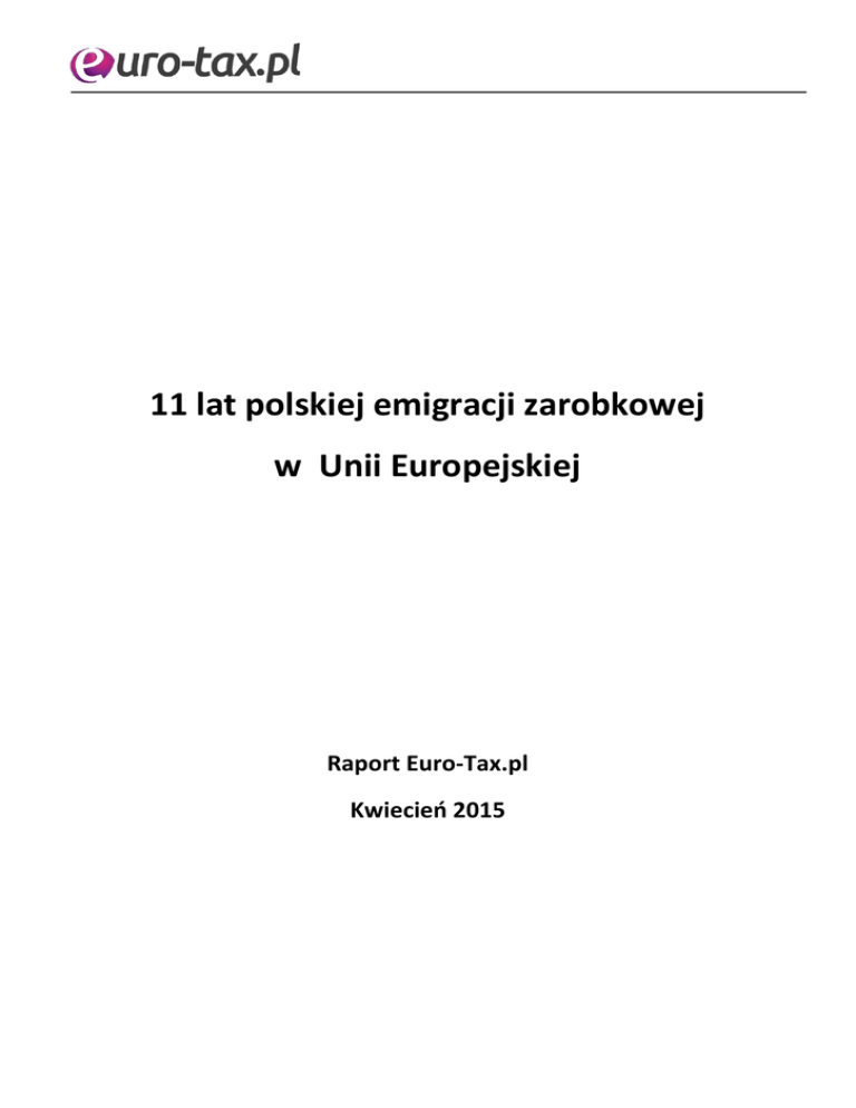 11 lat polskiej emigracji zarobkowej w Unii Europejskiej Raport Euro-Tax.pl Kwiecień 2015 Kwiecień 2015 W 11 lat Polacy zarobili 996 miliardów złotych w UE W ciągu 11 lat naszej obecności w strukturach Unii Europejskiej, Polacy zarobili w sumie ponad 996 mld złotych (w latach 2004 – 2015). Na wyjazd do pracy za granicą częściej decydują się mężczyźni, a kraje, które wybierane są najczęściej to w dalszym ciągu: Wielka Brytania, Niemcy i Holandia. Przedstawiamy wyniki najnowszego raportu na temat emigracji Polaków, przeprowadzonego przez firmę Euro-Tax.pl. 1 maja 2015 roku mija dokładnie 11 lat od kiedy nasz kraj został członkiem Unii Europejskiej. W ciągu tych 11 lat zmieniła się nie tylko wielkość emigracji zarobkowej, ale również jej struktura. Polska jest zwykle opisywana jako kraj emigrantów, tzn. taki, w którym skala wyjazdów za granicę jest większa niż przyjazdów cudzoziemców. Na przestrzeni lat zmieniła się jednak skala tego zjawiska. Ile Polacy zarobili w UE? W latach 2004 – 2015, czyli w ciągu 11-stu lat naszej obecności w strukturach Unii Europejskiej, Polacy zarobili w sumie ponad 996 mld złotych. Zdecydowanie najwięcej zarobiliśmy w Wielkiej Brytanii, bo prawie 240 mld złotych (ponad 45 mld funtów). Drugim w kolejności krajem pod względem zarobków są Niemcy. Od czasu wejścia Polski do UE, nasi rodacy otrzymali za naszą zachodnią granicą dochód w wysokości prawie 229 mld złotych (56 mld euro). W Irlandii zarobiliśmy prawie 62 mld złotych, w Holandii 34,3 mld złotych, w Austrii ponad 15 mld, a w Belgii niecałe 15 mld złotych. Ile zarobili Polacy w ciągu 11 lat w UE? 239,6 Wielka Brytania 996,9 228,7 Niemcy 34,3 61,9 Holandia Irlandia 14,8 15,1 Belgia Austria Europa Wyk. 1. Zarobki Polaków w Europie w miliardach złotych w poszczególnych krajach od 2004 r. do 2015 r. Opracowanie własne Euro-Tax.pl Kontakt dla mediów: Anna Nowacka, kom.: 504 218 275 mail: [email protected] www.euro-tax.pl Kwiecień 2015 Tylko w sześciu krajach członkowskich Zjednoczonej Europy (Austria, Belgia, Holandia, Irlandia, Niemcy, Wielka Brytania), Polacy zarobili łącznie 594 mld złotych, podczas gdy w całej Europie ich dochody wyniosły prawie 997 mld złotych. Zarobki w poszczególnych latach Rok 2014 był rekordowy pod względem zarobków Polaków. Rodacy zatrudnieni na zagranicznych rynkach zarobili łącznie ponad 111,4 mld złotych. Zarobki Polaków w Europie w latach 2004-2014 106,8 107,6 99,0 95,5 102,2 104,8 101,8 2011 2012 111,4 81,3 60,0 37,2 2004 2005 2006 2007 2008 2009 2010 2013 2014 Wyk. 2. Zarobki Polaków w miliardach złotych w Europie w poszczególnych latach. Opracowanie własne EuroTax.pl. Jak wyglądały średnie zarobki statystycznego Polaka w poszczególnych krajach? Z badań firmy wynika, że na przestrzeni 11 lat nasi rodacy w Wielkiej Brytanii średnio zarabiali 5 780 zł miesięcznie, natomiast w Niemczech ponad 6 340 zł. Na terenie Holandii obywatel Polski zarabiał średnio 5 403 zł, podczas gdy w Austrii i Irlandii – ponad 6 600 zł. Średnio w Europie polscy emigranci na przestrzeni dekady zarabiali około 5 820 złotych miesięcznie. W roku 2004 statystycznie Polak zarabiał 4 964 zł na osobę, podczas gdy w 2014 roku średni jego dochód wynosił 6 918 zł. Rok 2004 2005 2006 2007 2008 2009 2010 Średnie zarobki na osobę w PLN 4 964,1 5 130,1 5 245,5 5 741,0 5 911,8 5 859,1 5 941,2 Kontakt dla mediów: Anna Nowacka, kom.: 504 218 275 mail: [email protected] www.euro-tax.pl Kwiecień 2015 2011 2012 2013 2014 Średnia 6 121,9 6 275,0 5 919,8 6 917,6 5 820,7 Tab. 1.Średnie zarobki Polaków w PLN w poszczególnych latach. Opracowanie własne Euro- Tax.pl. Zwrot nadpłaconego podatku Dochody Polaków pracujących za granicą często nie przekraczają progu wolnego od podatku, co oznacza, że naliczone i zapłacone przez pracodawcę zaliczki na podatek należą się naszym rodakom w całości do zwrotu. Z badań firmy wynika, że w roku 2014 za pracę w Wielkiej Brytanii Polak przeciętnie odzyskał 3 037 zł nadpłaconego podatku, natomiast w Niemczech było to średnio 3 191 zł. W Holandii średnia kwota zwrotu podatku za pracę w 2014 roku wynosiła 1430 zł, podczas gdy w Austrii było to aż 3 479 zł. Kraj Średnia kwota zwrotu podatku Austria Belgia Holandia Irlandia Niemcy Wielka Brytania 3 479 2 901 1 430 2 526 3 191 3 037 Tab.2. Średnia kwota zwrotu podatku w poszczególnych krajach w 2014 roku Polacy, którzy pracują za granicą oprócz zwrotu podatku mogą również otrzymać szereg świadczeń i zasiłków, które przysługują im za pracę na terenie danego kraju. Wycena wielkości rynku zwrotu podatków dochodowych nadpłaconych za granicą Rynek zwrotu nadpłaconego podatku dochodowego zdefiniowano, jako wartość środków możliwych do odzyskania przez Polaków pracujących i rejestrujących dochody za granicą, z uwzględnieniem dopuszczanego w poszczególnych krajach okresu zarobkowania podlegającego rozliczeniu nadpłaty podatku dochodowego. Podstawą wyceny wartości rynku nadpłaconego podatku, o którego zwrot mogą starać się polscy pracownicy w związku z utrzymywaniem w poprzednich latach legalnego zatrudnienia poza granicami kraju,, były szacunki GUS dotyczące wielkości emigracji czasowej. W kalkulacji uwzględniono kraje, dla których Euro-Tax.pl przeprowadzał operację odzyskiwania nadpłaconego podatku - łącznie sześć krajów. W związku z różnicami w systemach podatkowych poszczególnych państw, w wyliczeniu uwzględniono maksymalne Kontakt dla mediów: Anna Nowacka, kom.: 504 218 275 mail: [email protected] www.euro-tax.pl Kwiecień 2015 okresy, za które pracownicy mogą starać się o zwrot nadpłaconego podatku – od trzech lat w Belgii do pięciu w Wielkiej Brytanii. Wycenie starano się nadać charakter rzeczywisty, co było podstawą wprowadzenia szeregu założeń korygujących: a) Przyjęta liczba Polaków, którzy mogą starać się o