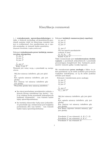 Klasyfikacja rozumowań (...) wnioskowania uprawdopodabniające to Schemat indukcji enumeracyjnej zupełnej: takie, w których wychodząc od prawdziwych przeS1 jest P słanek możemy dojść do fałszywego wniosku (nie S2 jest P jest to wykluczone), lecz spodziewamy się w spoS3 jest P sób racjonalny, że wniosek będzie prawdziwy. ... [Zygmunt Ziembiński, Logika praktyczna] Sn jest P Nie ma innych przedmiotów Schemat wnioskowania przez indukcję enumerodzaju S poza racyjną niezupełną: S1 , S2 , S3 , ..., Sn . S1 jest P Każde S jest P S2 jest P Takie rozumowanie jest wnioskowaniem dedukS3 jest P cyjnym: z przesłanek jednostkowych i przesłanki ... gwarantującej kompletność listy badanych przedSn jest P miotów wniosek ogólny wynika logicznie. Każe S jest P Wniosek jest tutaj racją, a przesłanki są następWe wnioskowaniu przez analogię z faktu, że jastwem. kieś przedmioty są do siebie podobne pod pewnym względem wnioskujemy, że są do siebie podobne Mój kot miauczy żałośliwie, gdy jest głodrównież pod innym ny. Kot sąsiada miauczy żałośliwie, gdy jest Schematy wnioskowania przez analogię: głodny. S1 jest P Kot Justyny też miauczy żałośliwie gdy S2 jest P jest głodny. S3 jest P Wszystkie głodne koty miauczą żałośliwie. ... Sn jest P Sn+1 jest P • Im więcej przebadamy przedmiotów rodzaju, o którym chcemy wnioskować (np. kotów) – czyli im większą liczbą przesłanek jednostkowych Mój kot miauczy żałośliwie, gdy jest głodbędziemy dysponować – tym wniosek będzie ny. lepiej uprawdopodobniony. Kot sąsiada miauczy żałośliwie, gdy jest głodny. • Im bardziej różnorodne będą nasze jednostkoKot Justyny też miauczy żałośliwie gdy we przesłanki (np. zróżnicowane pod względem jest głodny. pochodzenia albo rasy kotów) – tym wniosek Kot Beaty zapewne również miauczy, gdy będzie lepiej uprawdopodobniony. jest głodny. Przedmiot X ma własności A, B, C i D. Przedmiot Y ma własności A, B, C. Przedmiot Y ma własność D. 1 Zenkowi, Jurkowi i Włodkowi nie udało się naprawić tej pralki. Zdzisiowi też się to nie uda. 4. Kanon reszt AB jest przyczyną ab B jest przyczyną b A jest przyczyną a Wiarygodność wnioskowania przez analogię zależy od tego, czy podobieństwo między rozpatrywanymi przedmiotami jest konse- kwencją związku wewnętrznego między ich cechami, czy też jest czysto przypadkowe, jedynie zewnętrzne. 5. Kanon zmian towarzyszących A1 B C a1 b c A2 B C a2 b c A jest przyczyną a Pierwszy świadek ma na imię Jan, jest łysy, garPrzykłady baty i kłamie, a drugi – również Jan – też jest łysy Kanon jedynej różnicy: Poprzedzanie pozyi garbaty, więc pewnie ten drugi również kłamie. tywne. Poprzedzanie pozytywne (torowanie) polega na prezentowaniu bodźca poprzedzającego (pryWe wnioskowaniu przez indukcję eliminacyjną my), który ułatwia przetwarzania bodźca właściwena podstawie uznania pewnej alternatywy oraz odgo. Zwykle obserwuje się skrócenie czasu potrzebrzucenia niektórych spośród jej członów, dochodzi nego na przetworzenie bodźca właściwego, poprzesię do uznania pozostałych członów alternatywy: dzonego odpowiednio dobraną prymą, w porównap1 ∨ p2 ∨ ... ∨ pn−1 ∨ pn niu do bodźca niczym nie poprzedzonego lub po¬p1 przedzonego prymą neutralną. ¬p2 [por.: Nęcka i in., Psychologia poznawcza, s. 225-226] ... ¬pn−1 Kanon jedynej zgodności: Neuroobrazowanie pn poziomów przetwarzania. Otten i Rugg (2001) używając techniki funkcjonalnego rezonansu magnetycznego przeprowadzili eksperyment, w którym Kanony indukcji eliminacyjnej osoby badane miały zdecydować, czy prezentowane Poprzedniki czasowe: ABC; następniki czasowe: im słowo oznacza obiekt ożywiony, czy nie (głębszy abc. poziom przetwarzania), albo czy słowo posiada parzystą czy nieparzystą liczbę liter (poziom płytki). 1. Kanon jedynej różnicy Jedynie warunek głębokiego przetwarzania angażoABC abc wał korę przedczołową lewej półkuli oraz jej obszar BC bc przyśrodkowy. (...) Obszary [te] związane są z przeA jest przyczyną a twarzaniem znaczenia stymulacji oraz zaangażowaniem reprezentacji werbalnych. 2. Kanon jedynej zgodności [Nęcka i in., Psychologia poznawcza, s. 339] ABC abc ADE ade Kanon zmian towarzyszących: Procedura baAKL akl dania pamięci krótkotrwałej Browna-Petersonów. A jest przyczyną a [E]ksponowano zestawy trzech bezsensownych spół3. Połączony kanon jedynej zgodności i róż- głosek, np. XLR, oraz trzycyfrową liczbę, np. 123. nicy Gdy dwa lub więcej przypadków, w któ- Zadanie osoby badanej polegało na zapamiętaniu rych występuje dane zjawisko, mają tylko jed- zestawu liter, a następnie na głośnym odliczaną okoliczność wspólną, gdy dwa lub więcej niu trójkami wstecz, poczynając od zaprezentoprzypadków, w których ono nie występuje, nie wanej liczby. Po upływie pewnego czasu należało mają nic wspólnego prócz nieobecności tej oko- przerwać odliczanie i odpamiętać zestaw spółgłoliczności; w takim razie ta okoliczność, którą sek. Manipulacji eksperymentalnej podlegał interwyłącznie różnią się oba szeregi przypadków, wał czasu pomiędzy ekspozycją zestawu spółgłosek jest skutkiem lub przyczyną lub niezbędną czę- (i liczby), a poleceniem jego odtworzenia. Wynosił ścią przyczyny owego zjawiska. on 3, 6, 9, 12, 15 albo 18 s. (...) Okazało się, że 2 poziom odpamiętania sylab bardzo szybo spada w Np.: „Każdy metal jest pierwiastkiem. Mosiądz funkcji czasu, i nawet dla najkrótszego interwału jest metalem, a więc jest pierwiastkiem”. nie osiągnął 100%. [Nęcka i in., Psychologia poznawcza, s. 343-344] Błędy we wnioskowaniach (na podstawie Z. Ziembiński, Logika praktyczna) Błąd materialny (błąd we wnioskowaniach dedukcyjnych) popełniamy wtedy, jeżeli bierzemy we wnioskowaniu przesłanki fałszywe, mylnie uważając je za prawdziwe. Np. przyjęcie przesłanki 