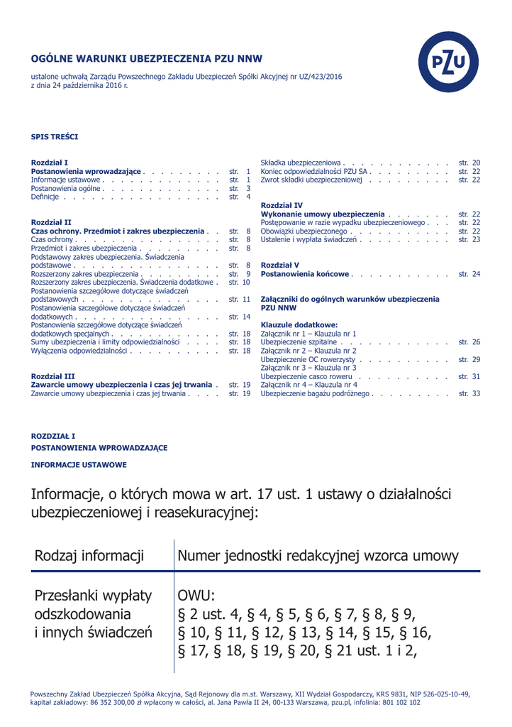 OGÓLNE WARUNKI UBEZPIECZENIA PZU NNW ustalone uchwałą Zarządu Powszechnego Zakładu Ubezpieczeń Spółki Akcyjnej nr UZ/423/2016 z dnia 24 października 2016 r. SPIS TREŚCI Rozdział I Postanowienia wprowadzające . . . . . . . . . str. 1 Informacje ustawowe . . . . . . . . . . . . . str. 1 Postanowienia ogólne . . . . . . . . . . . . . str. 3 Definicje . . . . . . . . . . . . . . . . . str. 4 Rozdział II Czas ochrony. Przedmiot i zakres ubezpieczenia . . str. 8 Czas ochrony . . . . . . . . . . . . . . . . str. 8 Przedmiot i zakres ubezpieczenia . . . . . . . . . str. 8 Podstawowy zakres ubezpieczenia. Świadczenia podstawowe . . . . . . . . . . . . . . . . str. 8 Rozszerzony zakres ubezpieczenia . . . . . . . . . str. 9 Rozszerzony zakres ubezpieczenia. Świadczenia dodatkowe . str. 10 Postanowienia szczegółowe dotyczące świadczeń podstawowych . . . . . . . . . . . . . . . str. 11 Postanowienia szczegółowe dotyczące świadczeń dodatkowych . . . . . . . . . . . . . . . . str. 14 Postanowienia szczegółowe dotyczące świadczeń dodatkowych specjalnych . . . . . . . . . . . . str. 18 Sumy ubezpieczenia i limity odpowiedzialności . . . . str. 18 Wyłączenia odpowiedzialności . . . . . . . . . . str. 18 Rozdział III Zawarcie umowy ubezpieczenia i czas jej trwania . str. 19 Zawarcie umowy ubezpieczenia i czas jej trwania . . . . str. 19 Składka ubezpieczeniowa . . . . . . . . . . . . str. 20 Koniec odpowiedzialności PZU SA . . . . . . . . . str. 22 Zwrot składki ubezpieczeniowej . . . . . . . . . str. 22 Rozdział IV Wykonanie umowy ubezpieczenia . . . . . . . str. 22 Postępowanie w razie wypadku ubezpieczeniowego . . . str. 22 Obowiązki ubezpieczonego . . . . . . . . . . . str. 22 Ustalenie i wypłata świadczeń . . . . . . . . . . str. 23 Rozdział V Postanowienia końcowe . . . . . . . . . . . str. 24 Załączniki do ogólnych warunków ubezpieczenia PZU NNW Klauzule dodatkowe: Załącznik nr 1 – Klauzula nr 1 Ubezpieczenie szpitalne . . . . . . . . . . . . str. 26 Załącznik nr 2 – Klauzula nr 2 Ubezpieczenie OC rowerzysty . . . . . . . . . . str. 29 Załącznik nr 3 – Klauzula nr 3 Ubezpieczenie casco roweru . . . . . . . . . . str. 31 Załącznik nr 4 – Klauzula nr 4 Ubezpieczenie bagażu podróżnego . . . . . . . . . str. 33 ROZDZIAŁ I POSTANOWIENIA WPROWADZAJĄCE INFORMACJE USTAWOWE Informacje, o których mowa w art. 17 ust. 1 ustawy o działalności ubezpieczeniowej i reasekuracyjnej: Rodzaj informacji Numer jednostki redakcyjnej wzorca umowy Przesłanki wypłaty odszkodowania i innych świadczeń OWU: § 2 ust. 4, § 4, § 5, § 6, § 7, § 8, § 9, § 10, § 11, § 12, § 13, § 14, § 15, § 16, § 17, § 18, § 19, § 20, § 21 ust. 1 i 2, Powszechny Zakład Ubezpieczeń Spółka Akcyjna, Sąd Rejonowy dla m.st. Warszawy, XII Wydział Gospodarczy, KRS 9831, NIP 526-025-10-49, kapitał zakładowy: 86 352 300,00 zł wpłacony w całości, al. Jana Pawła II 24, 00-133 Warszawa, pzu.pl, infolinia: 801 102 102 Rodzaj informacji Numer jednostki redakcyjnej wzorca umowy Przesłanki wypłaty odszkodowania i innych świadczeń OWU: § 22, § 23, § 24, § 25, § 26, § 27, § 28, § 29, § 30, § 31, § 32, § 33, § 34, § 35, § 36, § 37, § 38, § 39, § 40, § 41, § 42, § 44 ust. 5–7, § 47 ust. 2–7, § 48, § 55, § 58, § 59, § 60, § 61, § 62, § 63, § 64, § 65, § 66, § 67 Załącznik do OWU: Klauzula nr 1 Ubezpieczenie szpitalne: § 1, § 3, § 4, § 8, § 9, § 10, § 11, § 12, § 13, § 16, § 17 Klauzula nr 2 Ubezpieczenie OC rowerzysty: § 1, § 2, § 3, § 5, § 6 Klauzula nr 3 Ubezpieczenie casco roweru: § 1, § 2, § 3, § 6, § 7, § 8 Klauzula nr 4 Ubezpieczenie bagażu podróżnego: § 1, § 2, § 3, § 4, § 6, § 7, § 8 Ograniczenia oraz wyłączenia odpowiedzialności zakładu ubezpieczeń uprawniające do odmowy wypłaty odszkodowania i innych świadczeń lub ich obniżenia OWU: § 2 ust. 4, § 4, § 5, § 13, § 14, § 15, § 16, § 17, § 18, § 19, § 20, § 21, § 22, § 23, § 24, § 25, § 26, § 27, § 28, § 29, § 30, § 31, § 32, § 33, § 34, § 35, § 36, § 37, § 38, § 39, § 40, § 41, § 42, § 44 ust. 8, § 47 ust. 2–7, § 48, § 55, § 60 ust. 3 i 4, § 61, § 62, § 63, § 64, § 66, § 67 OGÓLNE WARUNKI UBEZPIECZENIA PZU NNW 2 Rodzaj informacji Numer jednostki redakcyjnej wzorca umowy Ograniczenia oraz wyłączenia odpowiedzialności zakładu ubezpieczeń uprawniające do odmowy wypłaty odszkodowania i innych świadczeń lub ich obniżenia Załączniki do OWU: Klauzula nr 1 Ubezpieczenie szpitalne: § 3, § 4, § 5, § 8, § 9, § 10, § 11, § 12, § 13, § 16, § 18, § 19 Klauzula nr 2 Ubezpieczenie OC rowerzysty: § 2, § 3, § 4, § 5, § 6 Klauzula nr 3 Ubezpieczenie casco roweru: § 2, § 3, § 4, § 6, § 7, § 8 Klauzula nr 4 Ubezpieczenie bagażu podróżnego: § 2, § 3, § 4, § 5, § 6, § 7, § 8 POSTANOWIENIA OGÓLNE § 1 1. Ogólne warunki ubezpieczenia PZU NNW, zwane dalej „OWU”, mają zastosowanie do umów ubezpieczenia zawieranych przez Powszechny Zakład Ubezpieczeń Spółkę Akcyjną, zwaną dalej „PZU SA”, z osobami fizycznymi, osobami prawnymi oraz jednostkami organizacyjnymi niebędącymi osobami prawnymi. 2. Na podstawie OWU umowa ubezpieczenia NNW może być zawarta w zakresie następujących rodzajów umów ubezpieczenia: 1) umowa ubezpieczenia NNW Ogólne, która może zostać zawarta jako umowa ubezpieczenia: a) indywidualnego, b) rodzinnego, c) zbiorowego; 2) umowa ubezpieczenia PZU Grupowe; która może zostać zawarta jako umowa ubezpieczenia grupowego; 3) umowa ubezpieczenia PZU Sport; która może zostać zawarta jako umowa ubezpieczenia: a) indywidualnego, b) zbiorowego; 4) umowa ubezpieczenia PZU Rowerzysta, która może zostać zawarta jako umowa ubezpieczenia: a) indywidualnego, b) zbiorowego. OGÓLNE WARUNKI UBEZPIECZENIA PZU NNW 3. Na wniosek ubezpieczającego i po zapłacie dodatkowej składki ubezpieczeniowej umowa ubezpieczenia PZU Gr
