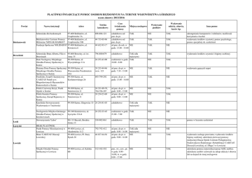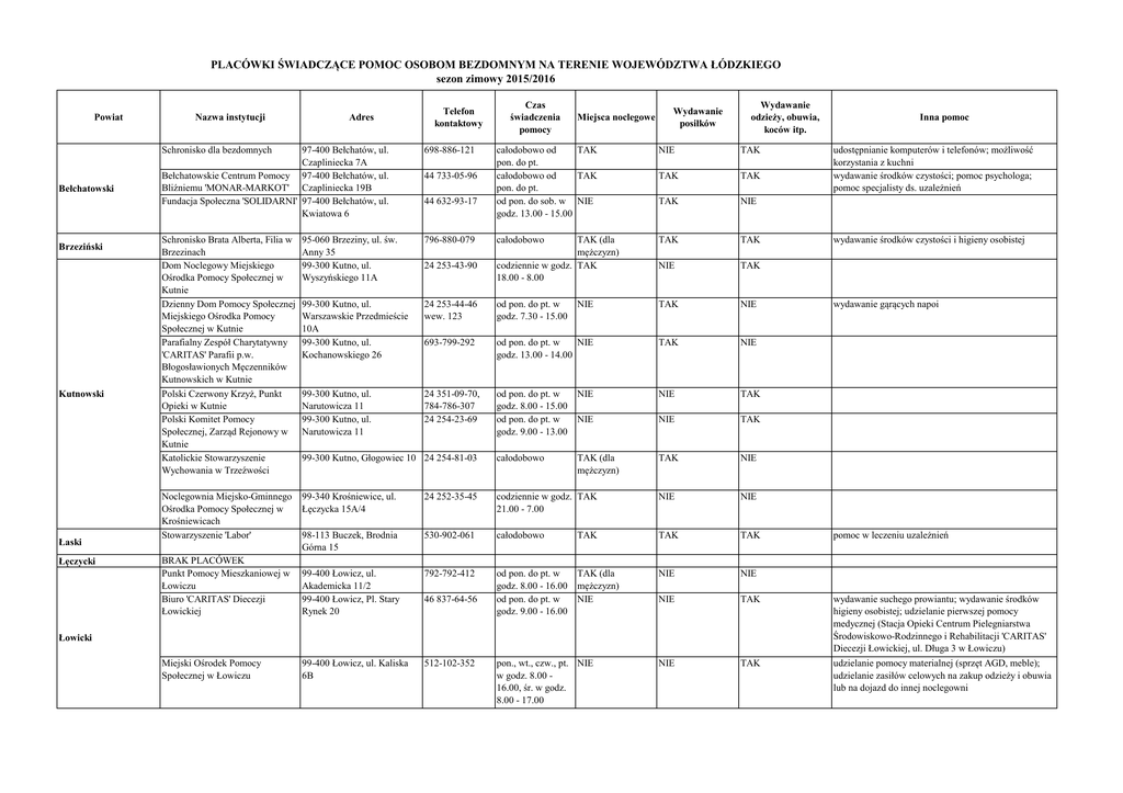 PLACÓWKI ŚWIADCZĄCE POMOC OSOBOM BEZDOMNYM NA TERENIE WOJEWÓDZTWA ŁÓDZKIEGO sezon zimowy 2015/2016 Powiat Nazwa instytucji Adres 97-400 Bełchatów, ul. Czapliniecka 7A Bełchatowskie Centrum Pomocy 97-400 Bełchatów, ul. Bliźniemu 'MONAR-MARKOT' Czapliniecka 19B Fundacja Społeczna 'SOLIDARNI' 97-400 Bełchatów, ul. Kwiatowa 6 Schronisko dla bezdomnych Bełchatowski Brzeziński Kutnowski Łaski Łęczycki Telefon kontaktowy 698-886-121 44 733-05-96 44 632-93-17 Czas świadczenia pomocy Miejsca noclegowe Wydawanie posiłków Wydawanie odzieży, obuwia, koców itp. całodobowo od TAK pon. do pt. całodobowo od TAK pon. do pt. od pon. do sob. w NIE godz. 13.00 - 15.00 NIE TAK TAK TAK TAK NIE całodobowo TAK (dla mężczyzn) codziennie w godz. TAK 18.00 - 8.00 TAK TAK NIE TAK Inna pomoc udostępnianie komputerów i telefonów; możliwość korzystania z kuchni wydawanie środków czystości; pomoc psychologa; pomoc specjalisty ds. uzależnień Schronisko Brata Alberta, Filia w Brzezinach Dom Noclegowy Miejskiego Ośrodka Pomocy Społecznej w Kutnie Dzienny Dom Pomocy Społecznej Miejskiego Ośrodka Pomocy Społecznej w Kutnie Parafialny Zespół Charytatywny 'CARITAS' Parafii p.w. Błogosławionych Męczenników Kutnowskich w Kutnie Polski Czerwony Krzyż, Punkt Opieki w Kutnie Polski Komitet Pomocy Społecznej, Zarząd Rejonowy w Kutnie Katolickie Stowarzyszenie Wychowania w Trzeźwości 95-060 Brzeziny, ul. św. Anny 35 99-300 Kutno, ul. Wyszyńskiego 11A 796-880-079 99-300 Kutno, ul. Warszawskie Przedmieście 10A 99-300 Kutno, ul. Kochanowskiego 26 24 253-44-46 wew. 123 od pon. do pt. w NIE godz. 7.30 - 15.00 TAK NIE 693-799-292 od pon. do pt. w NIE godz. 13.00 - 14.00 TAK NIE 99-300 Kutno, ul. Narutowicza 11 99-300 Kutno, ul. Narutowicza 11 24 351-09-70, 784-786-307 24 254-23-69 od pon. do pt. w NIE godz. 8.00 - 15.00 od pon. do pt. w NIE godz. 9.00 - 13.00 NIE TAK NIE TAK 99-300 Kutno, Głogowiec 10 24 254-81-03 całodobowo TAK NIE Noclegownia Miejsko-Gminnego Ośrodka Pomocy Społecznej w Krośniewicach Stowarzyszenie 'Labor' 99-340 Krośniewice, ul. Łęczycka 15A/4 24 252-35-45 codziennie w godz. TAK 21.00 - 7.00 NIE NIE 98-113 Buczek, Brodnia Górna 15 530-902-061 całodobowo TAK TAK BRAK PLACÓWEK Punkt Pomocy Mieszkaniowej w Łowiczu Biuro 'CARITAS' Diecezji Łowickiej 99-400 Łowicz, ul. Akademicka 11/2 99-400 Łowicz, Pl. Stary Rynek 20 792-792-412 od pon. do pt. w TAK (dla godz. 8.00 - 16.00 mężczyzn) od pon. do pt. w NIE godz. 9.00 - 16.00 NIE NIE NIE TAK wydawanie suchego prowiantu; wydawanie środków higieny osobistej; udzielanie pierwszej pomocy medycznej (Stacja Opieki Centrum Pielegniarstwa Środowiskowo-Rodzinnego i Rehabilitacji 'CARITAS' Diecezji Łowickiej, ul. Długa 3 w Łowiczu) Miejski Ośrodek Pomocy Społecznej w Łowiczu 99-400 Łowicz, ul. Kaliska 6B 512-102-352 pon., wt., czw., pt. NIE w godz. 8.00 16.00, śr. w godz. 8.00 - 17.00 NIE TAK udzielanie pomocy materialnej (sprzęt AGD, meble); udzielanie zasiłów celowych na zakup odzieży i obuwia lub na dojazd do innej noclegowni 24 253-43-90 46 837-64-56 TAK (dla mężczyzn) TAK Łowicki wydawanie środków czystości i higieny osobistej wydawanie gąrących napoi pomoc w leczeniu uzależnień Powiat Łowicki Nazwa instytucji Adres Telefon kontaktowy Noclegownia Miejskiego Ośrodka 99-400 Łowicz, ul. Kaliska Pomocy Społecznej w Łowiczu 6B Dom Pomocy Społecznej Łódzki Wschodni Dom Pomocy Społecznej Łódź Miasto Schronisko dla Bezdomnych Mężczyzn Towarzystwa Pomocy im. św. Brata Alberta Noclegownia dla Bezdomnych Mężczyzn Towarzystwa Pomocy im. św. Brata Alberta Schronisko dla Bezdomnych Mężczyzn Towarzystwa Pomocy im. św. Brata Alberta Schronisko dla Bezdomnych Kobiet Towarzystwa Pomocy im. św. Brata Alberta Miejskie Schronisko dla Bezdomnych Kobiet wraz z Noclegownią - schronisko Miejskie Schronisko dla Bezdomnych Kobiet wraz z Noclegownią - noclegownia Świetlica dla osób bezdomnych Towarzystwa Pomocy im. św. Brata Alberta Mieszkania Readaptacyjne Towarzystwa Pomocy im. św. Brata Alberta Stowarzyszenie Promocji Zdrowia i Psychoterapii, Specjalistyczny Ośrodek Wsparcia dla Ofiar Przemocy w Rodzinie Dom dla matek z małoletnimi dziećmi i kobiet w ciąży Czas świadczenia pomocy całodobowo Miejsca noclegowe Wydawanie posiłków Wydawanie odzieży, obuwia, koców itp. Inna pomoc TAK NIE NIE 95-040 Koluszki, Lisowice 13 44 714-11-76, 44 całodobowo 714-18-76 95-020 Andrespol, Wiśniowa 42 213-23-09, 42 całodobowo Góra, ul. Tuszyńska 56 213-23-41 TAK (dla kobiet) NIE NIE TAK TAK NIE 92-114 Łódź, ul. Szczytowa 11 42 679-31-35 całodobowo TAK TAK TAK opieka socjalna i medyczna 92-114 Łódź, ul. Szczytowa 11 42 679-31-35 w godz. 20.00 8.00 TAK TAK TAK opieka socjalna 94-102 Łódź, ul. Nowe Sady 42 259-27-05 17 całodobowo TAK TAK TAK opieka socjalna i medyczna 93-361 Łódź, ul. Kwietniowa 42 683-38-00 2/4 całodobowo TAK TAK TAK opieka socjalna i medyczna 93-259 Łódź, ul. Gałczyńskiego 7 42 647-03-33 całodobowo TAK TAK TAK opieka socjalna 93-259 Łódź, ul. Gałczyńskiego 7 43 647-03-33 w godz. 20.00 8.00 TAK TAK TAK opieka socjalna TAK TAK opieka socjalna TAK TAK TAK TAK pomoc terapeutyczna, socjoterapeutyczna; praktyczne przygotowanie do samodzielnego życia; poradnictwo w zakresie aktywnosci zawodowej opieka socjalna i medyczna; pomoc terapeutyczna i socjoterapeutyczna TAK TAK 92-114 Łódź, al. Piłsudskiego brak 119 93-367 Łódź, ul. Trębacka 3 42 645-36-27 91-837 Łódź, ul. Franciszkańska 85 42 640-65-91 1.12.2015 NIE 15.03.2016 w godz. 8.00 - 16.00 mieszkania TAK całoroczne / całodobowe całodobowo TAK 93-162 Łódź, ul. Broniewskiego 1A 42 688-18-49 całodobowo TAK (dla kobiet z dziećmi) pomoc psychologiczna Powiat Łódź Miasto Opoczyński Nazwa instytucji Pajęczański Piotrkowski Piotrków Tryb. Miasto Poddębicki Telefon kontaktowy Czas świadczenia pomocy Miejsca noclegowe Wydawanie posiłków Wydawanie odzieży, obuwia, koców itp.