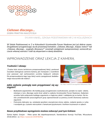 SYLWIA KĄKIEL, SZKOŁA PODSTAWOWA NR 2 W KOLUSZKACH W Szkole Podstawowej nr 2 w Koluszkach Uczniowskie Forum Naukowe jest już dobrze znane. Drugoklasiści przygotowując się do prezentacji tematów: „Ciekawe, dlaczego...księżyc świeci?” lub „Ciekawe, dlaczego... wyginęły dinozaury?” rozwinęli umiejętność autoprezentacji, wzmocnili poczucie własnej wartości i stali się ekspertami w danej dziedzinie. WPROWADZENIE ORAZ LEKCJA Z KAMERĄ „Trudna była strona techniczna przeprowadzonej lekcji, ponieważ musiałam obsługiwać zarówno kamerę, jak i komputer z rzutnikiem oraz panować nad zachowaniem uczniów będących widzami. Do przeprowadzenia tego typu lekcji warto zaangażować dodatkowego nauczyciela lub rodzica”. Fot. http://szk2015.ceo.nq.pl/kurs/dokument/1706/ » » Budowanie argumentów: dla każdej grupy przygotowano wydrukowane, pocięte na części zdania, mówiące o tym, dlaczego warto brać udział w zadaniu Uczniowskie Forum Naukowe. Zadaniem uczniów było połączenie każdego argumentu w logiczną całość i naklejenie jej na karton. Na koniec przedstawiciele poszczególnych grup zaprezentowali za pomocą scenki dramowej wybrany argument. Ćwiczenia dykcyjne np. omiatanie językiem zewnętrznej strony zębów, zwijanie języka w rurkę i rozwijanie go, czytanie wierszyków z łamańcami językowymi z korkiem trzymanym w zębach. Sylwia Kąkiel, Gracjan – Pełno spraw dla niepełnosprawnych, Standardowa licencja YouTube, Wyszukano 25.02.2016 r. w: https://youtu.be/xS5ZFJEZFrg „Przygotowania oraz prezentacje UFoN-ów były dużą frajdą dla uczniów oraz dla mnie. Moi wychowankowie w ciekawy sposób opowiedzieli klasie o wielu fascynujących faktach i zdarzeniach, taka forma nauki była doskonałą odmianą, ponieważ uczniowie uczyli się od siebie nawzajem”. Więcej informacji o wprowadzeniu do UFoNów i lekcji z kamerą znajdziecie w opisach na platformie programu: http://szk2015.ceo.nq.pl/kurs/dokument/1706/ (lekcja wprowadzająca) http://szk2015.ceo.nq.pl/kurs/dokument/1937/ (lekcja z kamerą) WYSTĄPIENIA NA FORUM „Po wnikliwym obejrzeniu filmów wybrałam kilku uczniów, potrafiących odnaleźć się w prezentacji na żywo przed większą widownią. Wraz z uczniami obejrzeliśmy ich wystąpienia raz jeszcze i w efekcie do publicznej prezentacji wybraliśmy Kasię z jej opowieścią Dlaczego delfiny mogą się utopić?.” » » » » Staliśmy się ekspertami w zakresie tematów naszych Fot. http://szk2015.ceo.nq.pl/kurs/dokument/3632/ wystąpień; Przełamaliśmy strach prze publicznym wystąpieniem; Zaciekawiliśmy i rozśmieszyliśmy publiczność naszą prezentacją; Doprowadziliśmy zadanie do końca, co bardzo podniosło nasze poczucie wartości. » » » » tworzyć ciekawe wypowiedzi w języku polskim, wyszukiwać informacje w różnych źródłach i wybierać najważniejsze, jasno wyrażać swoje myśli, wzbogaciliśmy nasze słownictwo. „Wystąpieniu towarzyszyły ogromne emocje i spora dawka mobilizującego stresu. Na początek opowiedziałam widowni o realizowanej przez naszą klasą ścieżce. Następnie zapowiedziałam Kasię, która z wypiekami na twarzy i błyszczącymi oczami opowiedziała o tym co ją fascynuje – o delfinach. W tle za nią wyświetlane były zdjęcia, a samo wystąpienie przebiegało płynnie i wywoływało entuzjastyczne reakcje wśród widowni – śmiech w chwilach, gdy przytaczała humorystyczne spostrzeżenia oraz gromkie brawa”. Więcej informacji o wystąpieniach na forum znajdziecie w opisie na platformie programu: http://szk2015.ceo.nq.pl/kurs/dokument/3632/