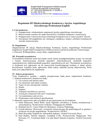 Zespół Szkół Transportowo-Elektrycznych Centrum Kształcenia Ustawicznego 63 – 400 Ostrów Wielkopolski, ul. Kantaka 6 tel. (062) 736-67-09 www.zste.info.pl Adres e-mail: [email protected] Regulamin III Międzyszkolnego Konkursu z Języka Angielskiego Zawodowego Professional English I. Cele konkursu: 1) Propagowanie i doskonalenie znajomości języka angielskiego zawodowego. 2) Motywowanie uczniów do nauki słownictwa z dziedzin transportu i motoryzacji. 3) Propagowanie wykorzystywania technologii komputerowej w nauce języków obcych. 4) Nawiązanie lub pogłębienie już istniejącej współpracy między szkołami kształcącymi zawody motoryzacyjne. II. Organizator: Organizatorem III edycji Międzyszkolnego Konkursu Języka Angielskiego Professional English jest Zespół Szkół Transportowo-Elektrycznych Centrum Kształcenia Ustawicznego w Ostrowie Wielkopolskim, zwany dalej „organizatorem”. III. Warunki uczestnictwa Uczestnikiem konkursu może być każdy uczeń szkoły ponadgimnazjalnej uczący się zawodu z branży motoryzacyjnej (technik pojazdów samochodowych, mechanik pojazdów samochodowych, elektromechanik pojazdów samochodowych itd.). Warunkiem uczestnictwa w konkursie jest zgłoszenie się do nauczyciela koordynującego konkurs w danej szkole. Koordynator wypełnia kartę zgłoszenia, którą należy nadesłać pocztą elektroniczną. Wzór karty jest załącznikiem do regulaminu. IV. Zakres programowy Testy konkursowe, pytania i zadania przygotowane będą przez organizatora konkursu. 1. Zadania konkursowe obejmować będą: 1) Car exterior and interior parts. 2) Car electronic and safety systems. 3) Types of cars and specials vehicles. 4) Roads. 5) Engines. 6) Transport and delivery services. 7) Acronyms connected with cars/ Constraints. 8) Car maintenance and service. 9) Performance and technical specifications. 2. Materiały sugerowane jako przydatne do przygotowania się do konkursu: 1) Sarna Katarzyna, Sarna Rafał: Język angielski zawodowy w branży mechanicznej i samochodowej. Wydawnictwo Szkolne i Pedagogiczne (WSIP). 2) Dearholt Jim D.: Career Paths for Mechanics. Express Publishing. 3) Grzęda Mariusz: Słowiczek i rozmówki motoryzacyjne dla podróżujących za granicę i uczących się języka angielskiego. Wydawnictwo ASTRA. 4) Marie Kavanag: English for Automobile Industry. Oxford University Press. 5) Paul Radley, Simons Daniela, Campbell Colin, Wieruszowska Małgorzata: New Horizons 1/2- Vocational Bank: Car and Motor Industry/Logistics. Oxford University Press. V. Zasady i przebieg konkursu Zgłoszenia uczestników Szkoła powołuje szkolnego koordynatora konkursu. Koordynatorzy typują wg własnego kryterium od jednego do pięciu uczestników konkursu. Przy większej liczbie kandydatów zaleca się zorganizowanie wewnętrznego szkolnego konkursu. Koordynatorzy są zobowiązani przesłać do organizatora pocztą elektroniczną do dnia 24 marca 2014 r. wypełnioną kartę zgłoszenia na konkurs. Wzór karty zgłoszenia stanowi załącznik nr 1 do regulaminu. Niezbędnym jest podanie w karcie adresu mailowego koordynatora do korespondencji konkursowej. Organizator na ten adres będzie wysyłał materiały do przeprowadzenia I etapu konkursu. Etap I. Pierwszy etap konkursu odbędzie się w dniu 27 marca 2014 roku. Będzie miał on formę pisemną i polegać będzie na rozwiązywaniu w macierzystych szkołach przez uczestników testów w wersji elektronicznej, nadesłanych przez organizatora. Uczniowie we wszystkich szkołach rozwiązują testy równocześnie. Następnie są one przesyłane do organizatora w wersji elektronicznej. 1. Każdy uczestnik musi mieć zapewniony dostęp w szkole do komputera w godzinach 10.00 – 11.00 oraz możliwość otwarcia testu w dokumencie Word. Dla zachowania warunków samodzielnej pracy uczestnicy muszą pisać test w odizolowanym od pozostałych uczniów szkoły pomieszczeniu, najlepiej w szkolnej pracowni komputerowej, w obecności koordynatora szkolnego. Dopuszcza się obecność informatyka. Prosimy nauczycieli koordynatorów o zachowanie zasad fair play. 2. O godzinie 9.50 szkolni koordynatorzy pobierają materiały konkursowe nadesłane przez organizatora, na adres poczty elektronicznej koordynatora. Koordynatorzy są zobowiązani do odesłania automatycznie generowanej wiadomości potwierdzającej odbiór materiałów. W razie problemów technicznych koordynator proszony jest o pilny kontakt telefoniczny z organizatorem (ZST-E CKU: 62 7366709, Bogumiła Sibińska: 664 784 473). Materiał konkursowy będzie nadesłany w dwóch formach, tzn. w Word oraz PDF. Wersja w PDF będzie wysłana tylko jako wzorzec tekstu. 3. Koordynator przekazuje uczestnikom konkursu testy jako dokumenty Word, na którym pracować będą uczestnicy. Sposób przekazania uczestnikom materiałów (dowolnym nośnikiem, rozesłanie z komputera nauczyciela w pracowni komputerowej), oraz sposób odebrania gotowych wypełnionych testów jest dowolny. Uczestnik, używając komputera, dokonuje w teście zmiany tylko poprzez rozwiązanie zadań oraz wypełnienie rubryk wymagalnych (informacja o uczestniku). 4. Przygotowane do odesłania wypełnione testy muszą być zapisane w formacie PDF. Testy ze skrzynki koordynatora muszą zostać odesłane do organizatora na wskazany adres skrzynki mailowej: [email protected] W korespondencji, do której koordynator załącza prace uczestników, musi znaleźć się informacja o zgodności przebiegu konkursu z regulaminem (jedno zdanie). Korespondencja z rozwiązanymi testami będzie przyjmowana przez organizatora do godziny 11.30. Materiały nadesłane po tym terminie nie będą uwzględniane. 5. W czasie pisania testu w wersji elektronicznej zabronione jest komunikowanie się z innymi uczniami, korzystanie z Internetu lub aplikacji w telefonie komórkowym, a także z wszelkich słowników i innych pomocy dydaktycznych z zakresu nauki języka angielskiego, języka angielskiego zawodowego. Praca uczest