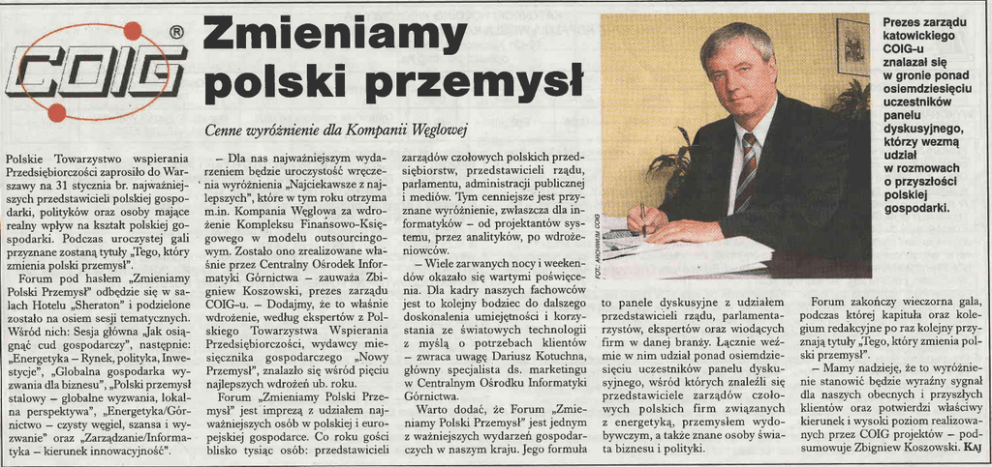 fmieniamy polski przemysł CennewyrÓżnieniedla Kompanii Węglowej wyda. Polskie Towarzystwo wspierania - Dla nas najważniejsz1łrn rzeniem będzie uroczystośćwręczePrzedsiębiorczościzaprosiło do War. Szawy ną 31 stycznia br. najważniej- nia wyrożnienia ,,Najciekawszez najszych przedstawicieli polskiej gospo- lepszych", ktoie w tym roku otrzyma darki, politykow oraz osoby mające m.in. Kompania Węglowa za wdrorealny wpĘ'w na ksztah polskiej go- żenie Kompleksu Finansowo-Księspodarki. Podczas uroczystej gali gowego w modelu outsourcingowym. Zostało ono zrealizowane właprzpnane zostaną t}tuły,,Tego,ktÓry śnieprzez Centralny ośrodek Inforzmienia polski przemysł''. matyki GÓrnictwa - zalważa ZbiForum pod hasłem ,,Zmieriamy Polski Przemysł', odbędzie się w sa- gniew Koszowski, prezes zarządu lach Hotelu ,,Sheraton" i podzielone CoIG-u. - Dodajmy, że to właśnie zostalo na osiem sesji tematycznych. wdrożenie, wedfug ekspertÓw z Polosią- skiego Towarzystwa Wspierania WśrÓd nich: Sesja głowna 'Jak gnąc cud gospodarczy'', następnie: Przedsiębiorczości, wydawcy mie,,Energetyka- Rynek, polityka, Inwe- sięcznika gospodarczego "Nowy stycje",,,Globalna gospodarka wy- Przemysł'', zta|az|o się wśrÓd pięciu zw ania dIabiznesu'',,,Polski przemysł najlepszych wdrożen ub' roku. Forum ,,Zmieniamy Polski Przestalowy - globalne wyzwania, lokalna perspektyvra",,,Energetyka/Gor- mysł'' jest-imprezą z udziatem najważniejszych osob w polskiej i euro. nictwo _ czysty węgiel, szansa 1 wypejskiej gospodarce. Co roku gości zwarie', oraz,,ZarządzanieAnformablisko tysiąc osÓb: przedstawicieli tyka - kierunek innowaryjność". \/ zarząd\w czołowych polskich przedsiębiorstw, przedstawicieli rządu, parlamentu, administracji publicznej i mediÓw. Tym cenniejsze jest przyznane wrożnienie, zw|aszcza dla informatyk w - od projektantow sys- Ó Ś *m'.*tPsry tem!, przez analitykow, po wdroże- ś. F -&.* niowcÓw t-",-', - Wiele zarwanych nocy i weekendow okazało się wartymi poświęcenia. Dla kadry naszych fachowcÓw jest to kolejny bodziec do dalszego to panele dyskusyjne z ldziaŁem przedstawicie|i rządu, parlamentadoskonalenia umiejętności i korzyrzystow, ekspertÓw oraz wiodących stania ze światowych technologii firm w danej branży. Łącznie weżz myśIą o potrzebach klientÓw _ zwraca uwagę Dariusz Kotuchna, mie w nim udziałponad osiemdziesięciu uczestnikÓw panelu dyskugłÓwny specjalista ds. marketingu syjnego, wśrÓd ktÓrych znaleź|i się w Centralnym ośrodku Informatyki przedstawiciele zarządow czo|oGÓrnictwa. Warto dodać, że Forum ,,Zmie- wych polskich firm zutiązanych z energetyką, przemysłem wydoniamy Polski Przemysł'l jest jednym bywczym, atakżeznane osoby świaz ważniejszych wydarze gospodarczych w naszym kraju. }ego formuła ta biznesu i politvki. Prezes zalządu katowickiego COIG-u zna|azałsię w gronie ponad osiemdziesięciu uczestnikÓw panelu dyskusyjnego, ktÓrzy wezmą udział w tozmowach o przyszłości polskiei gospodarki, Forum zakoirczy wieczorna gala, podczas ktÓrej kapituła oraz koIegium redakcyjne po raz kolejny przyzlajątfiĘ,,Tego, ktory zmienia polski przemysł''. - Mamy nadzieję, i,e to wr,6znienie stanowić będzie wylraźnysygnał dla naszych obecnych i przyszĘch klientow oraz potwierdzi właściwy kierunek i wysoki poziom realizowanych przez COIG projektow - podsumowuje Zbigniew Koszowski. Kł;