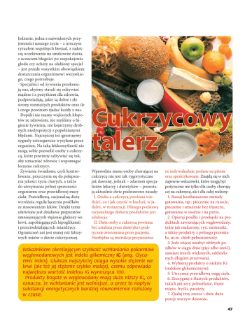 Jedzenie, jedna z największych przyjemności naszego życia – z uroczym rytuałem wspólnych biesiad, z radością oczekiwania na smakowite dania, z uczuciem błogości po zaspokojeniu głodu czy ochoty na ulubiony specjał – jest przede wszystkim obowiązkiem dostarczania organizmowi wszystkiego, czego potrzebuje. Specjaliści od żywienia przekonują nas, abyśmy starali się odżywiać mądrze i z pożytkiem dla zdrowia, podpowiadają, jakie są dobre i złe strony rozmaitych produktów oraz ile i czego powinien zjadać każdy z nas. Dopóki nie mamy większych kłopotów ze zdrowiem, nie myślimy o higienie żywienia, nie kojarzymy drobnych niedyspozycji z popełnianymi błędami. Najczęściej też ignorujemy sygnały ostrzegawcze wysyłane przez organizm. Na taką lekkomyślność nie mogą sobie pozwolić osoby z cukrzycą, które powinny odżywiać się tak, aby umacniać zdrowie i wspomagać leczenie cukrzycy. Żywienie świadome, czyli kontrolowane, przyczynia się do polepszenia jakości życia chorych, a także do utrzymania pełnej sprawności organizmu oraz prawidłowej masy ciała. Prawidłową, racjonalną dietę wyróżnia reguła łączenia posiłków ze stosowaniem leków. Dzięki temu ułatwione jest działanie preparatów zmniejszających stężenie glukozy we krwi, zapobiegających hipoglikemii i przeciwdziałających miażdżycy. Ograniczeń zaś jest mniej niż fałszywych mitów o diecie cukrzycowej. Cukrzycowy talerz Wprawdzie menu osoby chorującej na cukrzycę nie jest tak rygorystyczne jak dawniej, jednak – zdaniem specjalistów lekarzy i dietetyków – pozostają aktualnie dwie podstawowe zasady: I. Osoba z cukrzycą powinna wiedzieć, co i jak czynić w kuchni, w jadalni, w restauracji. Dlatego podstawą racjonalnego doboru produktów jest edukacja. II. Dieta osoby z cukrzycą powinna być ustalona przez dietetyka i praktycznie zrozumiana przez pacjenta. Niezbędne są instrukcje przystosowa- Wskaźnikiem określającym szybkość wchłaniania pokarmów węglowodanowych jest indeks gilkemiczny IG (ang. Glycaemic index). Glukoza najszybciej osiąga wysokie stężenie we krwi (ale też jej stężenie szybko maleje), czemu odpowiada największa wartość indeksu IG wynosząca 100. Produkty bogate w węglowodany mają dużo niższy IG, co oznacza, że wchłanianie jest wolniejsze, a przez to napływ substancji energetycznych bardziej równomiernie rozłożony w czasie. ne indywidualnie, podane na piśmie oraz spraktykowane. Znajdą się w nich zapewne wskazówki, które mogą być pożyteczne nie tylko dla osoby chorującej na cukrzycę, ale i dla całej rodziny: 1. Stosuj beztłuszczowe metody gotowania, np.: pieczenie na ruszcie, pieczenie i smażenie bez tłuszczu, gotowanie w wodzie i na parze. 2. Opieraj posiłki i przekąski na produktach zawierających węglowodany, takie jak makarony, ryż, ziemniaki, a także produkty z pełnego przemiału, m.in. chleb pełnoziarnisty. 3. Jedz więcej niezbyt obfitych posiłków w ciągu dnia (pięć albo sześć), zamiast trzech większych, oddzielonych długimi przerwami. 4. Wybieraj produkty o niskim IG (indeksie glikemicznym). 5. Utrzymuj prawidłową wagę ciała. 6. Zrezygnuj z tłustych produktów, takich jak sery pełnotłuste, tłuste mięso, frytki, pasztety. 7. Zjadaj trzy owoce i dwie duże porcje warzyw dziennie. 47 8. Zamień pokarmy o wysokiej zawartości cukru na ich niskocukrowe odpowiedniki. 9. Nie używaj za dużo soli (podwyższa ciśnienie krwi). 10. Jadaj więcej ryb; raz w tygodniu zjedz tłustą rybę. 11. Włącz do jadłospisu fasolę, groszek i soczewicę, które mogą zastąpić danie mięsne. Jedz tylko chude mięso. 12. Pamiętaj, że warzywa powinny być podstawą posiłków, a nie dodatkiem do nich. Lekkie przekąski powinny być sporządzane z surowych, krojonych warzyw. Warto mieć w lodówce owoce i warzywne przysmaki, które można sobie pogryzać, gdy poczujesz głód. Irena Lus Regularne jedzenie orzechów – bez soli – może zmniejszyć ryzyko ataku serca o 30-50 procent, ponieważ orzechy zawierają: – tłuszcze nienasycone, – witaminę E, która jest przeciwutleniaczem, – argininę, z której otrzymuje się tlenek azotowy, chroniący mięsień serca. Produkty bogate w węglowodany, takie jak: czerwona fasola, ciecierzyca, soczewica, jabłka suszone, morele, brzoskwinie, melony, owies, jogurty, orzechy, awokado, szpinak, cukinia zapewniają poczucie sytości przez dłuższy czas, jednocześnie gwarantują odpowiedni poziom cukru we krwi. Są one bardzo powoli trawione i wchłaniane. Ponadto wiele z nich jest dodatkowo bogatym źródłem błonnika, co korzystnie wpływa na procesy trawienia. 48 W utrzymaniu stałego poziomu glukozy może pomóc takie danie jak makaron z fasolą, papryką, oliwkami i bazylią. Węglowodany zawarte w makaronie przyswajane są powoli, fasola dostarcza rozpuszczalnego błonnika, niezbędnego do stopniowego uwalniania energii, a papryka jest źródłem witaminy C. Jest to klasyczne danie włoskie. Podaje się je z sałatką pokropioną oliwą i sokiem z cytryny. Składniki (na 4 porcje): – 350 g makaronu muszelki – łyżka oliwy z oliwek – 2 ząbki czosnku, zmiażdżone – duża cebula, drobno pokrojona – zielona papryka, pokrojona w kostkę – 425g czerwonej fasoli z puszki (bez cukru i soli), odsączonej – 2 łyżeczki suszonego oregano – 15 g listków bazylii – 100 g czarnych oliwek bez pestek – sól i pieprz Przyrządzanie: Ugotować makaron w lekko osolonej wodzie. W tym czasie rozgrzać na dużej patelni oliwę. Dodać czosnek, cebulę, zieloną paprykę. Smażyć 5-7 minut, aż zmiękną. Dodać fasolę, oregano, kawałki listków bazylii i oliwki; podgrzewać, mieszając, przez kilka minut. Dodać ugotowany makaron, zamieszać delikatnie, doprawić solą i pieprzem. Podawać na gorąco, przybrać połówkami pomidorów i listkami bazylii. Porcja tego dania ma wartość odżywczą 480 kalorii, zawiera: 89 g wę