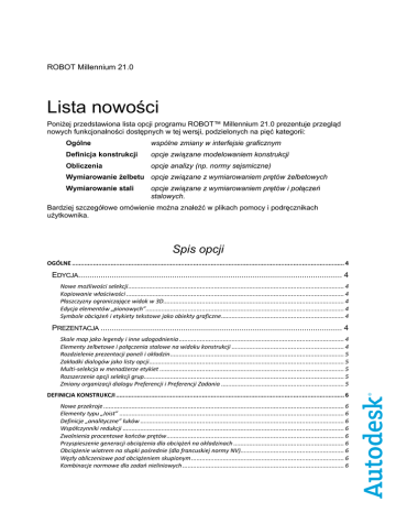 ROBOT Millennium 21.0 Lista nowości Poniżej przedstawiona lista opcji programu ROBOT™ Millennium 21.0 prezentuje przegląd nowych funkcjonalności dostępnych w tej wersji, podzielonych na pięć kategorii: Ogólne wspólne zmiany w interfejsie graficznym Definicja konstrukcji opcje związane modelowaniem konstrukcji Obliczenia opcje analizy (np. normy sejsmiczne) Wymiarowanie żelbetu opcje związane z wymiarowaniem prętów żelbetowych Wymiarowanie stali opcje związane z wymiarowaniem prętów i połączeń stalowych. Bardziej szczegółowe omówienie można znaleźć w plikach pomocy i podręcznikach użytkownika. Spis opcji OGÓLNE ........................................................................................................................................................... 4 EDYCJA...................................................................................................................... 4 Nowe możliwości selekcji........................................................................................................................... 4 Kopiowanie właściwości ............................................................................................................................ 4 Płaszczyzny ograniczające widok w 3D....................................................................................................... 4 Edycja elementów „pionowych”................................................................................................................. 4 Symbole obciążeń i etykiety tekstowe jako obiekty graficzne...................................................................... 4 PREZENTACJA ............................................................................................................ 4 Skale map jako legendy i inne udogodnienia .............................................................................................. 4 Elementy żelbetowe i połączenia stalowe na widoku konstrukcji ................................................................ 4 Rozdzielenie prezentacji paneli i okładzin................................................................................................... 5 Zakładki dialogów jako listy opcji............................................................................................................... 5 Multi-selekcja w menadżerze etykiet ......................................................................................................... 5 Rozszerzenie opcji selekcji grup.................................................................................................................. 5 Zmiany organizacji dialogu Preferencji i Preferencji Zadania ...................................................................... 5 DEFINICJA KONSTRUKCJI .................................................................................................................................. 6 Nowe przekroje ......................................................................................................................................... 6 Elementy typu „Joist” ................................................................................................................................ 6 Definicje „analityczne” łuków .................................................................................................................... 6 Współczynniki redukcji .............................................................................................................................. 6 Zwolnienia procentowe końców prętów..................................................................................................... 6 Przyspieszenie generacji obciążenia dla obciążeń na okładzinach ............................................................... 6 Obciążenie wiatrem na słupki pośrednie (dla francuskiej normy NV)........................................................... 6 Węzły obliczeniowe pod obciążeniem skupionym ....................................................................................... 6 Kombinacje normowe dla zadań nieliniowych ............................................................................................ 6 ROBOT Millennium 21.0 – lista nowości Obciążenia okładzin................................................................................................................................... 7 OBLICZENIA...................................................................................................................................................... 7 Redukcja rozmiaru wyników dla analizy sejsmicznej................................................................................... 7 Analiza sejsmiczna – zapis wyników dla kombinacji.................................................................................... 7 Analiza sejsmiczna – generacja kombinacji Newmarka .............................................................................. 7 Analiza sejsmiczna – nowe normy.............................................................................................................. 7 Tłumienie w Analizie Czasowej (Całkowaniu Równań Ruchu)...................................................................... 7 Obliczenia jako osobna aplikacja ............................................................................................................... 7 Przyspieszenie w prezentacji wyników map (buforowanie) ......................................................................... 7 WYMIAROWANIE ŻELBETU............................................................................................................................... 8 EDYCJA/DEFINICJA...................................................................................................... 8 Nowy viewer graficzny modułu belek i słupów ........................................................................................... 8 Inspektor...