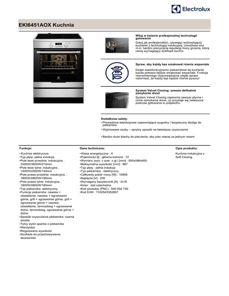 EKI6451AOX Kuchnia Witaj w świecie profesjonalnej technologii gotowania Gotuj jak profesjonaliści, używając wolnostojącej kuchenki z technologią indukcyjną. Umożliwia ona m.in. bardzo precyzyjną regulację mocy grzania, którą cenią wymagający szefowie kuchni. Spraw, aby każdy kęs smakował równie wspaniale Dzięki wielofunkcyjnemu piekarnikowi tej kuchenki każda potrawa będzie smakować wspaniale. Funkcja równomiernego rozprowadzania ciepła sprawi natomiast, że każdy kęs będzie równie pyszny! System Velvet Closing: zawsze delikatnie zamykanie drzwi System Velvet Closing zapewnia zawsze płynne i ciche zamykanie drzwi, co przydaje się zwłaszcza podczas gotowania w pośpiechu. Dodatkowe zalety: • Prowadnice teleskopowe zapewniające wygodny i bezpieczny dostęp do piekarnika • Wyjmowane szyby – sprytny sposób na łatwiejsze czyszczenie • Bardzo duże blachy do pieczenia, aby piec więcej za jednym razem Funkcje: Dane techniczne: Opis produktu: • Kuchnia elektryczna •Typ płyty: pełna indukcja •Pole lewe przednie: indukcyjna , 2300W/3600W/210mm •Pole lewe tylne: indukcyjna , 1400W/2500W/140mm •Pole prawe przednie: indukcyjna , 1800W/2800W/180mm •Pole prawe tylne: indukcyjna , 1800W/2800W/180mm •Typ piekarnika: elektryczny •Funkcje piekarnika: nawiew + oświetlenie, nawiew + ogrzewanie górne, grill + ogrzewanie górne, grill + ogrzewanie górne + nawiew, oświetlenie, termoobieg + ogrzewanie dolne, termoobieg, ogrzewanie górne + dolne •Sposób czyszczenia piekarnika: czarna emalia •Tylny wylot oparów z piekarnika •Wentylator •Regulowana wysokość •Szuflada do przechowywania akcesoriów • Klasa energetyczna : A •Pojemność [l] - główna komora : 72 •Wymiary (wys. x szer. x gł.) [mm] : 850x596x600 •Maksymalna wysokość [mm] : 867 •Typ płyty : pełna indukcja •Typ piekarnika : elektryczny •Całkowity pobór mocy [W] : 10900 •Napięcie [V] : 230 •Wymagany bezpiecznik [A] : 3x16 •Kolor : stal szlachetna •Kod produktu (PNC) : 940 002 740 •Kod EAN : 7332543352807 Kuchnia indukcyjna z Soft Closing.