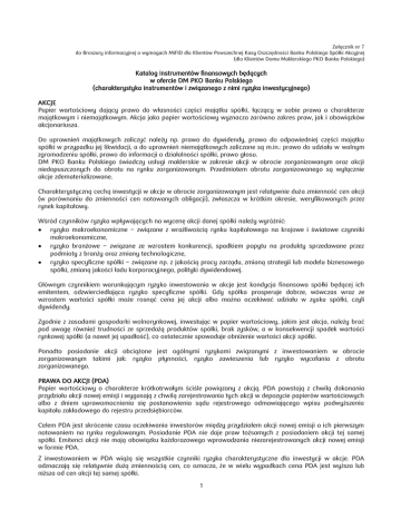 Załącznik nr 7 do Broszury informacyjnej o wymogach MiFID dla Klientów Powszechnej Kasy Oszczędności Banku Polskiego Spółki Akcyjnej (dla Klientów Domu Maklerskiego PKO Banku Polskiego) Katalog instrumentów finansowych będących w ofercie DM PKO Banku Polskiego (charakterystyka instrumentów i związanego z nimi ryzyka inwestycyjnego) AKCJE Papier wartościowy dający prawo do własności części majątku spółki, łączący w sobie prawa o charakterze majątkowym i niemajątkowym. Akcja jako papier wartościowy wyznacza zarówno zakres praw, jak i obowiązków akcjonariusza. Do uprawnień majątkowych zaliczyć należy np. prawo do dywidendy, prawo do odpowiedniej części majątku spółki w przypadku jej likwidacji, a do uprawnień niemajątkowych zaliczane są m.in.: prawo do udziału w walnym zgromadzeniu spółki, prawo do informacji o działalności spółki, prawo głosu. DM PKO Banku Polskiego świadczy usługi maklerskie w zakresie akcji w obrocie zorganizowanym oraz akcji niedopuszczonych do obrotu na rynku zorganizowanym. Przedmiotem obrotu zorganizowanego są wyłącznie akcje zdematerializowane. Charakterystyczną cechą inwestycji w akcje w obrocie zorganizowanym jest relatywnie duża zmienność cen akcji (w porównaniu do zmienności cen notowanych obligacji), zwłaszcza w krótkim okresie, weryfikowanych przez rynek kapitałowy. Wśród czynników ryzyka wpływających na wycenę akcji danej spółki należy wyróżnić: ryzyko makroekonomiczne – związane z wrażliwością rynku kapitałowego na krajowe i światowe czynniki makroekonomiczne, ryzyko branżowe – związane ze wzrostem konkurencji, spadkiem popytu na produkty sprzedawane przez podmioty z branży oraz zmiany technologiczne, ryzyko specyficzne spółki – związane np. z jakością pracy zarządu, zmianą strategii lub modelu biznesowego spółki, zmianą jakości ładu korporacyjnego, polityki dywidendowej. Głównym czynnikiem warunkującym ryzyko inwestowania w akcje jest kondycja finansowa spółki będącej ich emitentem, odzwierciedlająca ryzyko specyficzne spółki. Gdy spółka prosperuje dobrze, wówczas wraz ze wzrostem wartości spółki może rosnąć cena jej akcji albo można oczekiwać udziału w zysku spółki, czyli dywidendy. Zgodnie z zasadami gospodarki wolnorynkowej, inwestując w papier wartościowy, jakim jest akcja, należy brać pod uwagę również trudności ze sprzedażą produktów spółki, brak zysków, a w konsekwencji spadek wartości rynkowej spółki (a nawet jej upadłość), co ostatecznie spowoduje obniżenie wartości akcji spółki. Ponadto posiadanie akcji obciążone jest ogólnymi ryzykami związanymi z inwestowaniem w obrocie zorganizowanym takimi jak: ryzyko płynności, ryzyko zawieszenia lub ryzyko wycofania z obrotu zorganizowanego. PRAWA DO AKCJI (PDA) Papier wartościowy o charakterze krótkotrwałym ściśle powiązany z akcją. PDA powstają z chwilą dokonania przydziału akcji nowej emisji i wygasają z chwilą zarejestrowania tych akcji w depozycie papierów wartościowych albo z dniem uprawomocnienia się postanowienia sądu rejestrowego odmawiającego wpisu podwyższenia kapitału zakładowego do rejestru przedsiębiorców. Celem PDA jest skrócenie czasu oczekiwania inwestorów między przydziałem akcji nowej emisji a ich pierwszym notowaniem na rynku regulowanym. Posiadanie PDA nie daje praw tożsamych z posiadaniem akcji tej samej spółki. Emitenci akcji nie mają obowiązku każdorazowego wprowadzania niezarejestrowanych akcji nowej emisji w formie PDA. Z inwestowaniem w PDA wiążą się wszystkie czynniki ryzyka charakterystyczne dla inwestycji w akcje. PDA odznaczają się relatywnie dużą zmiennością cen, co oznacza, że w wielu wypadkach cena PDA jest wyższa lub niższa od cen akcji tej samej spółki. 1 PRAWO POBORU Prawo poboru jest papierem wartościowym ściśle związanym z planowaną emisją nowych akcji przez spółkę. Uprawnia dotychczasowych akcjonariuszy spółki do nabycia (pierwokupu) akcji nowej emisji, co przysługuje dotychczasowym akcjonariuszom spółki proporcjonalnie w stosunku do liczby już posiadanych akcji. Ważną cechą prawa poboru jest to, że może być ono przedmiotem obrotu jako samodzielny papier wartościowy. Korzystając z prawa poboru, akcjonariusze mogą zachować akcjonariat danej spółki w niezmienionym stanie, co oznacza zachowanie procentowego udziału dotychczasowych akcjonariuszy w stosunku do całkowitej sumy kapitału akcyjnego. Dotychczasowi akcjonariusze niezainteresowani objęciem akcji nowej emisji mogą sprzedać prawo poboru w obrocie zorganizowanym. Konsekwencją tego jest możliwość zakupu praw poboru przez inwestorów dotychczas niebędących akcjonariuszami danej spółki. Z inwestowaniem w prawa poboru wiążą się wszystkie czynniki ryzyka charakterystyczne dla inwestycji w akcje. Z uwagi na fakt, że główną cechą tego instrumentu finansowego jest krótki czas funkcjonowania w obrocie zorganizowanym, dotychczasowy akcjonariusz w celu wykorzystania uprawnień wynikających z przyznanych mu praw poboru powinien złożyć właściwy zapis na akcje nowej emisji z wykorzystaniem praw poboru lub sprzedać je najpóźniej w ostatnim dniu notowań praw poboru, w przeciwnym bowiem wypadku nie otrzyma żadnej zapłaty w momencie ich wygaśnięcia. KONTRAKTY TERMINOWE Kontrakty terminowe to rodzaj umowy zawartej między dwiema stronami, z których jedna zobowiązuje się do kupna, a druga do sprzedaży w określonym czasie, po ustalonej cenie, określonej ilości instrumentu bazowego lub dokonania równoważnego rozliczenia pieniężnego. Instrumentami bazowymi dla kontraktów mogą być między innymi: indeksy giełdowe, waluty, akcje spółek oraz obligacje. Istotą tego instrumentu finansowego jest zobowiązanie do dostawy lub odbioru w przyszłości określonego instrumentu bazowego. Niemniej jednak wskazać należy, że w przypadku większości kontraktów termin