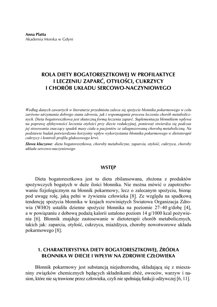 Anna Platta Akademia Morska w Gdyni ROLA DIETY BOGATORESZTKOWEJ W PROFILAKTYCE I LECZENIU ZAPARĆ, OTYŁOŚCI, CUKRZYCY I CHORÓB UKŁADU SERCOWO-NACZYNIOWEGO Według danych zawartych w literaturze przedmiotu zaleca się spożycie błonnika pokarmowego w celu zarówno utrzymania dobrego stanu zdrowia, jak i wspomagania procesu leczenia chorób metabolicznych. Dieta bogatoresztkowa jest skuteczną formą leczenia zaparć. Suplementacja błonnikiem wpływa na poprawę efektywności leczenia otyłości przy diecie redukcyjnej, ponieważ stwierdza się podczas jej stosowania znaczący spadek masy ciała u pacjentów ze zdiagnozowaną chorobą metaboliczną. Na podstawie badań potwierdzono korzystny wpływ wykorzystania błonnika pokarmowego w dietoterapii cukrzycy i kontroli profilu glukozowego krwi. Słowa kluczowe: dieta bogatoresztkowa, choroby metaboliczne, zaparcia, otyłość, cukrzyca, choroby układu sercowo-naczyniowego WSTĘP Dieta bogatoresztkowa jest to dieta zbilansowana, złożona z produktów spożywczych bogatych w duże ilości błonnika. Nie można mówić o zapotrzebowaniu fizjologicznym na błonnik pokarmowy, lecz o zalecanym spożyciu, biorąc pod uwagę rolę, jaką pełni w żywieniu człowieka [8]. Ze względu na spadkową tendencję spożycia błonnika w krajach rozwiniętych Światowa Organizacja Zdrowia (WHO) ustaliła dzienne spożycie błonnika na poziomie 27–40 g/dobę [4], a w powiązaniu z dobową podażą kalorii ustalono poziom 14 g/1000 kcal pożywienia [6]. Błonnik znajduje zastosowanie w dietoterapii chorób metabolicznych, takich jak: zaparcia, otyłość, cukrzyca, miażdżyca, choroby nowotworowe układu pokarmowego [8]. 1. CHARAKTERYSTYKA DIETY BOGATORESZTKOWEJ, ŹRÓDŁA BŁONNIKA W DIECIE I WPŁYW NA ZDROWIE CZŁOWIEKA Błonnik pokarmowy jest substancją niejednorodną, składającą się z mieszaniny związków chemicznych będących składnikami zbóż, owoców, warzyw i nasion, które nie są trawione przez człowieka, czyli nie spełniają funkcji odżywczej [6, 11]. A. Platta, Rola diety bogatoresztkowej w profilaktyce i leczeniu zaparć, otyłości... 155 Błonnik dzieli się na frakcję rozpuszczalną i nierozpuszczalną w wodzie. W skład frakcji rozpuszczalnej w wodzie wchodzą pektyny, gumy, śluzy, betaglukan oraz inulina (tab. 1), które wpływają na spowolnienie pasażu treści pokarmowej przez jelita [6, 8]. Pektyny obniżają poposiłkowe stężenie glukozy, obniżają stężenie cholesterolu oraz zwiększają wydalanie kwasów żółciowych. Gumy obniżają stężenie cholesterolu ogółem, wpływają także na spadek triglicerydów, stężenie glukozy na czczo i po posiłku. Inulina wykazuje właściwości frakcji rozpuszczalnej i nierozpuszczalnej błonnika. Głównym źródłem błonnika rozpuszczalnego są: otręby owsiane, suszona fasola, brązowy ryż, jęczmień, owoce cytrusowe, truskawki, jabłka. Drugą frakcję stanowi błonnik nierozpuszczalny w wodzie, który zawiera celulozę, hemicelulozy, ligniny oraz skrobię oporną. Wpływają one na perystaltykę jelit, przyspieszając ją, oraz na zwiększenie masy stolca. Nie wykazują wpływu na poziomy lipidów czy glukozy. Głównym źródłem błonnika nierozpuszczalnego są: otręby pszenne, mąka z pełnego przemiału, fasola i groch, kukurydza, nasiona roślin, całe ziarna, warzywa kapustne, warzywa korzeniowe i orzechy. Istnieje także podział błonnika na frakcję o zwiększonej lepkości oraz o zmniejszonej zdolności do fermentacji. Ta pierwsza ma wpływ na poziom glukozy oraz cholesterolu we krwi i odpowiada frakcji rozpuszczalnego w wodzie błonnika, natomiast druga odpowiada za objętość i konsystencję stolca, regulując tym rytm wypróżnień, i odpowiada błonnikowi nierozpuszczalnemu [6, 8] (tab. 2). Tabela 1. Podział i charakterystyka błonnika (na podst. [17]) Table 1. Types and characteristics of the fiber (based on [17]) Błonnik rozpuszczalny w wodzie pektyny gumy śluzy betaglukan inulina Błonnik nierozpuszczalny w wodzie Skład • • • • • Rola Spowalnia pasaż jelitowy Przyspiesza pasaż jelitowy Źródła • • • • • • • • • • • • • • • • otręby owsiane jęczmień brązowy ryż owoce cytrusowe truskawki jabłka ziemniaki suszona fasola • • • • celulozy ligniny hemicelulozy skrobia oporna otręby pszenne mąka z pełnego przemiału fasola i groch kukurydza nasiona roślin, całe ziarna orzechy warzywa kapustne warzywa korzeniowe Źródłem błonnika są głównie produkty zbożowe z niskiego przemiału zbóż, takie jak: mąki o wysokim typie (np. graham typ 1850), wytworzone z nich 156 ZESZYTY NAUKOWE AKADEMII MORSKIEJ W GDYNI, nr 86, grudzień 2014 pieczywo oraz płatki wielozbożowe. Pumpernikiel zawiera 6,4 g błonnika/100 g produktu, ryż brązowy aż 8,7 g, a ryż biały tylko 2,4 g [11]. Drugim bardzo dobrym źródłem błonnika są owoce i warzywa. Powinny być one spożywane w ilości 5 porcji/dzień, np. maliny i porzeczki zawierają od 7–8 g błonnika/100 g produktu, a surowa marchew 3 g/100 g produktu. Zaleca się konsumpcję między posiłkami ziaren i nasion roślin zamiast słodyczy, np. nasion słonecznika (6 g błonnika/100 g), pestek dyni (5,3 g błonnika/100 g) oraz suszonych owoców, takich jak figi (12,9 g błonnika/100 g) czy morele (10,3 g błonnika/100 g). Warto zwrócić uwagę na siemię lniane, które jest bardzo dobrym źródłem błonnika na poziomie 27,3 g/100 g produktu. Zaleca się jego spożycie w ciągu dnia w dietoterapii zaparć czy otyłości, w postaci surowej lub zalanej ciepłą wodą [14] (tab. 3). Tabela 2. Wpływ poszczególnych frakcji błonnika na organizm człowieka (na podst. [6]) Table 2. The effect of individual fiber fractions on the human body (based on [6]) Wpływ na organizm człowieka Frakcje błonnika na perystaltykę Pektyny Gumy Betaglukan na poziom glukozy na poziom lipidów inny wpływ – obniżenie poposiłkowego stężenia glukozy ob