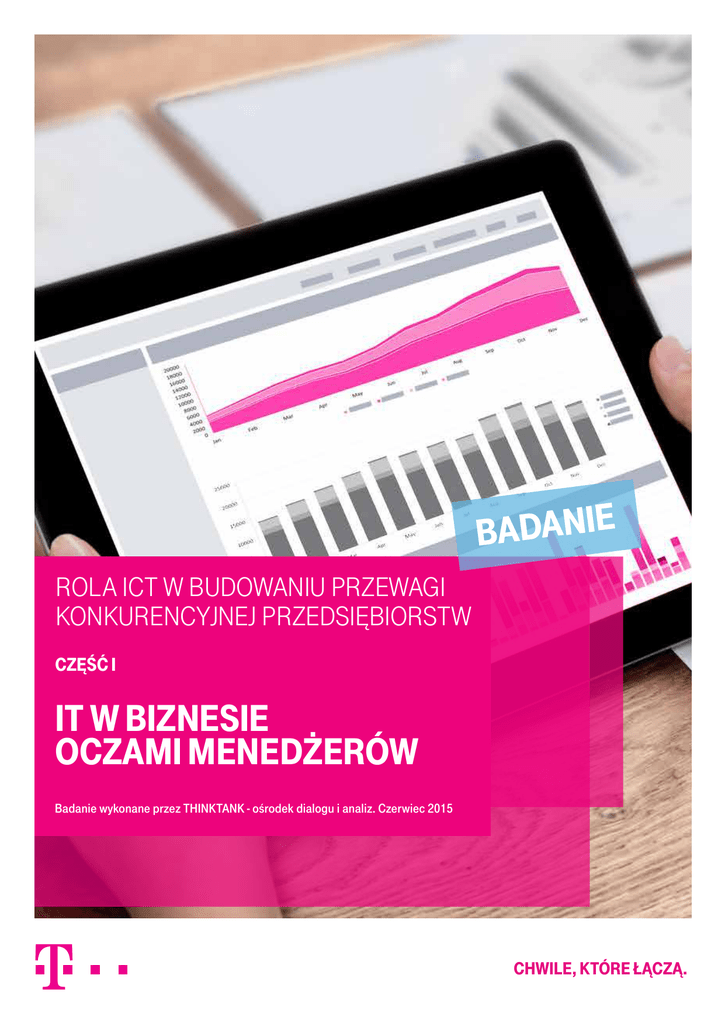 BADANIE ROLA ICT W BUDOWANIU PRZEWAGI KONKURENCYJNEJ PRZEDSIĘBIORSTW CZĘŚĆ I IT W BIZNESIE OCZAMI MENEDŻERÓW Badanie wykonane przez THINKTANK - ośrodek dialogu i analiz. Czerwiec 2015 CHWILE, KTÓRE ŁĄCZĄ. IT w biznesie oczami menedżerów Zdecydowana większość liderów dużych organizacji w Polsce nie ma wątpliwości - informatyzacja sprzyja budowaniu przewag konkurencyjnych. Takiego zdania jest 81% z nich. Główne trendy obejmują wszystkie obszary, których celem jest usprawnienie działania całej organizacji, w tym wewnętrznej komunikacji czy wirtualizacji zasobów i sprawnego do nich dostępu. Z przeprowadzonych przez T-Mobile1 badań wśród liderów i menedżerów dużych firm w Polsce, wynika, że rośnie świadomość co do tego, że IT wspiera cały biznes, uelastycznia funkcjonowanie organizacji, otwiera na zmienne potrzeby rynku - wnosi nowe podejście do myślenia o inwestycjach. Do kluczowych - ich zdaniem - obszarów budujących przewagę rynkową, należą przede wszystkim: dobry model biznesowy (18% wskazań), jakość produktów i efektywność operacyjna (po 15%). Badania wskazują, że olbrzymia część liderów firm i menedżerów wyższego szczebla, przekonana jest do informatyzacji jako jednego z filarów rozwoju biznesu. Przy czym zdecydowana większość respondentów postrzega informatyzację właśnie jako rozwiązanie budujące te przewagi. W skali od 1 do 7, najwyższą („7”) notę rozwiązaniom IT w tym właśnie kontekście przyznało 27% badanych, dalsze 28% oceniło na „6” rolę technologii w budowaniu przewag konkurencyjnych, a kolejne 26% - na „5”. Potwierdzają to również opinie wyrażane podczas wywiadów jakościowych2. „Informatyzacja jest narzędziem do sprawnego przepływu informacji i analiz oraz podejmowania bardziej trafnych decyzji” - mówi Marcin Ochnik, członek zarządu firmy Ochnik. A Rafał Worek, dyrektor produkcji w firmie Ponar, dodaje: „W tej chwili w naszej firmie działy planowania, produkcji, zarządzania finansami i HR pracują na osobnych modułach. W przyszłym roku instalujemy nowy, kompleksowy system zarządzania produkcją z modułami finansowymi, księgowości, działu handlowego i sprzedaży. Tak, aby powiązać je automatycznie.” WPŁYW INFORMATYZACJI NA BUDOWANIE PRZEWAGI KONKURENCYJNEJ Badanie zrealizowane przez THINKTANK w maju i czerwcu 2015 r. na zlecenie T-Mobile. Bada-nie ilościowe CATI objęło grupę 350 liderów i menedżerów największych przedsiębiorstw w Polsce. Aby pogłębić wyniki badania zrealizowano dodatkowo 10 wywiadów IDI. 2 Wywiady IDI ramach ww. badania. 1 IT W BIZNESIE OCZAMI MENEDŻERÓW 2 IT, które usprawnia działanie firmy Aż 13% badanych liderów organizacji wskazuje - jako kluczowy element wykorzystania IT - zarządzanie operacyjne firmą. Biorąc pod uwagę fakt, że w tak oczywistych obszarach, jak produkcja i sprzedaż, wskaźniki są niewiele wyższe (odpowiednio: 19 i 17%), warto wziąć tę opinię pod szczególną uwagę. W mocno złożonej i zmiennej rzeczywistości, zarządzający firmą muszą być gotowi do elastycznego i szybkiego reagowania. Nie tylko na ruchy konkurencji, lecz również zmiany o szerszym zakresie - jak ogólna koniunktura albo nowe potrzeby klientów. Jest to niezwykle ważne zarówno w relacjach b2b, jak i b2c. Postęp technologiczny sprawia bowiem, że z jednej strony biznes otrzymuje szereg innowacyjnych narzędzi. Z drugiej zaś, konsumenci pod wpływem technologii i - szerzej - wirtualizacji wielu sfer życia - zmieniają swoje postawy konsumenckie. Oczekują stałego dostosowywania produktów i usług do ich stylu życia (zwłaszcza dotyczy to młodych pokoleń, coraz mocniej obecnych na rynku). Z tej perspektywy, nic dziwnego, że wśród najważniejszych trendów dotyczących informatyzacji, a obejmujących relacje biznesowe, najczęściej wskazywano te obszary, które mają usprawnić całą gamę procesów wewnątrz organizacji, a także - dostęp do klienta czy partnera w biznesie. Na rozwój rozwiązań integrujących pracę przedsiębiorstwa wskazało 13% badanych (tylu co na ERP), podobnie - na integrację własnych z systemów z rozwiązaniami klientów i partnerów (również 13%). Ważne dla przedsiębiorców trendy to także IT wspierające pracę zdalną (11% wskazań), sprzedaż online, jak również wirtualizacja infrastruktury firmy (odpowiednio: 9 i 7%). KLUCZOWE OBSZARY ZMIAN Wnioski i rekomendacje Wspomniane już czynniki rynkowe (ich zmienność i dużo trudniejsza ich przewidywalność), nakazują przedsiębiorcom ostrożniej podchodzić do inwestycji. Oznacza to lokowanie środków własnych wyłącznie w te projekty, które faktycznie przyniosą spodziewane efekty. Zdecydowana większość dużych firm w Polsce finansuje inwestycje w infrastrukturę ze środków własnych (92%, przy 3% wskazań mówiących o wykorzystywaniu na ten cel środków UE). Najczęściej liderzy oczekują oszczędności i optymalizacji wszelkich procesów wewnątrz, racjonalnego gospodarowania zasobami etc. Informatyzacja obejmująca całą strukturę wydaje się w tym kontekście jednym z najpilniejszych celów o strategicznym wymiarze. O ile na ERP stawiano jako jedyny niemal priorytet w minionych latach (kiedy fala informatyzacji się rozpoczęła), dziś nakłady na IT zaczynają być kierowane w kolejne obszary. Są nimi: systemy integrujące wewnętrzne struktury organizacji, narzędzia służące pracy zdalnej czy wirtualizacja zasobów własnych. IT W BIZNESIE OCZAMI MENEDŻERÓW 3 Nowe technologie mogą dziś znacząco wesprzeć zmiany, które zmierzają do uelastycznienia organizacji. Należy je więc traktować jako znaczące inwestycje, które w dłuższej perspektywie czasu - optymalizując całą gamę procesów - przynoszą konkretne korzyści: Oszczędność czasu. Na wielu płaszczyznach narzędzia IT uproszczają procedury wewnątrz firmy, przepływ komunikatów, akceptację, update itd. Łączn