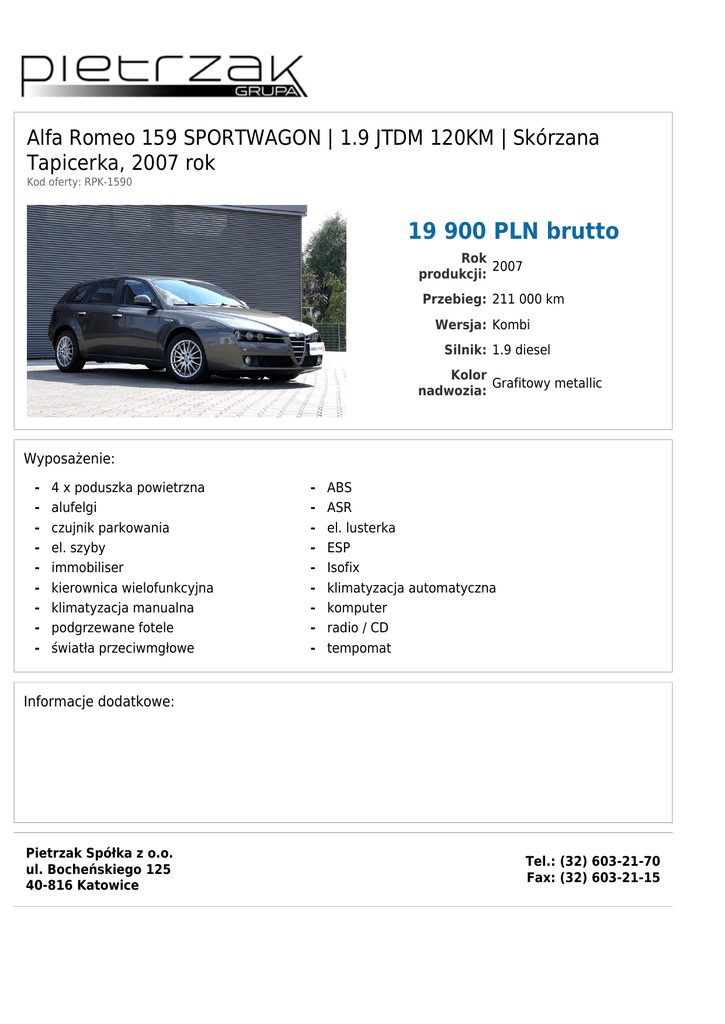 Alfa Romeo 159 SPORTWAGON | 1.9 JTDM 120KM | Skórzana Tapicerka, 2007 rok Kod oferty: RPK-1590 19 900 PLN brutto Rok 2007 produkcji: Przebieg: 211 000 km Wersja: Kombi Silnik: 1.9 diesel Kolor Grafitowy metallic nadwozia: Wyposażenie: - 4 x poduszka powietrzna alufelgi czujnik parkowania el. szyby immobiliser kierownica wielofunkcyjna klimatyzacja manualna podgrzewane fotele światła przeciwmgłowe - ABS ASR el. lusterka ESP Isofix klimatyzacja automatyczna komputer radio / CD tempomat Informacje dodatkowe: Pietrzak Spółka z o.o. ul. Bocheńskiego 125 40-816 Katowice Tel.: (32) 603-21-70 Fax: (32) 603-21-15