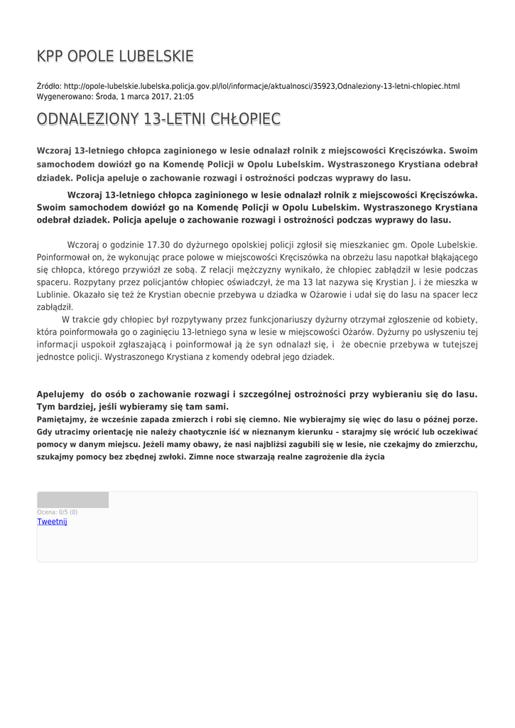 KPP OPOLE LUBELSKIE Źródło: http://opole-lubelskie.lubelska.policja.gov.pl/lol/informacje/aktualnosci/35923,Odnaleziony-13-letni-chlopiec.html Wygenerowano: Środa, 1 marca 2017, 21:05 ODNALEZIONY 13-LETNI CHŁOPIEC Wczoraj 13-letniego chłopca zaginionego w lesie odnalazł rolnik z miejscowości Kręciszówka. Swoim samochodem dowiózł go na Komendę Policji w Opolu Lubelskim. Wystraszonego Krystiana odebrał dziadek. Policja apeluje o zachowanie rozwagi i ostrożności podczas wyprawy do lasu. Wczoraj 13-letniego chłopca zaginionego w lesie odnalazł rolnik z miejscowości Kręciszówka. Swoim samochodem dowiózł go na Komendę Policji w Opolu Lubelskim. Wystraszonego Krystiana odebrał dziadek. Policja apeluje o zachowanie rozwagi i ostrożności podczas wyprawy do lasu. Wczoraj o godzinie 17.30 do dyżurnego opolskiej policji zgłosił się mieszkaniec gm. Opole Lubelskie. Poinformował on, że wykonując prace polowe w miejscowości Kręciszówka na obrzeżu lasu napotkał błąkającego się chłopca, którego przywiózł ze sobą. Z relacji mężczyzny wynikało, że chłopiec zabłądził w lesie podczas spaceru. Rozpytany przez policjantów chłopiec oświadczył, że ma 13 lat nazywa się Krystian J. i że mieszka w Lublinie. Okazało się też że Krystian obecnie przebywa u dziadka w Ożarowie i udał się do lasu na spacer lecz zabłądził. W trakcie gdy chłopiec był rozpytywany przez funkcjonariuszy dyżurny otrzymał zgłoszenie od kobiety, która poinformowała go o zaginięciu 13-letniego syna w lesie w miejscowości Ożarów. Dyżurny po usłyszeniu tej informacji uspokoił zgłaszającą i poinformował ją że syn odnalazł się, i że obecnie przebywa w tutejszej jednostce policji. Wystraszonego Krystiana z komendy odebrał jego dziadek. Apelujemy do osób o zachowanie rozwagi i szczególnej ostrożności przy wybieraniu się do lasu. Tym bardziej, jeśli wybieramy się tam sami. Pamiętajmy, że wcześnie zapada zmierzch i robi się ciemno. Nie wybierajmy się więc do lasu o późnej porze. Gdy utracimy orientację nie należy chaotycznie iść w nieznanym kierunku – starajmy się wrócić lub oczekiwać pomocy w danym miejscu. Jeżeli mamy obawy, że nasi najbliżsi zagubili się w lesie, nie czekajmy do zmierzchu, szukajmy pomocy bez zbędnej zwłoki. Zimne noce stwarzają realne zagrożenie dla życia Ocena: 0/5 (0) Tweetnij