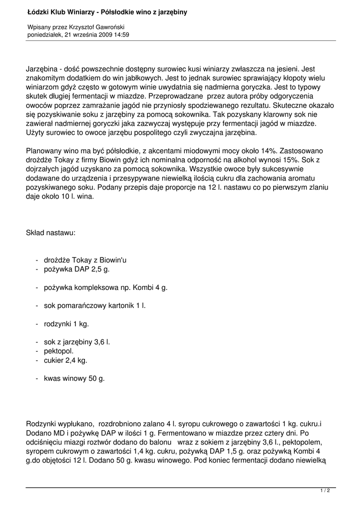 Łódzki Klub Winiarzy - Półsłodkie wino z jarzębiny Wpisany przez Krzysztof Gawroński poniedziałek, 21 września 2009 14:59 Jarzębina - dość powszechnie dostępny surowiec kusi winiarzy zwłaszcza na jesieni. Jest znakomitym dodatkiem do win jabłkowych. Jest to jednak surowiec sprawiający kłopoty wielu winiarzom gdyż często w gotowym winie uwydatnia się nadmierna goryczka. Jest to typowy skutek długiej fermentacji w miazdze. Przeprowadzane przez autora próby odgoryczenia owoców poprzez zamrażanie jagód nie przyniosły spodziewanego rezultatu. Skuteczne okazało się pozyskiwanie soku z jarzębiny za pomocą sokownika. Tak pozyskany klarowny sok nie zawierał nadmiernej goryczki jaka zazwyczaj występuje przy fermentacji jagód w miazdze. Użyty surowiec to owoce jarzębu pospolitego czyli zwyczajna jarzębina. Planowany wino ma być półsłodkie, z akcentami miodowymi mocy około 14%. Zastosowano drożdże Tokay z firmy Biowin gdyż ich nominalna odporność na alkohol wynosi 15%. Sok z dojrzałych jagód uzyskano za pomocą sokownika. Wszystkie owoce były sukcesywnie dodawane do urządzenia i przesypywane niewielką ilością cukru dla zachowania aromatu pozyskiwanego soku. Podany przepis daje proporcje na 12 l. nastawu co po pierwszym zlaniu daje około 10 l. wina. Skład nastawu: - drożdże Tokay z Biowin'u - pożywka DAP 2,5 g. - pożywka kompleksowa np. Kombi 4 g. - sok pomarańczowy kartonik 1 l. - rodzynki 1 kg. - sok z jarzębiny 3,6 l. - pektopol. - cukier 2,4 kg. - kwas winowy 50 g. Rodzynki wypłukano, rozdrobniono zalano 4 l. syropu cukrowego o zawartości 1 kg. cukru.i Dodano MD i pożywkę DAP w ilości 1 g. Fermentowano w miazdze przez cztery dni. Po odciśnięciu miazgi roztwór dodano do balonu wraz z sokiem z jarzębiny 3,6 l., pektopolem, syropem cukrowym o zawartości 1,4 kg. cukru, pożywką DAP 1,5 g. oraz pożywką Kombi 4 g.do objętości 12 l. Dodano 50 g. kwasu winowego. Pod koniec fermentacji dodano niewielką 1/2 Łódzki Klub Winiarzy - Półsłodkie wino z jarzębiny Wpisany przez Krzysztof Gawroński poniedziałek, 21 września 2009 14:59 ilość miodu (cztery łyzki stołowe). Fermentacja trwała około 4 tygodni. Po przerobieniu cukru przez drożdże, wino zlano do mniejszego balonu, siarkowano i dosłodzono do smaku. Autor dosłodził wino dając 60 g. cukru na każdy litr wina. Uzyskane wino jest bardzo delikatne w smaku jak na zastosowany surowiec. Ilość garbników bardzo dobrze wyważona. Posmaki miodowe bardzo dobrze harmonizują z lekką goryczką jarzębiny. Uwagi. MD przygotowano z drożdży płynnych Biowin'u które w nastawach dają silne posmaki miodowe. Drożdże te mają mniejszą odporność na alkohol niż drożdże Tokay innych producentów i są wystarczająco wrażliwe na siarkowanie. MD przygotowano na soku pomarańczowym bez konserwantów.Sok z jarzebiny uzyskuje się łatwo. Jagody należy przesypać niewielką ilością cukru który wliczony jest w wymaganą ilość cukru. pektopol jest niezbędny gdyż sok z jarzębiny ma unieczynnione enzymy pektolityczne. Gotowy nastaw wykazał kwasowość miareczkową 4,5 g/l. więc wymagał dokwaszenia. Zamiast kwasu winowego można dać analogiczną ilość kwasku cytrynowego. 2/2