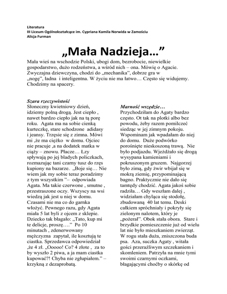 Literatura III Liceum Ogólnokształcące im. Cypriana Kamila Norwida w Zamościu Alicja Furman „Mała Nadzieja…” Mała wieś na wschodzie Polski, ubogi dom, bezrobocie, niewielkie gospodarstwo, dużo rodzeństwa, a wśród nich – ona. Mówię o Agacie. Zwyczajna dziewczyna, chodzi do „mechanika”, dobrze gra w „nogę”, ładna i inteligentna. W życiu nie ma łatwo… Często się widujemy. Chodzimy na spacery. Szara rzeczywistość Słoneczny kwietniowy dzień, idziemy polną drogą. Jest ciepło , nawet bardzo ciepło jak na tą porę roku. Agata ma na sobie cienką kurteczkę, stare schodzone adidasy i jeansy. Trzęsie się z zimna. Mówi mi ,że ma ciężko w domu. Ojciec nie pracuje ,a na dodatek matka w ciąży – znowu. Płacze… Łzy spływają po jej bladych policzkach, rozmazując tani czarny tusz do rzęs kupiony na bazarze. „Boje się… Nie wiem jak my sobie teraz poradzimy z tym wszystkim ”– odpowiada Agata. Ma takie czerwone , smutne , przestraszone oczy. Wszyscy na wsi wiedzą jak jest u niej w domu. Czasami nie ma co do garnka włożyć. Pewnego razu, gdy Agata miała 5 lat byli z ojcem z sklepie. Dziecko tak błagało: „Tato, kup mi te delicje, proszę….” Po 10 minutach , zdenerwowany mężczyzna zapytał, ile kosztują te ciastka. Sprzedawca odpowiedział ,że 4 zł. „Ooooo! Co? 4 złote , za to by wyszło 2 piwa, a ja mam ciastka kupować?! Chyba nie zgłupiałem.” – krzykną z dezaprobatą. Marność wszędzie… Przychodziłam do Agaty bardzo często. Ot tak na plotki albo bez powodu, żeby razem pomilczeć siedząc w jej zimnym pokoju. Wspominam jak wpadałam do niej do domu. Duże podwórko porośnięte nieskoszoną trawą. Nie było podjazdu. Wjeżdżało się drogą wysypana kamieniami i pokruszonym gruzem. Najgorzej było zimą, gdy żwir wbijał się w mokrą ziemię, przypominającą bagno. Praktycznie nie dało się tamtędy chodzić. Agata jakoś sobie radziła… Gdy weszłam dalej , widziałam chyląca się stodołę, zbudowaną 40 lat temu. Deski całkiem spróchniały i pokryły się zielonym nalotem, który je „pożerał”. Obok stała obora. Stare i brzydkie pomieszczenie już od wielu lat nie było mieszkaniem zwierząt. W rogu stała duża, zniszczona buda psa. Aza, suczka Agaty , witała gości przeraźliwym szczekaniem i skomleniem. Patrzyła na mnie tymi swoimi czarnymi oczkami, błagającymi choćby o skórkę od chleba. Była taka chuda. Miała zapadnięte boki, można było zauważyć jej wystające żebra, rysujące się pod skórą. Zwierze było uwiązane na łańcuchu , który wbijał się w szyje i wyrywał sierść. Najgorzej było zimą i jesienią, ponieważ suczka musiała mieszkać w nieocieplonej , starej budzie ze szczurami, a i one się wyprowadziły, gdyż wszędzie było mnóstwo dziur , którymi wpadał śnieg czy deszcz. Sierść Azy była pozlepiana brudem . Nigdy nie czesana pozbijała się w kołtuny , w których przebywały pchły gryzące to biedne zwierze. Czasami ukradkiem dawałam psu resztki przynoszone z mojego domu. Wówczas sunia merdała ogonem i jadła tak szybko , iż bałam się, że jej zaszkodzi lub się udławi. Rodzinę Agaty czasami odwiedzała Opieka Społeczna. Brali zapomogę na dzieci i dary z Caritasu. Zimą dostawali węgiel. Gdyby nie to, dzieciaki marzłyby i chodziłyby głodne . Rodzice Agaty są bezrobotni, z małej ilości pola nie da się utrzymać siedmioosobowej rodziny. Zauważyłam ,że nie robili nawet codziennie zakupów. Jedynie ojciec chodził do sklepu na piwo. Nawet na kilka piw… Dzieci chodziły głodne i takie blade. Chłopcy wdali się w niewłaściwe towarzystwo i zaczęli palić i pić od najmłodszych lat. Oprócz nich w domu mieszkała babka. Kobieta dostawała 800zł renty , z której płaciła rachunki, robiła zakupy , kupowała leki i inne podstawowe produkty. Czasami tylko u niej dzieci mogły znaleźć ciepły obiad… Pracowała ciężko w polu i na podwórku. Była bardzo religijną i miłosierną kobietą. Gdy mama Agaty była za granicą, babcia zajmowała się malutkimi dziećmi , kiedy ojciec był na piwie. Agata ma jeszcze siostrę Paulinę- zaszła w ciążę w wieku 19 lat. Teraz mieszka u swojego chłopaka. Dzięki jej wyprowadzce sytuacja w domu się trochę poprawiła, zawsze mniej osób siadających do obiadu lub potrzebujących nowych butów. W domu mojej przyjaciółki jest trzy pokoje . Duża szara kuchnia . Stoją tam meble , które mają chyba ze 40 lat. W rogu znajduje się niemodny długi stół pomalowany na brązowo. Na podłodze leży zakurzony bordowy dywan. Widać żółty kaflowy piec , na którym babcia gotuje obiady. Gdy jest zimno kobieta w nim pali i wtedy pomieszczenie zalewa przyjemne ciepło i zapach palącego się drewna. Słychać charakterystyczne trzaski żarzących się polan. Czasami siedzimy sobie z Agatą koło tego pieca i pijemy herbatę , marząc o lepszym świecie. Niekiedy chodzimy do pokoju. Niestety dziewczyna nie ma swojego kąta. Musi spać razem z siostrą i bratem. Nie ma swojego biurka ani fotela , w którym mogłaby poczytać książkę. W pokoju stoi kanapa pamiętająca czasy Gomułki, przykryta plecioną kapą w charakterystyczne wzory. Podobna wisi na ścianie. Przy oknie znajduje się mały telewizor „UNIMOR”. W domu Agaty roznosi się charakterystyczny zapach gotującej się zupy lub pieczonego ciasta, Bardzo lubię ten zapach. Stwarza przyjemną, domową atmosferę. To zasługa babci przygotowującej posiłki i palącej w piecu kaflowym… Agata nie przykładała się do nauki. Nawet nie miałaby warunków. Wszędzie krzyczące dzieciaki i brak miejsca na odrobienie lekcji. Dziewczyna chodziła do zawodówki. Miała problemy w nauce , często przychodziła do mnie, żebym jej napisała jakieś wypracowanie albo wytłumaczyła angielski. Raz nawet nie zdała z matematyki. Pomimo to, Agata jest bardzo dobrym sportowcem . Została Wicemistrzynią Polski w biegach na 1000