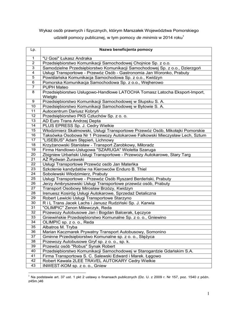 Wykaz osób prawnych i fizycznych, którym Marszałek Województwa Pomorskiego udzielił pomocy publicznej, w tym pomocy de minimis w 2014 roku1 Lp. 1 2 3 4 5 6 7 8 9 10 11 12 13 14 15 16 17 18 19 20 21 22 23 24 25 26 27 28 29 30 31 32 33 34 35 36 37 38 39 40 41 42 43 Nazwa beneficjenta pomocy "U Gosi" Łukasz Andraka Przedsiębiorstwo Komunikacji Samochodowej Chojnice Sp. z o.o. Samodzielne Przedsiębiorstwo Komunikacji Samochodowej Sp. z o.o., Dzierzgoń Usługi Transportowe - Przewóz Osób - Gastronomia Jan Woronko, Prabuty Powiślańska Komunikacja Samochodowa Sp. z o.o., Kwidzyn Pomorska Komunikacja Samochodowa Sp. z o.o., Wejherowo PUPH Mateo Przedsiębiorstwo Usługowo-Handlowe LATOCHA Tomasz Latocha Eksport-Import, Wielgło Przedsiębiorstwo Komunikacji Samochodowej w Słupsku S. A. Przedsiębiorstwo Komunikacji Samochodowej w Bytowie S. A. Autocentrum Dariusz Kobryń Przedsiębiorstwo PKS Człuchów Sp. z o. o. AD Euro Trans Andrzej Depta PLUS EPRESS Sp. J. Cedry Wielkie Włodzimierz Skalmowski, Usługi Transportowe Przewóz Osób, Mikołajki Pomorskie Taksówka Osobowa Nr 1 Przewozy Autokarowe Falkowski Mieczysław Lech, Sztum "LISEBUS" Adam Stępień, Lichnowy Krzyżanowski Stanisław - Transport Zarobkowy, Miłoradz Firma Handlowo-Usługowa "SZARUGA" Wioletta Szaruga Zbigniew Urbański Usługi Transportowe - Przewozy Autokarowe, Stary Targ AŻ Rydwan Żurawski Usługi Transportowe Przewóz osób Jan Mateńka Szkolenie kandydatów na Kierowców Enduro B. Thiel Sobolewski Włodzimierz, Prabuty Usługi Transportowe - Przewóz Osób Ryszard Berdeński, Prabuty Jerzy Ambryszewski Usługi Transportowe przewóz osób, Prabuty Transport Osobowy Mirosław Brzózy, Kwidzyn Irenuesz Kosiróg Usługi Autokarowe, Sprzedaż Detaliczna Robert Lewicki Usługi Transportowe Starzyno R i L Trans Jacek Lachs i Janusz Rudziński Sp. J. Karwia "OLIMPIC" Zenon Milewczyk, Reda Przewozy Autobusowe Jan i Bogdan Balcerak, Łęczyce Gniewińskie Przedsiębiorstwo Komunalne Sp. z o. o., Gniewino OLIMPIC sp. z o. o., Reda Albatros M. Tryba Marian Kaczmarek Prywatny Transport Autobusowy, Somonino Gminne Przedsiębiorstwo Komunalne sp. z o. o., Stężyca Przewozy Autobusowe Gryf sp. z o. o., sp. k. Przewóz osób "Robus" Synak Robert Przedsiębiorstwo Komunikacji Samochodowej w Starogardzie Gdańskim S.A. Firma Transportowa S. C. Salewski Edward i Marek. Łęgowo Robert Kawala 2LEE TRAVEL AUTOKARY Cedry Wielkie INWEST-KOM sp. z o. o., Gniew 1 Na podstawie art. 37 ust. 1 pkt 2 ustawy o finansach publicznych (Dz. U. z 2009 r. Nr 157, poz. 1540 z późn. z45m.)46 1 44 45 46 47 48 49 50 51 52 53 54 55 56 57 58 59 60 61 62 63 64 65 66 67 68 69 70 71 72 73 74 75 76 77 78 79 80 81 82 83 84 85 86 87 88 89 90 91 92 93 94 95 96 Arriva Sp. z o. o. PKS Szczecinek sp. z o. o. PHU BOTRANS Kępice "LAZUR" Sp. z o. o., Poddąbie NORD EXSPRESS Sp z o. o., Dębnica Kaszubska Usługi Przewozowe "RAMZES"- Adrian Radomski "BOGUŚ-BUS Przewóz Osób-Andrzejczak Bogusław Stanisław, Lębork „WIOLKA" Przewóz Osób, Parchowo Usługi Transportowo-Osobowe Jerzy Wójcik, Studzienice PKS Grudziądz Sp. z o. o., Grudziądz SYPION Stanisław, Restauracja "GRYF" Pośrednictwo Ubezpieczeniowe i Usługi Turystyczne Marlena Lipke SCHIENKE Grzegorz "KABER" Zakład Produkcji Wielobranżowej PROWAL M-Bus Mieczysław Łepek Brusy Przedsiębiorstwo Komunikacji Samochodowej w Elblągu Sp. z o. o. Transport Osobowy Autobusowy i Ciężarowy – Kłos Sławomir, Sadlinki Przedsiębiorstwo Komunikacji Samochodowej Gdańsk Sp. z o. o. "EUROTRANS" Przewozy Autobusowe Mirosław Turzyński, Łęczyce Przedsiębiorstwo Handlowo-Usługowe - "OWSIAK" – Wiesław Owsiak, Pelplin Słupskie Przeds. Komunikacji DANAEXPRESS s. c., Danuta i Andrzej Komoś, Słupsk Transport i Handel "GOCHY" Józef Gawin, Lipnica TRAKT M. Błażejewicz Łasin Włodzimierz Siemienuk Gospodarstwo Rolno-Rybackie "Złota Rybka"/ Siemieniuk JASIŃSKI Michał, Krzysztof, Firma Handlowo-Usługowa "KARCZMA PRZYWIDZKA" DWÓR MYSINEK Sp. z o. o. Domowa Spiżarnia Dariusz Labudda/Labudda DEJCOMP USŁUGI Ewa Dudziak Malborski Klaster Turystyczny Maja Magdalena Kościewicz Omega 34 T.A.K. Szweda, E. Hering Sp. J. SZWEDA T.A. K., HERING E. "OMEGA 34" Sp. J. Fundacja "IGOR" KLEWICZ Krzysztof "NIKA" NAGPROT Sp. z o. o. PTAKI POLSKIE Beata Rydelek/Rydelek WYRAZ Ewa, Gospodarstwo Agroturystyczne "NAD STAWEM" Karczmarzyk-Feta PPUH Transport Osobowy-Towarowy Dariusz Being SZEWCZUK Dariusz, Zbigniew, "PETRO EKSPERT" Boguś-Bus Sp. z o. o. Przedsiębiorstwo Komunikacji Samochodowej w Bytowie S. A. ESCAL LEWNA Sp. J. Stajnia KOŃ-AK Hanna Kokocha Usługi Rekreacyjno – Turystyczne BACHUSEK Barbara Pek Drewa Bartłomiej Bar "Szwagier" Dom Wczasowy "Helena" Elżbieta Żelichowska Fundacja – Pomorskie Centrum Psychotraumatologii GoldenQuality Mirosław Haraf/Haraf MARSZK Paweł Wypożyczalnia Sprzętu Rekreacyjnego PSI Tomasz Herbasz/Tomasz Herbasz Camping nr 20 Lucyna Herbasz TRANSVER Sp. z o. o. 2 97 98 99 100 101 102 103 104 105 106 107 108 109 110 111 112 113 114 115 116 117 118 119 120 121 122 123 124 125 126 127 128 129 130 131 132 133 134 135 136 137 138 139 140 141 142 143 144 145 146 147 Krystyna Marianna Zarzycka Dariusz Płotka "Usługi Leśne" Stanisława Neubauer Pracownia Plastyczno-Fotograficzna Multi Color Piotr Krefta Verneco/Piotr Krefta Rejonowy Związek Spółek Wodnych w Nowym Dworze Gdańskim Grzegorz Zwara Firma Handlowo – Usługowo - Transportowa "G-Z" TAX S. C. Władysław Rutkiewicz-Nikorowicz, Jakub Rutkiewicz, Marta Rutkiewicz Ewa Krystyna Pelplińska Firma Usługowa Marta Łomża - Duszny Dariusz Edmund Beling Katarzyna Kloska Apartamenty U STOLEMA "Szczepan" J. Szczepański i Z. Szczepański Sp. J. Firma Usługowa WANOGA Piotr Kowalewski MAXZUZ Dziewiarz Sławomir KULIŃSKA Krystyna, PHARMAKUL Miejski Zakład Komunikacji w Słupsku Sp. z o. o. Agnieszka Herbasz Przedsiębiorstwo Usługowo – Handlowe AGA CICHACZEWSKA - ŁOŚ Anna Usługi Rolnicze PUH PIK, Natalia, M