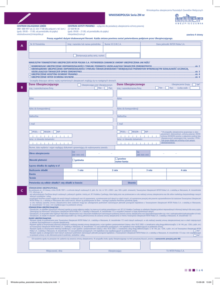 Wnioskopolisa ubezpieczenia Pozostałych Zawodów Medycznych WNIOSKOPOLISA Seria ZM nr CENTRUM ZGŁASZANIA SZKÓD 0801 888 997 lub 22 333 77 88 (dla połączeń z tel. kom.) (godz. 09:00 – 17:00, od poniedziałku do piątku) [email protected] CENTRUM ASYSTY PRAWNEJ – wyłącznie dla posiadaczy ubezpieczenia ochrony prawnej 22 568 98 36 (godz. 09:00 – 21:00, od poniedziałku do piątku) [email protected] zawiera 4 strony Proszę wypełnić dużymi drukowanymi literami. Każda zmiana powinna zostać potwierdzona podpisem przez Ubezpieczającego. Nr ID Pośrednika A Imię i nazwisko lub nazwa pośrednika Numer ID O.W.C.A. Dane jednostki INTER Polska S.A. Kontynuacja polisy seria, numer: NINIEJSZYM TOWARZYSTWO UBEZPIECZEŃ INTER POLSKA S.A. POTWIERDZA ZAWARCIE UMOWY UBEZPIECZENIA JAK NIŻEJ* DOBROWOLNE UBEZPIECZENIE ODPOWIEDZIALNOŚCI CYWILNEJ PODMIOTU UDZIELAJĄCEGO ŚWIADCZEŃ ZDROWOTNYCH.......................................................................str. 2 O BOWIĄZKOWE UBEZPIECZENIE ODPOWIEDZIALNOŚCI CYWILNEJ ŚWIADCZENIODAWCY NIEBĘDĄCEGO PODMIOTEM WYKONUJĄCYM DZIAŁALNOŚĆ LECZNICZĄ, UDZIELAJĄCEGO ŚWIADCZEŃ OPIEKI ZDROWOTNEJ........................................................................................................................................................................................str. 3 UBEZPIECZENIE KOSZTÓW OCHRONY PRAWNEJ...............................................................................................................................................................................................str. 4 UBEZPIECZENIE INTER OCHRONA HIV/WZW......................................................................................................................................................................................................str. 4 * B Szczegóły dotyczące zakresu wyżej wymienionych ubezpieczeń znajdują się na następnych stronach. Dane Ubezpieczającego Imię i nazwisko/nazwa firmy Ubezpieczający jest Ubezpieczonym Pan Pani Dane Ubezpieczonego Adres Adres Adres do korespondencji Adres do korespondencji Telefon/Fax Telefon/Fax E–mail E–mail PESEL REGON NIP PESEL Seria i nr dowodu tożsamości Ubezpieczenie Grupy Pan Imię i nazwisko/nazwa firmy REGON NIP Seria i nr dowodu tożsamości Pani Tak* Liczba osób * W przypadku ubezpieczenia grupowego w ubezpieczeniach: dobrowolnym, ochrony prawnej i INTER ochrona HIV/WZW prosimy o załączenie osobnej listy Ubezpieczonych zawierającej imię, nazwisko i PESEL. Cała grupa objęta jest ochroną w tym samym zakresie/wariancie. Numer, data wydania i organ wydający dokument uprawniający do wykonywania zawodu Okres ubezpieczenia Warunki płatności Od (dd–mm–rrrr) gotówka – Do (dd–mm–rrrr) – – – przelew numer konta: Łączna składka do zapłaty w zł Rozliczenie składki 1 rata 2 rata 3 rata 4 rata Kwota Termin Potwierdza się odbiór składki/1 raty składki w kwocie: C Słownie: OŚWIADCZENIE UBEZPIECZYCIELA: Na podstawie art. 24 Ustawy z dnia 29.08.1997 r. o ochronie danych osobowych (t. jedn. Dz. Ust. nr 101 z 2002 r. poz. 926 z późń. zmianami), Towarzystwo Ubezpieczeń INTER Polska S.A. z siedzibą w Warszawie, Al. Jerozolimskie 172, informuje, że: - jest administratorem Pani/Pana danych osobowych, pobranych zgodnie z treścią art. 815 Kodeksu Cywilnego, które będą przez nas przetwarzane w celu realizacji umowy ubezpieczenia oraz dla celów marketingu bezpośredniego naszych własnych produktów i usług, - przysługuje Pani/Panu prawo wglądu do swoich danych osobowych oraz ich poprawiania, a przetwarzanie tych danych w celach innych, niż wymienione powyżej cele prawnie usprawiedliwione lub statutowe Towarzystwa Ubezpieczeń INTER Polska S.A. z siedzibą w Warszawie albo osób trzecich, którym są przekazywane te dane – wymaga uzyskania Pani/Pana uprzedniej zgody. - w celu realizacji zawartej umowy ubezpieczenia dane osobowe mogą być udostępniane podmiotom stanowiącym jednostki powiązane kapitałowo z Towarzystwem Ubezpieczeń INTER Polska S.A. z siedzibą w Warszawie, Al. Jerozolimskie 172 oraz z nim współpracujące na podstawie umowy. OŚWIADCZENIA UBEZPIECZAJĄCEGO - Oświadczam, że udzieliłem powyższych informacji zgodnie ze swoją najlepszą wiedzą i że znane są mi sankcje przewidziane w art. 815 § 3 Kodeksu Cywilnego za udzielanie Ubezpieczycielowi nieprawdziwych informacji istotnych dla oceny ryzyka. Zobowiązuję się informować Towarzystwo Ubezpieczeń INTER Polska S.A. z siedzibą w Warszawie, Al. Jerozolimskie 172 o wszystkich zmianach w wyżej wymienionych danych. - Oświadczam, że otrzymałem tekst Ogólnych Warunków Ubezpieczenia wraz z klauzulami dodatkowymi stanowiącymi podstawę zawarcia umowy ubezpieczenia oraz zapoznałam/zapoznałem się z nimi i zaakceptowałam/zaakceptowałem ich treść. - Oświadczam, że zostało mi okazane i zapoznałam/zapoznałem się z treścią pełnomocnictwa do zawarcia umowy ubezpieczenia w imieniu Towarzystwa Ubezpieczeń INTER Polska S.A. z siedzibą w Warszawie, Al. Jerozolimskie 172 ZGODY UBEZPIECZAJĄCEGO - Wyrażam zgodę na przetwarzanie przez Towarzystwo Ubezpieczeń INTER Polska S.A. z siedzibą w Warszawie, Al. Jerozolimskie 172 moich danych osobowych, w celu realizacji zawartej umowy ubezpieczeniowej oraz w celach statystycznych w zakresie wyszczególnionym w umowie ubezpieczenia. - Wyrażam zgodę na otrzymywanie informacji związanych z realizacją zawartej umowy ubezpieczenia, w tym zgodnie z postanowieniami Ustawy z dnia 18.07.2002 r. o świadczeniu usług drogą elektroniczną(Dz. U. Nr 144, poz. 1204, z późn. zm.) od Towarzystwa Ubezpieczeń INTER Polska S.A. z siedzibą w Warszawie, Al. Jerozolimskie 172 oraz podmiotów powiązanych z nim kapitałowo oraz współpracujących na podstawie umowy. - Wyrażam zgodę na otrzymywanie informacji handlowych, w tym zgodnie z postanowieniami Ustawy z dnia 18.07.2002 r. o świadczeniu usług drogą elektr