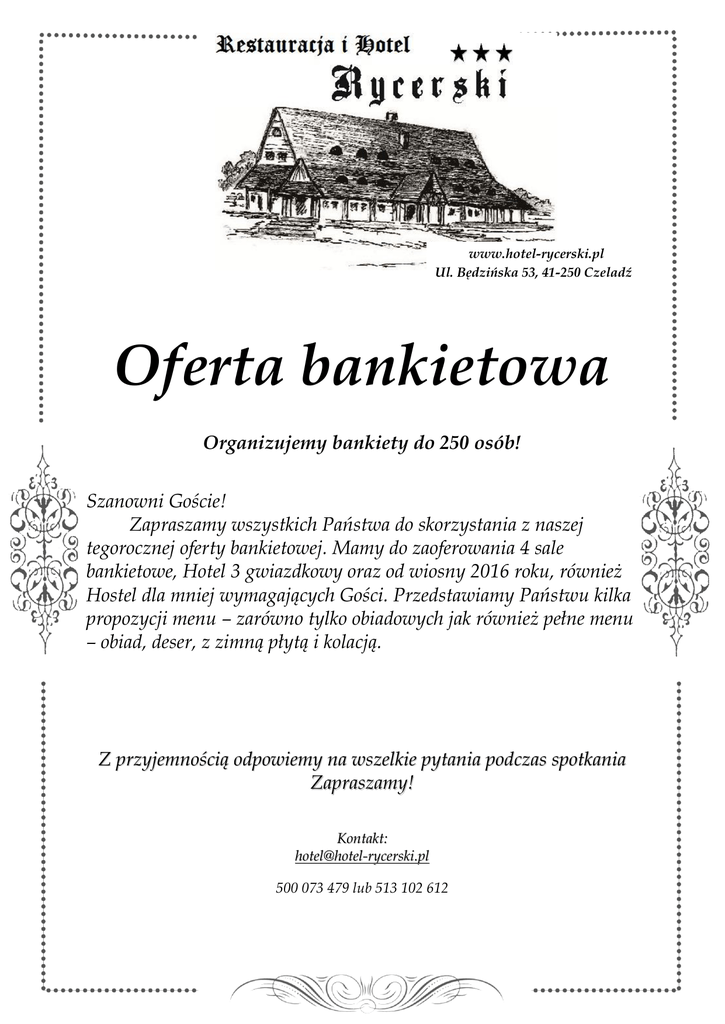 www.hotel-rycerski.pl Ul. Będzińska 53, 41-250 Czeladź Oferta bankietowa Organizujemy bankiety do 250 osób! Szanowni Goście! Zapraszamy wszystkich Państwa do skorzystania z naszej tegorocznej oferty bankietowej. Mamy do zaoferowania 4 sale bankietowe, Hotel 3 gwiazdkowy oraz od wiosny 2016 roku, również Hostel dla mniej wymagających Gości. Przedstawiamy Państwu kilka propozycji menu – zarówno tylko obiadowych jak również pełne menu – obiad, deser, z zimną płytą i kolacją. Z przyjemnością odpowiemy na wszelkie pytania podczas spotkania Zapraszamy! Kontakt: [email protected] 500 073 479 lub 513 102 612 Propozycja nr 1 Zupa: Rosół z makaronem lub inna zupa/krem Główne danie: wieloporcjowo Deser: Rolada wołowa z sosem pieczeniowym Sakiewka schabowa nadziewana pieczarkami i cebulą Kotlet de volaille Kluski białe / kluski szare Ziemniaki z wody Czerwona kapusta z boczkiem na ciepło Zestawy surówek Lody czekoladowe z sosem malinowym Napoje: Kawa / herbata Soki owocowe w dzbankach Kompot owocowy Woda niegazowana z cytryną w dzbankach – bez ograniczeń Koszt na 1 os. = 80 zł Propozycja nr 2 Zupa: Rosół z makaronem Główne danie: wieloporcjowo Rolada wołowa w sosie pieczeniowym Filet drobiowy zapiekany serem z pieczarkami i suszonymi pomidorami Schab panierowany Kluski białe/ kluski szare Ziemniaki z wody Kapusta biała zasmażana Zestaw surówek Deser: Puchar lodów waniliowych na prażonych jabłkach Napoje: Kawa / herbata Soki owocowe w dzbankach Kompot owocowy Woda niegazowana z cytryną w dzbankach – bez ograniczeń Koszt na 1 os. = 85 zł Propozycja nr 3 Zupa: Rosół z makaronem Główne danie: wieloporcjowo Rolada wołowa w sosie pieczeniowym Sakiewka schabowa nadziewana pieczarkami i cebulą Kotlet de volaille Polędwiczki wieprzowe z sosem grzybowym Kluski białe/ kluski szare Ziemniaki z wody Sałatka z buraczków Zestaw surówek Deser: Puchar lodowy z bitą śmietaną i owocami Napoje: Kawa / herbata Soki owocowe w dzbankach Kompot owocowy Woda niegazowana z cytryną w dzbankach – bez ograniczeń Koszt na 1 os. = 90 zł Propozycja nr 4 Zupa: Rosół z makaronem Główne danie: wieloporcjowo Deser: Rolada wołowa z sosem pieczeniowym Sakiewka schabowa nadziewana pieczarkami i cebulą Kotlet de volaille Kluski białe / kluski szare Ziemniaki z wody Czerwona kapusta z boczkiem na ciepło Zestawy surówek Lody czekoladowe z sosem malinowym Napoje i owoce: Kawa / herbata Soki owocowe w dzbankach – 0,5l/os. Woda niegazowana z cytryną w dzbankach – bez ograniczeń Owoce sezonowe Zimna płyta: Półmiski mięs pieczonych o Schab pieczony ze śliwką o Boczek rolowany z aromatycznym majerankiem o Swojska szynka pieczona o Karczek pieczony o Pasztet swojski pieczony Dechy serów z bakaliami Tymbaliki drobiowe Jaja faszerowane trzema pastami twarogowymi Śledzie w śmietanie z kwaśnym jabłkiem Sałatka warstwowa Sałatka Cezar Pieczywo mieszane Koszt na 1 os. = 135 zł Propozycja nr 5 Zupa: Rosół z makaronem Główne danie: wieloporcjowo Deser: Rolada wołowa w sosie pieczeniowym Udziec z indyka pieczony tradycyjnie Schab panierowany Kluski białe/ kluski szare Ziemniaki z wody Kapusta biała zasmażana Zestaw surówek Puchar lodów waniliowych na prażonych jabłkach Napoje i owoce: Kawa / herbata Soki owocowe w dzbankach – 0,5l/os. Woda niegazowana z cytryną w dzbankach – bez ograniczeń Owoce sezonowe Zimna płyta: Półmiski mięs pieczonych o Schab pieczony ze śliwką o Boczek rolowany z aromatycznym majerankiem o Swojska szynka pieczona o Karczek pieczony o Pasztet swojski pieczony Dechy serów z bakaliami Tymbaliki drobiowe Jaja faszerowane trzema pastami twarogowymi Śledzie w śmietanie z kwaśnym jabłkiem Sałatka warstwowa Sałatka Cezar Pieczywo mieszane Koszt na 1 os. = 130 zł Propozycja nr 6 Zupa: Rosół z makaronem Główne danie: wieloporcjowo Deser: Rolada wołowa w sosie pieczeniowym Sakiewka schabowa nadziewana pieczarkami i cebulą Kotlet de volaille Polędwiczki wieprzowe z sosem grzybowym Kluski białe/ kluski szare Ziemniaki z wody Sałatka z buraczków Zestaw surówek Puchar lodowy z bitą śmietaną i owocami Napoje i owoce: Kawa / herbata Soki owocowe w dzbankach 0,5l/os. Woda niegazowana z cytryną w dzbankach – bez ograniczeń Owoce sezonowe Zimna płyta: Półmiski mięs pieczonych o Schab pieczony ze śliwką o Boczek rolowany z aromatycznym majerankiem o Swojska szynka pieczona o Karczek pieczony o Pasztet swojski pieczony Dechy serów z bakaliami Tymbaliki drobiowe Jaja faszerowane trzema pastami twarogowymi Śledzie w śmietanie z kwaśnym jabłkiem Sałatka warstwowa Sałatka Cezar Pieczywo mieszane Koszt na 1 os. = 145 zł Propozycja nr 7 Zupa: Rosół ze swojskim makaronem Główne danie: wieloporcjowo Deser: Rolada wołowa z sosem pieczeniowym Sakiewka schabowa nadziewana pieczarkami i cebulą Kotlet de volaille Kluski białe / kluski szare Ziemniaki z wody Czerwona kapusta z boczkiem na ciepło Zestawy surówek Lody czekoladowe z sosem malinowym Napoje i owoce: Kawa / herbata Soki owocowe w dzbankach – 0,5l/os. Woda niegazowana z cytryną w dzbankach – bez ograniczeń Owoce sezonowe Zimna płyta: Półmiski mięs pieczonych o Schab pieczony ze śliwką o Boczek rolowany z aromatycznym majerankiem o Swojska szynka pieczona o Karczek pieczony o Pasztet swojski pieczony Dechy serów z bakaliami Tymbaliki drobiowe Jaja faszerowane trzema pastami twarogowymi Śledzie w śmietanie z kwaśnym jabłkiem Sałatka warstwowa Sałatka Cezar Pieczywo mieszane Kolacja: Barszcz czerwony z uszkami Koszt na 1 os. = 145 zł Propozycja nr 8 Zupa: Rosół z makaronem Główne danie: wieloporcjowo Rolada wołowa w sosie pieczeniowym Filet drobiowy zapiekany serem z pieczarkami i suszonymi pomidorami Schab panierowany Kluski białe/ kluski szare Ziemniaki z wody Kapusta biała zasmażana Zestaw surówek Deser: Puchar lodów waniliowych na prażonych jabłkach Napoje i owoce: Kawa / herbata Soki owocowe w dzbank