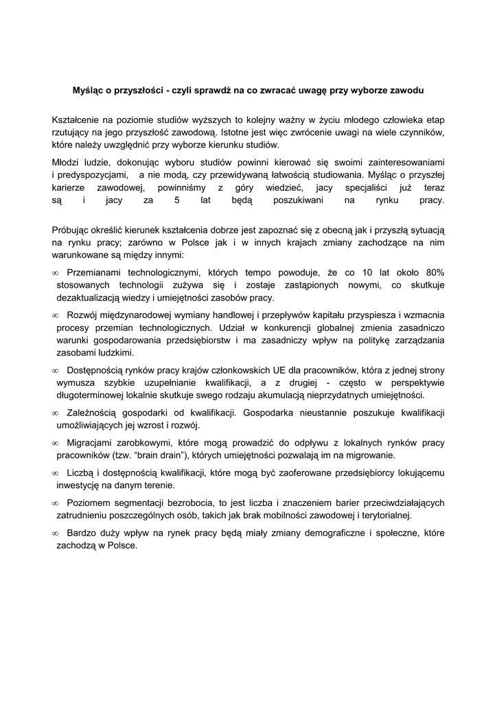 Myśląc o przyszłości - czyli sprawdź na co zwracać uwagę przy wyborze zawodu Kształcenie na poziomie studiów wyŜszych to kolejny waŜny w Ŝyciu młodego człowieka etap rzutujący na jego przyszłość zawodową. Istotne jest więc zwrócenie uwagi na wiele czynników, które naleŜy uwzględnić przy wyborze kierunku studiów. Młodzi ludzie, dokonując wyboru studiów powinni kierować się swoimi zainteresowaniami i predyspozycjami, a nie modą, czy przewidywaną łatwością studiowania. Myśląc o przyszłej karierze zawodowej, powinniśmy z góry wiedzieć, jacy specjaliści juŜ teraz są i jacy za 5 lat będą poszukiwani na rynku pracy. Próbując określić kierunek kształcenia dobrze jest zapoznać się z obecną jak i przyszłą sytuacją na rynku pracy; zarówno w Polsce jak i w innych krajach zmiany zachodzące na nim warunkowane są między innymi: • Przemianami technologicznymi, których tempo powoduje, Ŝe co 10 lat około 80% stosowanych technologii zuŜywa się i zostaje zastąpionych nowymi, co skutkuje dezaktualizacją wiedzy i umiejętności zasobów pracy. • Rozwój międzynarodowej wymiany handlowej i przepływów kapitału przyspiesza i wzmacnia procesy przemian technologicznych. Udział w konkurencji globalnej zmienia zasadniczo warunki gospodarowania przedsiębiorstw i ma zasadniczy wpływ na politykę zarządzania zasobami ludzkimi. • Dostępnością rynków pracy krajów członkowskich UE dla pracowników, która z jednej strony wymusza szybkie uzupełnianie kwalifikacji, a z drugiej - często w perspektywie długoterminowej lokalnie skutkuje swego rodzaju akumulacją nieprzydatnych umiejętności. • ZaleŜnością gospodarki od kwalifikacji. Gospodarka nieustannie poszukuje kwalifikacji umoŜliwiających jej wzrost i rozwój. • Migracjami zarobkowymi, które mogą prowadzić do odpływu z lokalnych rynków pracy pracowników (tzw. “brain drain”), których umiejętności pozwalają im na migrowanie. • Liczbą i dostępnością kwalifikacji, które mogą być zaoferowane przedsiębiorcy lokującemu inwestycję na danym terenie. • Poziomem segmentacji bezrobocia, to jest liczba i znaczeniem barier przeciwdziałających zatrudnieniu poszczególnych osób, takich jak brak mobilności zawodowej i terytorialnej. • Bardzo duŜy wpływ na rynek pracy będą miały zmiany demograficzne i społeczne, które zachodzą w Polsce. Sektor I (rolniczy) Sektor II (przemysłowy) Sektor III (usługowy) 2004 r. 2006 r. 2013 r. prognoza 18,2% 17,5% 14% 28,8% 29,0% 29% 53,0% 53,5% 57% źródło: Krajowa Strategia Zatrudnienia na lata 2007-2013 PowyŜsza tabela przedstawia prognozy zmian poziomu zatrudnienia w trzech sektorach gospodarki. Warto zwrócić uwagę na zwiększającą się liczbę pracujących w usługach (wynika to z odpływu osób z sektora rolniczego). Analiza zmian w zatrudnieniu według struktury zawodów w ostatnich latach pozwala szacować, Ŝe zatrudnienie będzie nadal rosło w takich zawodach jak: specjaliści nauk fizycznych, matematycznych i technicznych, specjaliści nauk przyrodniczych i ochrony zdrowia, pracownicy wszelkiego rodzaju usług (opiekunki do dzieci, osoby do prowadzenia domu, kosmetyczki, fryzjerzy, dietetycy) i ochrony, pozostali specjaliści, operatorzy i monterzy maszyn. Przewiduje się wzrost zatrudnienia w zawodach związanych z pomocą innym (w tym lekarzy), jak równieŜ w branŜy budowlanej. Zastanawiając się nad wyborem zawodu warto zwrócić uwagę na listę stu zawodów przyszłości, którym do 2010 r. nie będzie groziło bezrobocie. Lista ta została opracowana przez Polski Międzyresortowy Zespół Prognozowania Popytu na Pracę. Według tego opracowania osoby ze ścisłym i technicznym wykształceniem oraz pracownicy związani z nowymi technologiami i internetem mogą spokojnie patrzeć przyszłość. Zaś ze względu na przenoszenie do Polski produkcji, coraz więcej firm poszukiwać będzie inŜynierów róŜnych specjalności. Poszukiwani będą takŜe architekci i urbaniści oraz logistycy. Inne poszukiwane grupy zawodowe to finansiści, ekonomiści oraz doradcy finansowi. Znajdą oni zatrudnienie w działach księgowości, finansów, w instytucjach finansowych - w bankach i w firmach ubezpieczeniowych. Wiele firm juŜ teraz przenosi do Polski swoje centra rozliczeniowe. DuŜy wzrost zatrudnienia prognozowany jest w obszarze działalności naukowej prowadzonej w instytucjach naukowych (funkcjonujących przy przedsiębiorstwach) jak i na uczelniach. Edukacja to kolejna dziedzina, w której według specjalistów potrzebni będą pracownicy. DuŜy wzrost zapotrzebowania na pracowników widać w edukacji wykorzystującej technologie informatyczno-komunikacyjne (e-learning) oraz Internetu (webeducation). Zawodowe perspektywy stwarza teŜ ekologia. JuŜ w tej chwili wiele firm i urzędów szuka specjalistów ochrony środowiska (w tym ekonomistów czy prawników). Redukcja zatrudnienia i brak popytu na zawody. W tradycyjnych branŜach przemysłowych takich jak górnictwo, hutnictwo, kolejnictwo, włókiennictwo czy rybactwo występuję proces stałej redukcji zatrudnienia oraz brak popytu na zawody z tych sektorów gospodarki. W duŜej cześci dotyczy to innych branŜ, szczególnie tych ukierunkowanych na produkcję. Zawody schyłkowe, w których zatrudnienie systematycznie maleje, obejmują rolników, robotników obróbki metali i mechaników maszyn i urządzeń oraz pracowników przy pracach prostych w handlu i usługach. Zalicza się do nich równieŜ szewców czy osoby wykonujące rzemiosło artystyczne. Unikatowy kunszt rzemieślników – atrakcyjność przediębiorców opierających się na tradycji. NaleŜy zwrócić uwagę na fakt istnienia wąskiej grupy przedsiębiorstw, w tym rzemieślniczych, funkcjonujących w oparciu o tradycyjne, wręcz historyczne technologie. Jest to ich walorem, a jednocześnie bardzo często stanowią element dziedzictwa narodowego i – nawet, jeśli produkty