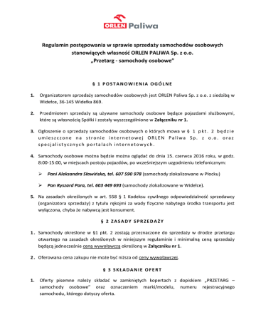 Regulamin postępowania w sprawie sprzedaży samochodów osobowych stanowiących własność ORLEN PALIWA Sp. z o.o. „Przetarg - samochody osobowe” § 1 POSTANOWIENIA OGÓLNE 1. Organizatorem sprzedaży samochodów osobowych jest ORLEN Paliwa Sp. z o.o. z siedzibą w Widełce, 36-145 Widełka 869. 2. Przedmiotem sprzedaży są używane samochody osobowe będące pojazdami służbowymi, które są własnością Spółki i zostały wyszczególnione w Załączniku nr 1. 3. Ogłoszenie o sprzedaży samochodów osobowych o których mowa w § 1 p k t . 2 b ę d z i e umieszczone na stronie internetowej ORLEN Paliwa Sp. z o.o. oraz specjalistycznych portalach internetowych. 4. Samochody osobowe można będzie można oglądać do dnia 15. czerwca 2016 roku, w godz. 8:00-15:00, w miejscach postoju pojazdów, po wcześniejszym uzgodnieniu telefonicznym: Pani Aleksandra Sławińska, tel. 607 590 978 (samochody zlokalizowane w Płocku) Pan Ryszard Para, tel. 603 449 693 (samochody zlokalizowane w Widełce). 5. Na zasadach określonych w art. 558 § 1 Kodeksu cywilnego odpowiedzialność sprzedawcy (organizatora sprzedaży) z tytułu rękojmi za wady fizyczne nabytego środka transportu jest wyłączona, chyba że nabywcą jest konsument. § 2 ZASADY SPRZEDAŻY 1 . Samochody określone w §1 pkt. 2 zostają przeznaczone do sprzedaży w drodze przetargu otwartego na zasadach określonych w niniejszym regulaminie i minimalną ceną sprzedaży będącą jednocześnie ceną wywoławczą określoną w Załączniku nr 1. 2 . Oferowana cena zakupu nie może być niższa od ceny wywoławczej. § 3 SKŁADANIE OFERT 1. Oferty pisemne należy składać w zamkniętych kopertach z dopiskiem „PRZETARG – samochody osobowe” oraz oznaczeniem marki/modelu, numeru rejestracyjnego samochodu, którego dotyczy oferta. 2. Oferty pisemne można składać w dni robocze w godzinach od 8.00 do 15.00 w sekretariacie Centrali Spółki, tj. 09-411 Płock, ul. Zglenickiego 44, bądź przesłać na adres: ORLEN Paliwa Sp. z o.o., ul. Zglenickiego 44, 09-411 Płock, nie później jednak niż do dnia 17. czerwca 2016 roku, do godz. 15.00. Decyduje data wpływu oferty do Centrali Spółki. 3. Oferta pod rygorem nieważności powinna być sporządzona w formie pisemnej i zgodnie ze wzorem stanowiącym Załącznik nr 2 i złożona oddzielnie na każdy pojazd oraz opatrzoną datą oraz czytelnym i pełnym podpisem (podpisami) osób uprawnionych do reprezentacji oferenta oraz dodatkowo: 3.1. dokumenty rejestrowe – aktualny wyciąg z KRS lub zaświadczenie o wpisie do ewidencji działalności gospodarczej (nie dotyczy osób fizycznych nie prowadzących działalności gospodarczej); 3.2. oświadczenie oferenta, że nie toczy się przeciw niemu postępowanie karne lub karnoskarbowe (Załącznik nr 3); 3.3. zgodę odpowiednich organów spółki na nabycie danego środka trwałego (w przypadku spółki prawa handlowego), a w przypadku gdy uzyskanie przedmiotowej zgody nie jest wymagane, oświadczenie o tym, że nabycie danego środka trwałego nie wymaga zgody organów spółki; 3.4. oświadczenie oferenta o terminie ważności oferty przez okres co najmniej 30 dni od złożenia 4. Warunkiem udziału w przetargu sprzedaży jest wpłacenie wadium w wysokości 10% i potwierdzenie jego uiszczenia. Wadium musi zostać uiszczone najpóźniej ostatniego dnia składania ofert (liczy się data uznania rachunku bakowego oferenta). 5. Wadium należy wpłacać na rachunek bankowy organizatora sprzedaży tj. rachunek bankowy nr : 5 1 1 0 3 0 1 5 0 8 0 0 0 0 0 0 0 5 0 2 4 8 0 0 0 6 . 6 . Wpłacone wadium zostanie zaliczone na poczet złożonej oferty a w przypadku jej odrzucenie zostanie zwrócone na wskazany przez oferenta rachunek bankowy w ciągu 7 dni od terminu zakończenia przetargu. § 4 ROZPATRYWANIE OFERT 1. Sprzedający zastrzega sobie prawo do wycofania dowolnego samochodu z „Oferty sprzedaży” jak również odwołania sprzedaży bez podania przyczyny, bez prawa do zgłaszania przez oferentów jakichkolwiek roszczeń z tego tytułu. 2. Sprzedający wybierze oferenta, który zaoferuje najwyższą cenę zakupu na wskazany samochód osobowy objęty przedmiotem sprzedaży. 3. Komisja Przetargowa odrzuca oferty, które: 6.1. złożone zostały po wyznaczonym terminie lub w niewłaściwym miejscu lub w niewłaściwej formie lub, 6.2. zostały złożone z oferowaną ceną zakupu niższą niż cena wywoławcza lub, 2 6.3. są niekompletne (tj.: nie zawierają wszystkich informacji, o których mowa w § 3 niniejszego regulaminu), nieczytelne lub budzą inną wątpliwość, zaś złożenie wyjaśnień mogłoby prowadzić do uznania jej za nową ofertę. 4. Komisja Przetargowa zawiadamia niezwłocznie oferenta w formie pisemnej o odrzuceniu oferty. 5. W przypadku złożenia dwóch lub więcej ofert na ten sam samochód osobowy i w tej samej najwyższej cenie, pomiędzy oferentami, którzy zaproponowali najwyższą cenę, zostanie przeprowadzona aukcja, której ceną wywoławczą będzie cena zaproponowana w ofertach. O terminie ewentualnej aukcji oferenci zostaną powiadomieni pisemnie. Jeżeli w toku takiej aukcji żaden z oferentów nie zaoferuje ceny wyższej niż cena zaoferowana w ofercie, Organizator wybierze jedną z ofert według własnego uznania. 6. Umowę sprzedaży samochodu uznaje się za zawartą z chwilą wyboru najkorzystniejszej oferty, w przypadku ostatniego przebicia niższej ceny w przypadku aukcji, o której mowa w pkt. 5 zd. 1 i 2. oraz w razie wyboru oferty w trybie, o którym mowa w pkt. 5 zd. 3. 7. Nabywca zobowiązuje się do uiszczenia zaoferowanej kwoty niezwłocznie po poinformowaniu przez Komisję Przetargową o wybraniu oferty, nie później jednak niż w terminie 7 dni od dnia wyboru oferty. W przypadku nieuiszczenia zaoferowanej kwoty we powyższym terminie wadium przepada na rzecz sprzedającego. 8. Wydanie nabywcy środka transportowego nastąpi w terminie 14 dni, licząc od dnia uznania należnej kwoty na