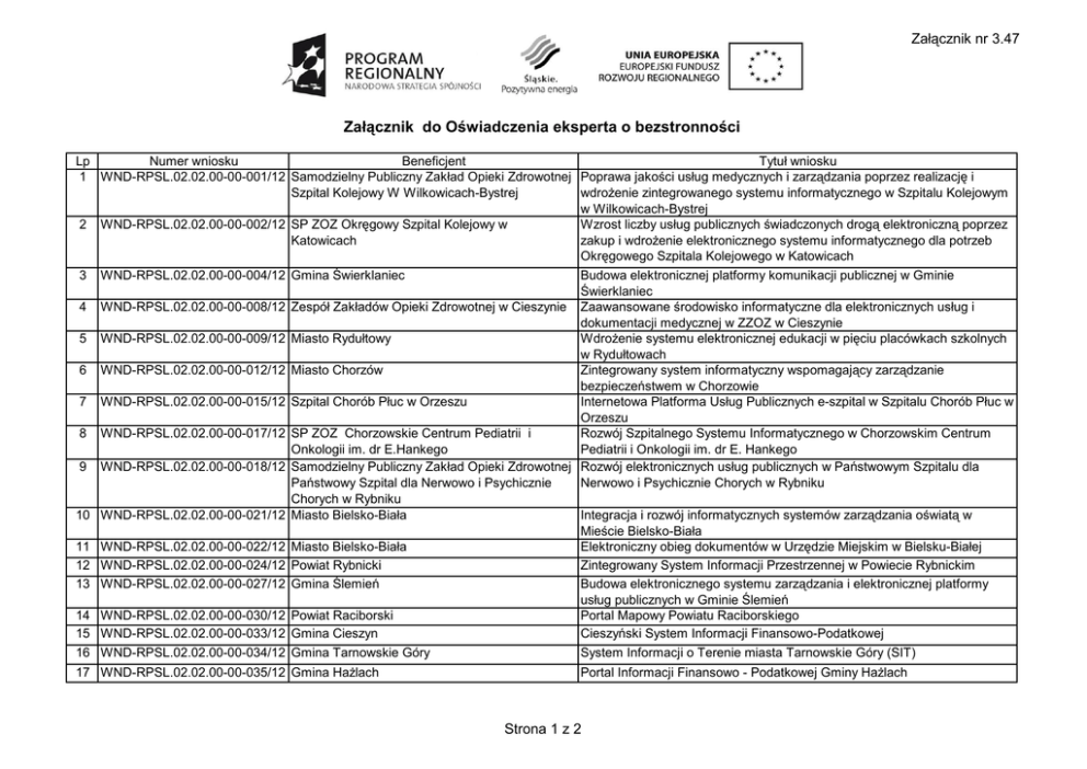 Załącznik nr 3.47 Załącznik do Oświadczenia eksperta o bezstronności Lp Numer wniosku Beneficjent Tytuł wniosku 1 WND-RPSL.02.02.00-00-001/12 Samodzielny Publiczny Zakład Opieki Zdrowotnej Poprawa jakości usług medycznych i zarządzania poprzez realizację i Szpital Kolejowy W Wilkowicach-Bystrej wdrożenie zintegrowanego systemu informatycznego w Szpitalu Kolejowym w Wilkowicach-Bystrej 2 WND-RPSL.02.02.00-00-002/12 SP ZOZ Okręgowy Szpital Kolejowy w Wzrost liczby usług publicznych świadczonych drogą elektroniczną poprzez Katowicach zakup i wdrożenie elektronicznego systemu informatycznego dla potrzeb Okręgowego Szpitala Kolejowego w Katowicach 3 WND-RPSL.02.02.00-00-004/12 Gmina Świerklaniec Budowa elektronicznej platformy komunikacji publicznej w Gminie Świerklaniec 4 WND-RPSL.02.02.00-00-008/12 Zespół Zakładów Opieki Zdrowotnej w Cieszynie Zaawansowane środowisko informatyczne dla elektronicznych usług i dokumentacji medycznej w ZZOZ w Cieszynie 5 WND-RPSL.02.02.00-00-009/12 Miasto Rydułtowy Wdrożenie systemu elektronicznej edukacji w pięciu placówkach szkolnych w Rydułtowach 6 WND-RPSL.02.02.00-00-012/12 Miasto Chorzów Zintegrowany system informatyczny wspomagający zarządzanie bezpieczeństwem w Chorzowie 7 WND-RPSL.02.02.00-00-015/12 Szpital Chorób Płuc w Orzeszu Internetowa Platforma Usług Publicznych e-szpital w Szpitalu Chorób Płuc w Orzeszu 8 WND-RPSL.02.02.00-00-017/12 SP ZOZ Chorzowskie Centrum Pediatrii i Rozwój Szpitalnego Systemu Informatycznego w Chorzowskim Centrum Onkologii im. dr E.Hankego Pediatrii i Onkologii im. dr E. Hankego 9 WND-RPSL.02.02.00-00-018/12 Samodzielny Publiczny Zakład Opieki Zdrowotnej Rozwój elektronicznych usług publicznych w Państwowym Szpitalu dla Państwowy Szpital dla Nerwowo i Psychicznie Nerwowo i Psychicznie Chorych w Rybniku Chorych w Rybniku 10 WND-RPSL.02.02.00-00-021/12 Miasto Bielsko-Biała Integracja i rozwój informatycznych systemów zarządzania oświatą w Mieście Bielsko-Biała 11 WND-RPSL.02.02.00-00-022/12 Miasto Bielsko-Biała Elektroniczny obieg dokumentów w Urzędzie Miejskim w Bielsku-Białej 12 WND-RPSL.02.02.00-00-024/12 Powiat Rybnicki Zintegrowany System Informacji Przestrzennej w Powiecie Rybnickim 13 WND-RPSL.02.02.00-00-027/12 Gmina Ślemień Budowa elektronicznego systemu zarządzania i elektronicznej platformy usług publicznych w Gminie Ślemień 14 WND-RPSL.02.02.00-00-030/12 Powiat Raciborski Portal Mapowy Powiatu Raciborskiego 15 WND-RPSL.02.02.00-00-033/12 Gmina Cieszyn Cieszyński System Informacji Finansowo-Podatkowej 16 WND-RPSL.02.02.00-00-034/12 Gmina Tarnowskie Góry System Informacji o Terenie miasta Tarnowskie Góry (SIT) 17 WND-RPSL.02.02.00-00-035/12 Gmina Hażlach Portal Informacji Finansowo - Podatkowej Gminy Hażlach Strona 1 z 2 Załącznik nr 3.47 18 WND-RPSL.02.02.00-00-040/12 Zespół Zakładów Opieki Zdrowotnej w Żywcu 19 WND-RPSL.02.02.00-00-044/12 20 WND-RPSL.02.02.00-00-045/12 21 WND-RPSL.02.02.00-00-061/12 22 WND-RPSL.02.02.00-00-068/12 Wdrożenie elektronicznych usług publicznych – e-zdrowie w ramach zintegrowanego systemu informatycznego w Szpitalu Powiatowym w Żywcu Samodzielny Publiczny Zespół Opieki Zdrowotnej Rozwój elektronicznych usług publicznych w Samodzielnym Publicznym w Myszkowie Zespole Opieki Zdrowotnej w Myszkowie Powiat Myszkowski Stworzenie Systemu Informacji Przestrzennej dla Powiatu Myszkowskiego Samodzielny Publiczny Zakład Opieki Zdrowotnej Informatyzacja Miejskiego Szpitala Zespolonego w Częstochowie Miejski Szpital Zespolony w Częstochowie Miasto Bytom Budowa węzła Infrastruktury Informacji Przestrzennej dla Bytomia 23 WND-RPSL.02.02.00-00-069/12 Samodzielny Publiczny Zakład Opieki Zdrowotnej Wojewódzki Szpital Specjalistyczny nr 4 w Bytomiu 24 WND-RPSL.02.02.00-00-070/12 Miasto Ruda Śląska Zapewnienie rozwoju elektronicznych usług publicznych poprzez zakup i wdrożenie systemu informatycznego w Wojewódzkim Szpitalu Specjalistycznym Nr 4 w Bytomiu Budowa Publicznego Systemu Informacji Przestrzennej Miasta Ruda Śląska 25 WND-RPSL.02.02.00-00-071/12 Gmina Piekary Śląskie 26 WND-RPSL.02.02.00-00-074/12 27 WND-RPSL.02.02.00-00-076/12 28 WND-RPSL.02.02.00-00-077/12 29 WND-RPSL.02.02.00-00-089/12 30 WND-RPSL.02.02.00-00-091/12 31 WND-RPSL.02.02.00-00-092/12 32 WND-RPSL.02.02.00-00-095/12 Budowa Centrum Informacji Przestrzennej wspomagającego zarządzanie miastem Piekary Śląskie Powiat Cieszyński Rozszerzenie ilości usług świadczonych drogą elektroniczną wraz z rozbudową Infrastruktury Informacji Przestrzennej Powiatu Cieszyńskiego Samodzielny Publiczny Zakład Opieki Zdrowotnej Zakup i wdrożenie systemu informatycznego w Centrum Psychiatrii w Centrum Psychiatrii w Katowicach Katowicach zapewniający wzrost usług publicznych świadczonych drogą elektroniczną Powiat Wodzisławski System Informacji Przestrzennej Powiatu Wodzisławskiego - narzędzie wspomagania zarządzaniem w administracji publicznej Powiat Będziński Rozbudowany Zintegrowany System Informacji Przestrzennej – narzędziem nowoczesnej administracji publicznej w Powiecie Będzińskim Samodzielny Publiczny Zakład Opieki Zdrowotnej Zintegrowany system informatyczny wspomagający zarządzanie zasobami Rejonowe Pogotowie Ratunkowe w Sosnowcu SPZOZ Rejonowe Pogotowie Ratunkowe w Sosnowcu Wojewódzki Szpital Specjalistyczny nr 2 w Zintegrowany system informatyczny wspomagający zarządzanie w Jastrzębiu Zdroju Wojewódzkim Szpitalu Specjalistycznym nr 2 w Jastrzębiu Zdroju Samodzielny Publiczny Szpital Kliniczny Nr 7 e-Zdrowie GCM – Budowa Medycznej Platformy Informacyjnej w Śląskiego Uniwersytetu Medycznego w Górnośląskim Centrum Medycznym w Katowicach Katowicach Górnośląskie Centrum Medyczne im. prof. Leszka Gieca Strona 2 z 2
