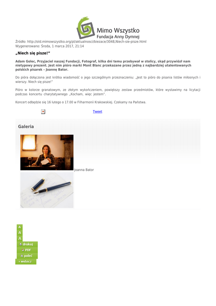Źródło: http://old.mimowszystko.org/pl/aktualnosci/biezace/3048,Niech-sie-pisze.html Wygenerowano: Środa, 1 marca 2017, 21:14 „Niech się pisze!” Adam Golec, Przyjaciel naszej Fundacji, Fotograf, kilka dni temu przebywał w stolicy, skąd przywiózł nam nietypowy prezent. Jest nim pióro marki Mont Blanc przekazane przez jedną z najbardziej utalentowanych polskich pisarek – Joannę Bator. Do pióra dołączona jest krótka wiadomość o jego szczególnym przeznaczeniu: „Jest to pióro do pisania listów miłosnych i wierszy. Niech się pisze!” Pióro w kolorze granatowym, ze złotym wykończeniem, powiększy zestaw przedmiotów, które wystawimy na licytacji podczas koncertu charytatywnego „Kocham, więc jestem”. Koncert odbędzie się 16 lutego o 17.00 w Filharmonii Krakowskiej. Czekamy na Państwa. Tweet Galeria Joanna Bator