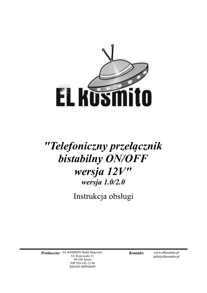 "Telefoniczny przełącznik bistabilny ON/OFF wersja 12V" wersja 1.0/2.0 Instrukcja obsługi Producent: EL KOSMITO Rafał Majewski Ul. Kościuszki 21 68-320 Jasień NIP 928-192-12-96 REGON 080936699 Kontakt: www.elkosmito.pl [email protected] Opis ogólny. Firma EL KOSMITO oferuje Państwu niespotykany na rynku przełącznik włącz/wyłącz (ON/OFF) pracujący z napięcia 12V, z przekaźnikiem wyjściowym o dużym prądzie przełączania. Przełącznik pozwala na włączanie i wyłączanie urządzenia poprzez linię telefoniczną. Układ działa w taki sposób, że po podpięciu pod linię telefoniczną telefonu stacjonarnego za każdym razem kiedy zostanie wywołany dzwonek (bo ktoś będzie telefonował) to układ zmieni stan i raz będzie włączał a raz wyłączał urządzenie zewnętrzne. Urządzenie można wykorzystywać np. do zdalnego zapalania świateł w odległych halach produkcyjnych lub np. kiedy pod nieobecność chcemy co jakiś czas włączyć i wyłączyć światło symulując obecność kogość w domu. Dużą zaletą jest także to, że choć sam przełącznik pracuje z napięcia 12V to przekaźnik wyjściowy jest odseparowany od wysokiego napięcia, więc może bezpiecznie załączać urządzenia zasilane z innego napięcia (np. wyższego sieciowego 230V). To samo dotyczy wejścia linii telefonicznej. Ona również jest w 100% odseparowana od wejściowego napięcia 230V jak też od przekaźnika wyjściowego. Dołożyliśmy przy tym wszelkich starań, aby przełącznik pobierał jak najmniejszy prąd podczas pracy. Cechy przełącznika ON/OFF. ✔ ✔ ✔ ✔ ✔ ✔ ✔ ✔ Niski pobór prądu Zasilanie AC9-11V DC9-15V Proste podłączenie i montaż (płytka mieści się w puszkach instalacyjnych) Sterowanie poprzez linię telefoniczną Czas gotowości po uruchomieni: ok 1 min Czas gotowości po telefonie: ok. 30-40 sek Małe gabaryty ok. 60x38x25mm (z otworami montażowymi) Złącza skręcane (kostki) do łatwiejszego montażu Parametry wejściowe. ✔ Napięcie zasilania: AC9-11V lub DC12V ✔ Pobór prądu w spoczynku: poniżej 0,1W ✔ Napięcie linii zmieniające stan: powyżej 60V Parametry wyjściowe. ✔ Maksymalny prąd przełączany: 8A ✔ Bezpieczne napięcia na styku przekaźnika: AC 250V Montaż. Uwaga! Urządzenie elektroniczne! Nieprawidłowe użytkowanie urządzenia może grozić uszkodzeniem odbiornika lub innymi poważniejszymi konsekwencjami w tym porażeniem prądem! Zachowaj szczególną ostrożność! Uwaga! Włącznik przeznaczony jest do załączania urządzeń nie zagrażających bezpośrednio życiu takich jak np. żarówki. W przypadku chęci wykorzystania włącznika ON/OFF do załączania urządzeń takich jak silniki itd. włącznik ON/OFF należy zastosować dokładnie analizując wszystkie zagrożenia. Zabrania się stosować sterownik do załączania maszyn, do których dostęp bezpośrednio mają ludzie! Strona 2 z 3 Rys. 1. Wyprowadzenia przełącznika ON/OFF Rys. 2. Schemat podłączenia i żarówkami Rys. 3. Schemat podłączenia odbiorników indukcyjnych (np. silniki, transformatory itd.) do przełącznika ON/OFF Strona 3 z 3