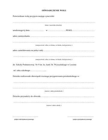 OŚWIADCZENIE WOLI Potwierdzam wolę przyjęcia mojego syna/córki ………………………………………………………………………………………….……….. (imię i nazwisko dziecka) urodzonego/ej dnia ……………..… w …………………….PESEL………………….……… adres zamieszkania ….…………………………………………………………………………. ………………………………………………………………………………………………….. (miejscowość, ulica, nr domu, nr lokalu, kod pocztowy ) adres zameldowania na pobyt stały ……………………………………………………………. ………….……………………………………………………………………………………… (miejscowość, ulica, nr domu, nr lokalu, kod pocztowy ) do Szkoły Podstawowej Nr 9 im. ks. kard. St. Wyszyńskiego w Lesznie od roku szkolnego………………….. Dziecko realizowało obowiązek rocznego przygotowania przedszkolnego w: ………….……………………………………………………………………………………… …………………………………………………………………………………………………. (nazwa i adres przedszkola ) Dziecko przynależy do obwodu …………………………………………………….…………. ………….……………………………………………………………………………………… (nazwa i adres szkoły ) ……………………………………..... podpis matki/opiekuna prawnego ......................................................... podpis ojca/opiekuna prawnego