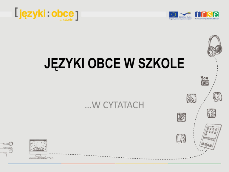 JĘZYKI OBCE W SZKOLE …W CYTATACH Na ogół nauczyciele przeznaczają na pisanie zbyt wiele czasu. Jeśli chodzi o wysiłek umysłowy, pisanie jest łatwiejsze niż mówienie, jest dla ucznia na pewno swego rodzaju relaksem po intensywnej pracy ustno-słuchowej. Nr 1/1967: Alojzy Brzeski, O ćwiczeniach pisemnych Czyż można opisać łatwość, z jaką nauczycielka języka niemieckiego w Krakowie wyciągała każdego ucznia w liczącej czterdzieści osób klasie do ożywionej rozmowy? Czy możemy opisać oddanie, z jakim nauczycielka języka francuskiego we Wrocławiu starała się rozszerzyć horyzonty myślowe chętnej do nauki grupy dziewcząt? Nr 1/1967: Helen Gordon, Helen Suchara, Wrażenia z podróży naukowej po Polsce Nauczyciel demokratyczny łatwiej znajdzie drogę do umysłu uczniów. Szczególnie dotyczy to nauki języków obcych. Nauczyciel musi wzbudzić zainteresowanie uczniów i starać się, aby przyswajali materiał możliwie łatwo i według swoich uzdolnień. Nr 2/1967: Jadwiga Schreiber, Z cyklu: Nasze doświadczenia w wyzyskaniu pomocy naukowych Dążenie do nauki języków obcych przejawia się w naszym kraju niezależnie od środowiska, zawodu, płci, wieku – jest zjawiskiem masowym. Nr 3/1967: Antoni Prejbisz, W poszukiwaniu nowych dróg doskonalenia kadry nauczycieli języków obcych Doskonalenie zawodowe nauczycieli języków obcych posiada swoją specyfikę tematyczną i organizacyjną, a – co za tym idzie – również i specyficzne formy. Nr 3/1967: Antoni Prejbisz, W poszukiwaniu nowych dróg doskonalenia kadry nauczycieli języków obcych Wiek XX otworzył nowe perspektywy dla dydaktyki języków obcych, zaczęły się badania i eksperymenty, do procesu nauczania weszły jako pomoc aparaty i maszyny, powstały laboratoria językowe i lekcje języków przybrały formy, o których nie śniło się nie tylko naszym przodkom, ale także nauczycielom dnia wczorajszego. Nr 4/1966: Michał Cieśla, Jak to ongiś wyglądały lekcje języków obcych Stosunki między językoznawstwem i nauczaniem języków obcych były zawsze skomplikowane i nie wolne od konfliktów. Językoznawstwo posiada urok i prestiż dyscypliny, która zdobyła poważny awans naukowy. Dlatego stosunki układają się jak w małżeństwie: poczynając od żarliwych zalotów, po których następuje krótki miesiąc miodowy, a kończąc na czymś, co można by nazwać „małżeństwem z rozsądku”. Nr 5/1972: Michael Sharwood-Smith, Związki językoznawstwa z nauczaniem języków obcych Warunkiem wstępnym przeprowadzenia właściwego doboru materiału jest przede wszystkim dobre opanowanie języka w teorii i w praktyce, znajomość programów i założeń metodycznych, znajomość podręczników, pomocy naukowych łącznie z umiejętnością posługiwania się nimi oraz znajomość uczniów, z którymi się pracuje. Nr 3/1968: Piotr Kowaliński, Selekcja u podstaw planowania pracy dydaktycznej Dlaczego więc my, nauczyciele języków obcych, nie mamy żadnych możliwości, jak dotąd, zwiedzenia kraju, którego języka uczymy? Dlaczego nie możemy zetknąć się bezpośrednio z kulturą i dorobkiem cywilizacji tego narodu? Nr 1/1957: Kol. Irena Pałysiewicz, O wymianie kulturalnej Polsko-Francuskiej W związku z geograficznym położeniem Polski, między krajami wschodu i zachodu Europy, oraz wyraźnymi tendencjami cywilizacji XX wieku do tworzenia więzi międzynarodowych – uważa się za niezbędne osiągnięcie przez całą polską młodzież znajomości kultury tych krajów drogą bezpośrednią, tj. przez studiowanie języków obcych. Nr 3/1957: Stefan Staszczyk, Zjazd oświatowy a języki klasyczne Wszyscy zdajemy sobie sprawę, że tradycyjne metody nauczania nie wytrzymują próby czasu, mam na myśli trzecią tercję XX wieku, w którą właśnie wkroczyliśmy, kiedy to przed słabo powiększającymi się szeregami nauczycieli stanęły zadania przekazania większej ilości informacji liczniejszym rzeszom uczniów i w krótszym czasie, niż to miało miejsce kiedykolwiek w przeszłości. Nr 2/1968: Zofia Jancewicz, Film i telewizja przewodowa w nauczaniu języków obcych Pierwszy podręcznik języka angielskiego, z którego zaczęłam niegdyś uczyć w szkole średniej, znał tylko jeden rodzaj ćwiczeń – pytania i odpowiedzi. Jako początkująca nauczycielka, przejęta szacunkiem do drukowanego słowa, byłabym zadręczyła klasę monotonią lekcji, gdyby nie ciche odezwanie się jednej z uczennic: „Jakie to nudne, wciąż to samo!”. Nr 3/1957: Irena Dobrzycka, Ćwiczenia językowe na wesoło Pamiętamy wszyscy prowadzoną ongiś z energią i swadą przez poczytny tygodnik POLITYKA akcję za szerszym nauczaniem języków obcych pod wymownym i nieco szokującym tytułem -hasłem: „Obywatele nie jąkać się”. Wydaje się jednak, że sprawa nauczania języków obcych w szkołach i uczelniach nadal nie znajduje należytego uznania i jest traktowana jak dawniej, po macoszemu. Nr 4/1968: Jan Papiór, Wörterbuch znaczy słownik Najlepsze nagrania nie są w stanie zastąpić nauczyciela, ale niewątpliwie mogą go w pewnym stopniu odciążyć, a ponadto urozmaicają i wzbogacają nauczanie języka. […] Trzeba powiedzieć otwarcie, że lepiej, aby uczniowie słuchali nagrania fonetyka – obcokrajowca niż swego nauczyciela. Patrząc realistycznie na sytuację naszego szkolnictwa trudno oczekiwać, aby polscy nauczyciele, szczególnie młodzi filologowie, którzy nigdy za granicą nie byli, opanowali wymowę wzorową pod każdym względem. Nr 4/1957: Mieczysław Kobylański, Nagrania jako pomoc w nauczaniu języków Nauka języków rozwija myślenie, wyobraźnię, rozszerza horyzonty myślowe, zmusza do precyzyjności, wzbogaca język, wymaga systematyczności, cierpliwości, wytrwałości. Znajomość języków może przyczynić się do utrwalenia pokoju, do ugruntowania zdrowo pojętego internacjonalizmu. Ukazanie się Języków Obcych w Szkole […] witam z radoś