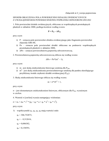 Załącznik nr 4_wersja poprawiona SPOSÓB OBLICZENIA POLA POWIERZCHNI DZIAŁEK EWIDENCYJNYCH Z UWZGLĘDNIENIEM POWIERZCHNIOWEJ POPRAWKI ODWZOROWAWCZEJ 1. Pole powierzchni działek ewidencyjnych, obliczone ze współrzędnych prostokątnych płaskich w układzie 2000, podlega korekcie według wzoru: P = PO – ΔPO, przy czym 1) P – oznacza pole powierzchni obiektu ewidencyjnego jako fragmentu powierzchni elipsoidy GRS 80, 2) Po – oznacza pole powierzchni działki obliczone na podstawie współrzędnych prostokątnych płaskich w układzie 2000, 3) ΔPo – oznacza powierzchniową poprawkę odwzorowawczą. 2. Powierzchniową poprawkę odwzorowawczą oblicza się według wzoru: ΔPo = Po*(m2 – 1), przy czym: 1) m - jest skalą zniekształcenia liniowego ustaloną dla PGK, 2 2) m - jest skalą zniekształcenia powierzchniowego ustaloną dla punktu określającego przybliżony środek ciężkości działki ewidencyjnej (PGK). 3. Skalę zniekształcenia liniowego oblicza się według wzoru: m = σ*10-5 + 1, przy czym: σ – jest elementarnym zniekształceniem liniowym, obliczonym dla PGK, wyrażonym w cm/km. 4. Wartość σ [cm/km] wyraża następujący wielomian: σ = σ0 + m0 * v2 * [q1 + q2 * u + q3 * u2 + q4 * v2], przy czym: 1) współczynniki q1, q2, q3, q4 mają wartości stałe: q1 = 306,752873, q2 = – 0,312616, q3 = 0,006382, q4 = 0,158591; 2) σo - jest elementarnym zniekształceniem liniowym na południku środkowym odwzorowania wyrażonym w cm/km; dla układów strefowych 2000; σ0 = – 7,7cm/km; 3) m0 = 0,999923 – jest skalą zniekształcenia liniowego na południku środkowym każdej strefy układu 2000, która odpowiada elementarnemu zniekształceniu liniowemu – 7,7 cm/km; 4) u = (XGK – 5800000,0) * 2,0 * 10-6; 5) v = YGK * 2,0 * 10-6; 6) XGK, YGK - niemodyfikowane współrzędne PGK w odwzorowaniu Gaussa-Krügera. Jeżeli współrzędne PGK w układzie 2000 mają wartość X2000, Y2000, to: XGK = X2000/mo , YGK = [Y2000 – (N*1000000 + 500000)] /m0, przy czym N przyjmuje wartość: 5 – dla pasa odwzorowania z południkiem środkowym L0 = 15o, 6 – dla pasa odwzorowania z południkiem środkowym L0 = 18o, 7 – dla pasa odwzorowania z południkiem środkowym L0 = 21o, 8 – dla pasa odwzorowania z południkiem środkowym L0 = 24o.
