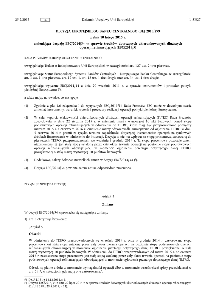 DECYZJA EUROPEJSKIEGO BANKU CENTRALNEGO (UE) 2015/299