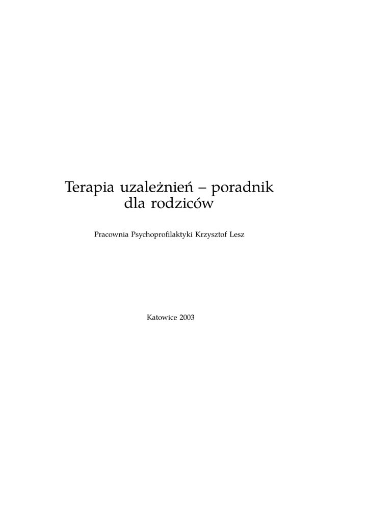 Terapia uzależnień – poradnik dla rodziców Pracownia Psychoprofilaktyki Krzysztof Lesz Katowice 2003 2 Pracownia Psychoprofilaktyki 3 Zamiast wstępu – kim jestem Witam Państwa w Gabinecie Terapii Uzależnień. Nazywam się Krzysztof Lesz. Od 16 lat jestem terapeutą w Wojewódzkim Ośrodku Zapobiegania i Leczenia Uzależnień w Katowicach, wcześniej (od 1981 r.) zajmowałem się terapią i profilaktyką uzależnień jako działacz Wojewódzkiego Oddziału Stowarzyszenia MONAR. W 1990 roku ukończyłem studia na Wydziale Pedagogiki i Psychologii Uniwersytetu Śląskiego i uzyskałem tytuł magistra pedagogiki specjalnej o specjalności resocjalizacja. Moje zawodowe doświadczenia zaowocowały utworzeniem w 1998 roku Pracowni Psychoprofilaktyki, początkowo realizującej mój autorski program profilaktyki uzależnień „Krok po kroku”, a teraz zajmującej się głównie terapią osób uzależnionych od narkotyków, gier hazardowych oraz tytoniu. Swego rodzaju „ukoronowaniem” drogi rozwoju zawodowego było dla mnie uzyskanie w 2002 r. certyfikatu ukończenia specjalistycznego szkolenia zatwierdzonego i certyfikowanego przez Ministra Zdrowia, uprawniającego do prowadzenia terapii i rehabilitacji uzależnienia od narkotyków w zakresie specjalisty terapii uzależnień (nr S/0068/2002). Pierwsza część tego krótkiego poradnika opisuje podstawowe założenia stosowanego przeze mnie podejścia terapeutycznego i jest próbą odpowiedzi na często zadawane mi pytania. Bardzo proszę o dokładne zaznajomienie się z opisanymi tu zasadami, jeśli będą Państwo chcieli coś przedyskutować, zapytać – proszę się nie wahać! Zrozumienie i współpraca pomiędzy nami zwiększają szanse powodzenia terapii. Część druga poświęcona jest odpowiedzi na pytanie „jak poznać?”. Zajmuje ją opis działania najczęściej używanych środków uzależniających. Część ta bazuje na opracowaniu Iwony Malinowskiej, wykorzystanym w materiałach szkoleniowych naszego autorstwa. Wszystkie wyrażone tu opinie są wynikiem mojego doświadczenia terapeutycznego oraz aktualnej wiedzy na temat uzależnień. Nie można ich jednak traktować jako „prawd objawionych” chociażby z tej przyczyny, że nie istnieje jedynie słuszna teoria czy sposób działania, z którą zgadzają się wszyscy (czy nawet większość) terapeuci i teoretycy zajmujący się problemem uzależnień. Z niektórymi moimi poglądami na temat terapii nie zgodzi się zapewne większość terapeutów! „Jedynie słuszna” droga wychodzenia z uzależnienia nie może istnieć ponieważ w terapii osób uzależnionych mamy do czynienia z całą złożonością ludzkich problemów. Innymi słowy – każdy człowiek jest inny: ma inne problemy emocjonalne, osobowościowe, potrzeby, motywacje, trudności wynikające z używania środków o różnym mechanizmie działania. Terapia jest dla mnie budowaniem przez pacjenta drogi do osiągnięcia założonego celu. Rozdział 1 Terapia Do połowy lat 70 dwudziestego wieku terapia osób uzależnionych od narkotyków opierała się w naszym kraju o lecznictwo psychiatryczne. Ograniczała się ona do odtrucia organizmu, i najczęściej nie przynosiła sukcesu rozumianego jako długotrwałego utrzymania abstynencji przez osobę uzależnioną. Pragnę zwrócić uwagę na przyjęcie pewnych kryteriów wyznaczających osiągnięcie sukcesu w terapii. To bardzo ważne zagadnienie, do którego wrócę w punkcie „Cele terapii”. Dlaczego leczenie psychiatryczne osób uzależnionych od narkotyków nie było skuteczne? Żeby odpowiedzieć na to pytanie musimy zrozumieć czym jest uzależnienie. 1.1 Uzależnienie – ważne definicje Zgodnie z definicją Komitetu Ekspertów WHO z 1969 roku: „uzależnienie (drug dependence) jest to stan psychiczny, a niekiedy także fizyczny, wynikający z interakcji pomiędzy organizmem a środkiem uzależniającym, charakteryzujący się zmianą zachowania oraz innymi reakcjami, do których należy konieczność zażywania tego środka, w sposób ciągły lub okresowy, w celu doznania jego wpływu na psychikę, a niekiedy także po to, aby uniknąć przykrych objawów wynikających z jego braku. Tolerancja może wystąpić równocześnie. Osobnik może być uzależniony od więcej niż jednego środka”1 . Najnowsza wersja Międzynarodowej Statystycznej Klasyfikacji Chorób i Problemów Zdrowotnych (ICD-10) zdefiniowała zespół uzależnienia jako stan psychiczny i fizyczny spowodowany używaniem substancji psychoaktywnych, na który składają się zespoły zjawisk fizjologicznych, behawioralnych i poznawczych 2 . Z przytoczonej definicji uzależnienia wynika, że stan ten można rozpatrywać w dwóch płaszczyznach: 1 Staniaszek M.Substancje uzależniające i typy uzależnień. W: Farmakoterapia w stanach uzależnień. PTP. Warszawa 1987. s.26 2 Baran-Furga H. Substancje psychoaktywne. TZN. Koszalin 1998. s. 6. Uzależnienie – ważne definicje 5 1. Psychicznej i behawioralnej – (wg ICD-10) 3 może obejmować następujące objawy: • silne pragnienie lub poczucie przymusu przyjmowania substancji • upośledzona zdolność kontroli nad zachowaniem związanym z przyjmowaniem substancji, tj. nad jego rozpoczynaniem, kończeniem oraz poziomem użycia, potwierdzona przyjmowaniem substancji w dużych ilościach lub przez czas dłuższy niż zamierzany, albo uporczywym pragnieniem przyjmowania substancji, albo nieskutecznością wysiłków zmniejszania lub kontrolowania jej używania • silne pochłonięcie sprawą przyjmowania substancji przejawiające się istotną zmianą dotychczasowych zamiłowań i zainteresowań porzucanych lub ograniczanych z powodu przyjmowania substancji, albo przeznaczeniem większości czasu na działania konieczne do uzyskania lub przyjęcia substancji, bądź uwolnienia się od następstw jej działania • uporczywe przyjmowanie substancji, pomimo oczywistych dowodów występowania szkodliwych następstw, potwier