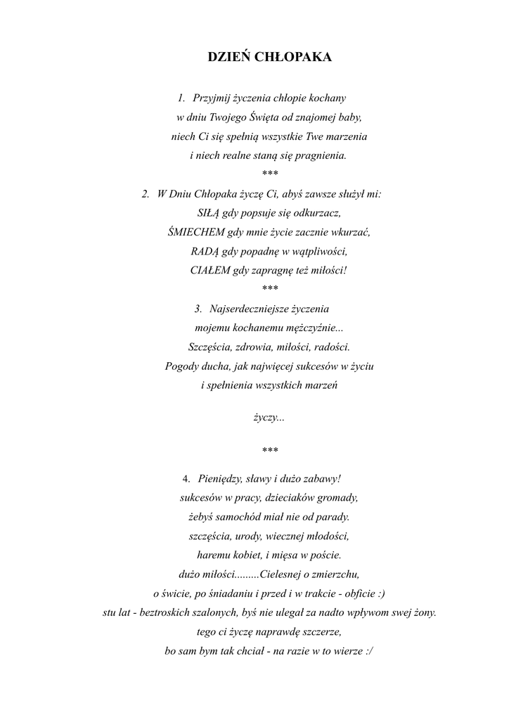 DZIEŃ CHŁOPAKA 1. Przyjmij życzenia chłopie kochany w dniu Twojego Święta od znajomej baby, niech Ci się spełnią wszystkie Twe marzenia i niech realne staną się pragnienia. *** 2. W Dniu Chłopaka życzę Ci, abyś zawsze służył mi: SIŁĄ gdy popsuje się odkurzacz, ŚMIECHEM gdy mnie życie zacznie wkurzać, RADĄ gdy popadnę w wątpliwości, CIAŁEM gdy zapragnę też miłości! *** 3. Najserdeczniejsze życzenia mojemu kochanemu mężczyźnie... Szczęścia, zdrowia, miłości, radości. Pogody ducha, jak najwięcej sukcesów w życiu i spełnienia wszystkich marzeń życzy... *** 4. Pieniędzy, sławy i dużo zabawy! sukcesów w pracy, dzieciaków gromady, żebyś samochód miał nie od parady. szczęścia, urody, wiecznej młodości, haremu kobiet, i mięsa w poście. dużo miłości.........Cielesnej o zmierzchu, o świcie, po śniadaniu i przed i w trakcie - obficie :) stu lat - beztroskich szalonych, byś nie ulegał za nadto wpływom swej żony. tego ci życzę naprawdę szczerze, bo sam bym tak chciał - na razie w to wierze :/ *** 5. Składamy Wam życzenia w imieniu całej żeńskiej społeczności *** 6. Wszystkiego dobrego w dniu święta chłopaka życzy Twoja kochana. *** 7. Zakochałam się w Tobie i brnę dalej w to błoto czy wiesz co ja robię? Kocham Cię idioto! *** 8. Misiu kochany życzę Ci 1OO% pewności, więcej stanowczości, ruchu pewnego, głosu mocnego, spojrzenia boskiego, torsu dużego, serducha ciepłego.... by to wszystko przetrwało do później starości. Kochaj mnie złotko, czule i słodko!!! twoja...