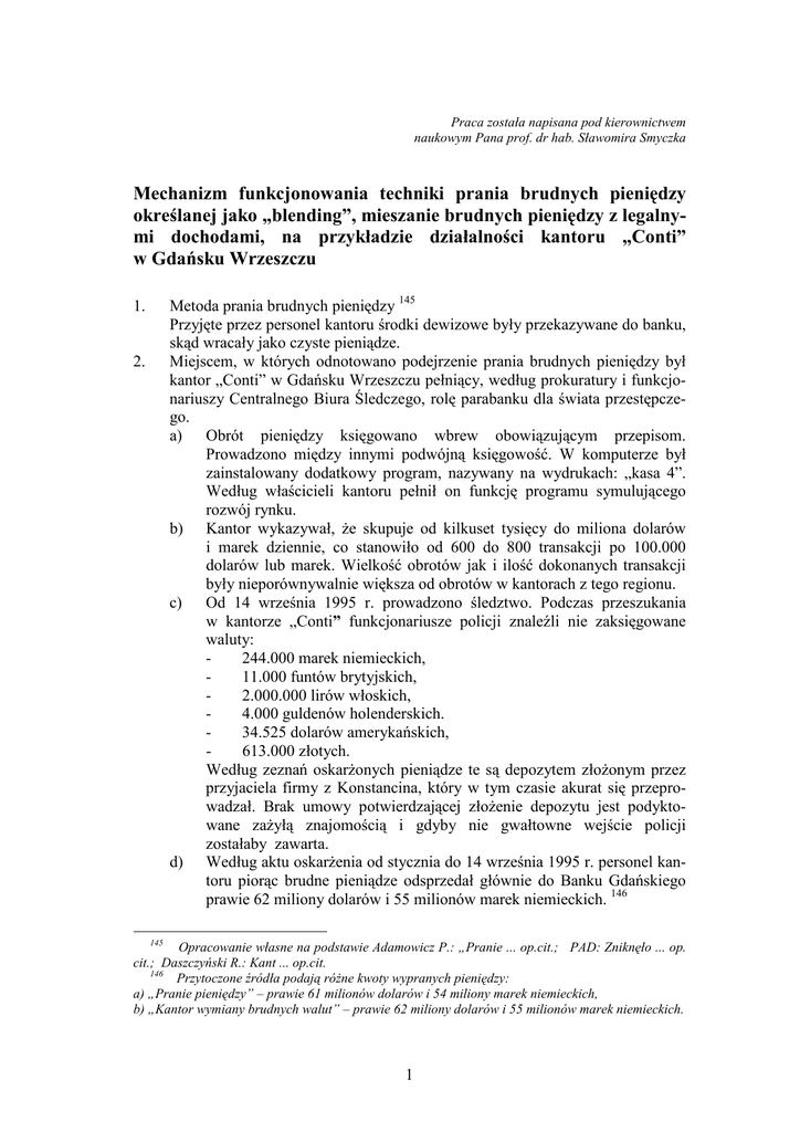 Praca została napisana pod kierownictwem naukowym Pana prof. dr hab. Sławomira Smyczka Mechanizm funkcjonowania techniki prania brudnych pieniędzy określanej jako „blending”, mieszanie brudnych pieniędzy z legalnymi dochodami, na przykładzie działalności kantoru „Conti” w Gdańsku Wrzeszczu Metoda prania brudnych pieniędzy 145 Przyjęte przez personel kantoru środki dewizowe były przekazywane do banku, skąd wracały jako czyste pieniądze. Miejscem, w których odnotowano podejrzenie prania brudnych pieniędzy był kantor „Conti” w Gdańsku Wrzeszczu pełniący, według prokuratury i funkcjonariuszy Centralnego Biura Śledczego, rolę parabanku dla świata przestępczego. a) Obrót pieniędzy księgowano wbrew obowiązującym przepisom. Prowadzono między innymi podwójną księgowość. W komputerze był zainstalowany dodatkowy program, nazywany na wydrukach: „kasa 4”. Według właścicieli kantoru pełnił on funkcję programu symulującego rozwój rynku. b) Kantor wykazywał, że skupuje od kilkuset tysięcy do miliona dolarów i marek dziennie, co stanowiło od 600 do 800 transakcji po 100.000 dolarów lub marek. Wielkość obrotów jak i ilość dokonanych transakcji były nieporównywalnie większa od obrotów w kantorach z tego regionu. c) Od 14 września 1995 r. prowadzono śledztwo. Podczas przeszukania w kantorze „Conti” funkcjonariusze policji znaleźli nie zaksięgowane waluty: 244.000 marek niemieckich, 11.000 funtów brytyjskich, 2.000.000 lirów włoskich, 4.000 guldenów holenderskich. 34.525 dolarów amerykańskich, 613.000 złotych. Według zeznań oskarżonych pieniądze te są depozytem złożonym przez przyjaciela firmy z Konstancina, który w tym czasie akurat się przeprowadzał. Brak umowy potwierdzającej złożenie depozytu jest podyktowane zażyłą znajomością i gdyby nie gwałtowne wejście policji zostałaby zawarta. d) Według aktu oskarżenia od stycznia do 14 września 1995 r. personel kantoru piorąc brudne pieniądze odsprzedał głównie do Banku Gdańskiego prawie 62 miliony dolarów i 55 milionów marek niemieckich. 146 1. 2. 145 Opracowanie własne na podstawie Adamowicz P.: „Pranie ... op.cit.; PAD: Zniknęło ... op. cit.; Daszczyński R.: Kant ... op.cit. 146 Przytoczone źródła podają różne kwoty wypranych pieniędzy: a) „Pranie pieniędzy” – prawie 61 milionów dolarów i 54 miliony marek niemieckich, b) „Kantor wymiany brudnych walut” – prawie 62 miliony dolarów i 55 milionów marek niemieckich. 1 e) 3. 4. 5. Przeprowadzona przez Urząd Skarbowy kontrola w 1995 r. spółki „Conti” wykazała „ uszczuplenia podatkowe ”, które oszacowano na ponad 5,1 miliona złotych i 8,8 miliona złotych odsetek. f) Dochodzenie było prowadzone prawie przez 5 lat, w tym przez 3,5 roku przez organa skarbowe. g) Pieniądze stanowiące dowód rzeczowy, wartości kilku milionów złotych w różnych walutach, znikły z Oddziału Okręgowego Narodowego Banku Polskiego w Gdańsku, w którym zostały złożone jako depozyt sądowy. Wykorzystano sfałszowane postanowienie sądu. Czynniki ułatwiające pranie brudnych pieniędzy w kantorach i w kasynach gry: 147 a) Atrakcyjność polskiego systemu finansowo-prawnego dla międzynarodowego świata przestępczego. Według obowiązujących przepisów kantory i kasyna gry nie były zobowiązane do informowania organów ścigania o podejrzanych transakcjach finansowych. Obowiązek ten spoczywał tylko na bankach i domach maklerskich. 148 Zbyt wysoko określone przez przepisy wymagania dowodowe oraz brak jasności i czytelności charakteru dowodów dotyczących prania brudnych pieniędzy. 149 Brak odpowiedzialności karnej dla podmiotów gospodarczych. b) Brak ratyfikowania przez Polskę konwencji Rady Europy o zyskach pochodzących z przestępczości. c) Brak powołania, pomimo zapowiedzi rządu, Generalnego Inspektoratu Informacji Finansowych, którego zadaniem byłoby gromadzenie i przetwarzanie informacji dotyczących podejrzanych transakcji finansowych w kraju. 150 Źródłem informacji do podjęcia działań operacyjnych przeciwko organizatorom prania brudnych pieniędzy przez pion do walki z przestępczością zorganizowaną była informacja operacyjna, że w kantorze jest przechowywana nielegalna broń i waluta pochodząca z przestępstw. Źródło środków finansowych: Według przedstawionych opinii funkcjonariuszy Centralnego Biura Śledczego oraz prokuratorów należy przypuszczać, że ujawnione środki finansowe w kantorze pochodziły z nielegalnej działalności grup przestępczych. w niniejszym załączniku przytoczono dane z późniejszej publikacji, jako bardziej wiarygodne. 147 Opracowano na podstawie Łuczka M.:„Raport ... op. cit. 148 Dopiero Ustawa z 16 listopada 2000 r., o przeciwdziałaniu wprowadzaniu do obrotu finansowego wartości majątkowych pochodzących z nielegalnych lub nieujawnionych źródeł oraz przeciwdziałaniu finansowania terroryzmu ( Dz. U. Nr 116, poz. 1216 ), sprecyzowała w dziewięciu obszarach tematycznych zakres obowiązku rejestracji transakcji finansowych. 149 Rozbieżności w uzasadnieniu prawnym przestępstwa prania brudnych pieniędzy, występujące pomiędzy Ustawą z 16 listopada 2000 r., art. 299 § 1 kodeksu karnego ujawniają się w działaniach operacyjnych prokuratury i Centralnego Biura Śledczego. Zagadnienie braku właściwej korelacji aktów prawnych nie jest tematem niniejszej pracy. 150 Generalny Inspektor Informacji Finansowej został powołany Ustawą z 16 listopada 2000 r. o przeciwdziałaniu wprowadzaniu do obrotu finansowego wartości majątkowych pochodzących z nielegalnych lub nieujawnionych źródeł oraz przeciwdziałaniu finansowania terroryzmu ( Dz. U. Nr 116, poz. 1216 ), funkcjonuje przy Ministerstwie Finansów Rzeczypospolitej Polskiej. 2 Zakup nieruchomości w Krakowie jako technika prania brudnych pieniędzy realizowana w fazie integracji 1. Metoda prania brudnych pieniędzy: 151 a)