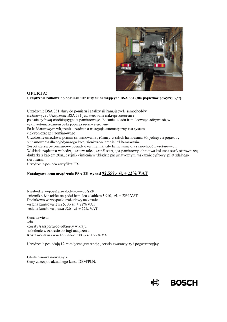 OFERTA: Urządzenie rolkowe do pomiaru i analizy sił hamujących BSA 331 (dla pojazdów powyżej 3,5t). Urządzenie BSA 331 służy do pomiaru i analizy sił hamujących samochodów ciężarowych . Urządzenie BSA 331 jest sterowane mikroprocesorem i posiada cyfrową obróbkę sygnału pomiarowego. Badanie układu hamulcowego odbywa się w cyklu automatycznym bądź poprzez ręczne sterownie. Po każdorazowym włączeniu urządzenia następuje automatyczny test systemu elektronicznego i pomiarowego . Urządzenie umożliwia pomiar sił hamowania , różnicy w siłach hamowania kół jednej osi pojazdu , sił hamowania dla pojedynczego koła, nierównomierności sił hamowania. Zespół sterująco-pomiarowy posiada dwa mierniki siły hamowania dla samochodów ciężarowych. W skład urządzenia wchodzą : zestaw rolek, zespół sterująco-pomiarowy ,obrotowa kolumna szafy sterowniczej, drukarka z kablem 20m., czujnik ciśnienia w układzie pneumatycznym, wskaźnik cyfrowy, pilot zdalnego sterowania. Urządzenie posiada certyfikat ITS. Katalogowa cena urządzenia BSA 331 wynosi 92.559,- zł. + 22% VAT Niezbędne wyposażenie dodatkowe do SKP : -miernik siły nacisku na pedał hamulca z kablem 5.910,- zł. + 22% VAT Dodatkowo w przypadku zabudowy na kanale: -osłona kanałowa lewa 520,- zł. + 22% VAT -osłona kanałowa prawa 520,- zł. + 22% VAT Cena zawiera: -cło -koszty transportu do odbiorcy w kraju -szkolenie w zakresie obsługi urządzenia Koszt montażu i uruchomienia: 2000,- zł + 22% VAT Urządzenia posiadają 12 miesięczną gwarancję , serwis gwarancyjny i pogwarancyjny. Oferta cenowa niewiążąca. Ceny zależą od aktualnego kursu DEM/PLN.