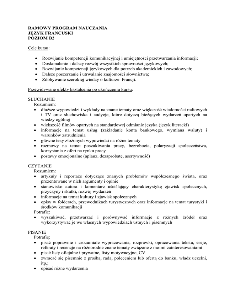 RAMOWY PROGRAM NAUCZANIA JĘZYK FRANCUSKI POZIOM B2 Cele kursu: • • • • • Rozwijanie kompetencji komunikacyjnej i umiejętności przetwarzania informacji; Doskonalenie i dalszy rozwój wszystkich sprawności językowych; Rozwijanie kompetencji językowych dla potrzeb akademickich i zawodowych; Dalsze poszerzanie i utrwalanie znajomości słownictwa; Zdobywanie szerokiej wiedzy o kulturze Francji. Przewidywane efekty kształcenia po ukończeniu kursu: SŁUCHANIE Rozumiem: • dłuższe wypowiedzi i wykłady na znane tematy oraz większość wiadomości radiowych i TV oraz słuchowiska i audycje, które dotyczą bieżących wydarzeń opartych na wiedzy ogólnej • większość filmów opartych na standardowej odmianie języka (język literacki) • informacje na temat usług (zakładanie konta bankowego, wymiana waluty) i warunków zatrudnienia • główne tezy złożonych wypowiedzi na różne tematy • rozmowy na temat poszukiwania pracy, bezrobocia, polaryzacji społeczeństwa, korzystania z ofert na rynku pracy • postawy emocjonalne (aplauz, dezaprobatę, asertywność) CZYTANIE Rozumiem: • artykuły i reportaże dotyczące znanych problemów współczesnego świata, oraz prezentowane w nich argumenty i opinie • stanowisko autora i komentarz uściślający charakterystykę zjawisk społecznych, przyczyny i skutki, rozwój wydarzeń • informacje na temat kultury i zjawisk społecznych • opisy w folderach, przewodnikach turystycznych oraz informacje na temat turystyki i środków komunikacji Potrafię: • wyszukiwać, przetwarzać i porównywać informacje z różnych źródeł oraz wykorzystywać je we własnych wypowiedziach ustnych i pisemnych PISANIE Potrafię: • pisać poprawnie i zrozumiale wypracowania, rozprawki, opracowania tekstu, eseje, referaty i recenzje na różnorodne znane tematy związane z moimi zainteresowaniami • pisać listy oficjalne i prywatne, listy motywacyjne, CV • zwracać się pisemnie z prośbą, radą, poleceniem lub ofertą do banku, władz uczelni, itp.; • opisać różne wydarzenia MÓWIENIE Potrafię: • porozumiewać się płynnie i spontanicznie oraz prowadzić swobodną rozmowę z rodzimymi użytkownikami języka • brać czynny udział w dyskusji, debatach i rozmowie na tematy ogólnie znane • przedstawiać swoje poglądy i ich bronić, argumentować i formułować mój punkt widzenia, polemizować i wypracowywać rozwiązania kompromisowe • formułować rozbudowane wypowiedzi na tematy, które mnie interesują • wyrażać emocje, rozmawiać o przeżyciach w różnych sytuacjach życiowych • opisać zjawiska w sposób ogólny i szczegółowy i opracować prezentację. Kształcone funkcje językowe: SŁUCHANIE dłuższej wypowiedzi, wykładu oraz nawet złożonej dyskusji pod warunkiem, że znany jest temat wypowiedzi; wiadomości TV i programów dotyczących bieżących wydarzeń; fragmentów filmów w wersji oryginalnej, jeśli aktorzy posługują się językiem literackim (standardowym). CZYTANIE artykułów i reportaży dotyczących współczesnych problemów, których autorzy przedstawiają szczegółowe opinie i argumenty; współczesnej prozy literackiej. PISANIE przejrzystego precyzyjnego tekstu na wiele tematów związanych z osobistymi zainteresowaniami; eseju lub sprawozdania, przekazujących informacje lub przedstawiających argumenty za i przeciw; listu podając istotę i wagę osobistych doświadczeń i wrażeń. MÓWIENIE: porozumiewanie się z taką płynnością i spontanicznością, która umożliwia naturalną komunikację z rodzimym rozmówcą języka; branie czynnego udziału w dyskusji wyjaśniając i podtrzymując swoje poglądy. Tematyka kursu: Kontakty międzyludzkie; Warunki kształcenia, badania naukowe, placówki oświatowe i wychowawcze; Życie studenckie — akademik; Zdrowy styl życia; Aktualne wydarzenia społeczno-polityczne w Polsce, Francji oraz na świecie; Problemy ekologii; Praca w mieście i na wsi; Zatrudnienie, nowe zawody, bezrobocie, poszukiwanie pracy, obowiązki; Kultura masowa i kultura „wysoka”, telewizja, radio, muzea, imprezy kulturalne, festiwale, kino — filmy rozrywkowe i ambitne; Globalizacja kultury; Sfera usług: bank: konto, rachunek, budżet domowy. Wprowadzane funkcje językowe: • • • • • Odpowiadanie na krytykę, obrona swojego punktu widzenia; Prośba o powtórzenie, uściślenie; Przedstawianie sytuacji i wydarzeń w przeszłości, wyrażanie trwania czynności, przedstawianie jej początku i końca; Wyrażanie powtarzalności; Opowiadanie ustne i pisemne; • • • • • • • • • • Umieszczanie wydarzenia w czasie i ustosunkowywanie co do innego wydarzenia lub sytuacji równoczesnej, przeszłej lub przyszłej; Przekazywanie słów innych osób, wiadomości, informacji ze środków masowego przekazu (przekaz dosłowny i przekaz subiektywny, dający wyraz powątpiewaniu); Przedstawianie warunków spełnienia czynności w przyszłości, teraźniejszości i przeszłości; Przedstawienie okoliczności towarzyszących wydarzeniu w teraźniejszości i przeszłości: celu, skutku, przyczyny, sposobu, przyzwolenia, itp.; Wyrażanie: optymizmu, radości; smutku, żalu, bólu; rozczarowania / zadowolenia; wątpliwości, niewiary; zmartwienia, strachu; wyrzutów sumienia; rezygnacji i pogodzenia się; Przedstawianie opinii; Rozkazywanie i nakazywanie, zwracanie się z prośbą, radą; Rozpoczynanie i kończenie rozmowy, zmienianie tematu, przerywanie czyjejś wypowiedzi, uporządkowanie opowiadania; Prezentacja jasnego i szczegółowego opisu w szerokim zakresie tematów z różnych dziedzin; Przedstawianie swojego poglądu na dany temat podając argumenty za i przeciw. Materiał leksykalno-gramatyczny: Zwroty Ce n’est pas vrai, ce n’est pas ma faute, vous vous trompez; Zwroty Veuillez répéter s.v.p., pourriez-vous expliquer ce probleme? Czasy przeszłe: imparfait, passé composé, passé récent, plus-que-parfait; Czasy przes
