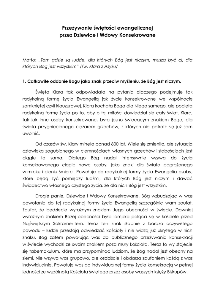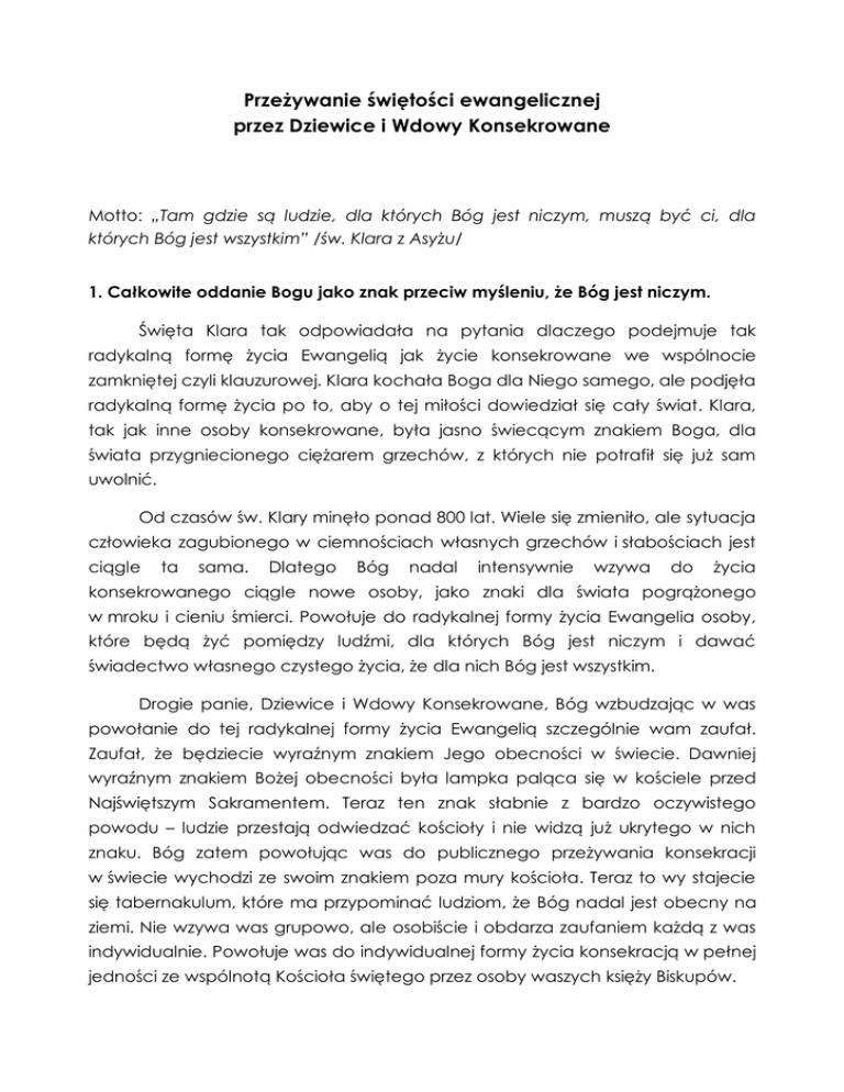 Przeżywanie świętości ewangelicznej przez Dziewice i Wdowy Konsekrowane Motto: „Tam gdzie są ludzie, dla których Bóg jest niczym, muszą być ci, dla których Bóg jest wszystkim” /św. Klara z Asyżu/ 1. Całkowite oddanie Bogu jako znak przeciw myśleniu, że Bóg jest niczym. Święta Klara tak odpowiadała na pytania dlaczego podejmuje tak radykalną formę życia Ewangelią jak życie konsekrowane we wspólnocie zamkniętej czyli klauzurowej. Klara kochała Boga dla Niego samego, ale podjęła radykalną formę życia po to, aby o tej miłości dowiedział się cały świat. Klara, tak jak inne osoby konsekrowane, była jasno świecącym znakiem Boga, dla świata przygniecionego ciężarem grzechów, z których nie potrafił się już sam uwolnić. Od czasów św. Klary minęło ponad 800 lat. Wiele się zmieniło, ale sytuacja człowieka zagubionego w ciemnościach własnych grzechów i słabościach jest ciągle ta sama. Dlatego Bóg nadal intensywnie wzywa do życia konsekrowanego ciągle nowe osoby, jako znaki dla świata pogrążonego w mroku i cieniu śmierci. Powołuje do radykalnej formy życia Ewangelia osoby, które będą żyć pomiędzy ludźmi, dla których Bóg jest niczym i dawać świadectwo własnego czystego życia, że dla nich Bóg jest wszystkim. Drogie panie, Dziewice i Wdowy Konsekrowane, Bóg wzbudzając w was powołanie do tej radykalnej formy życia Ewangelią szczególnie wam zaufał. Zaufał, że będziecie wyraźnym znakiem Jego obecności w świecie. Dawniej wyraźnym znakiem Bożej obecności była lampka paląca się w kościele przed Najświętszym Sakramentem. Teraz ten znak słabnie z bardzo oczywistego powodu – ludzie przestają odwiedzać kościoły i nie widzą już ukrytego w nich znaku. Bóg zatem powołując was do publicznego przeżywania konsekracji w świecie wychodzi ze swoim znakiem poza mury kościoła. Teraz to wy stajecie się tabernakulum, które ma przypominać ludziom, że Bóg nadal jest obecny na ziemi. Nie wzywa was grupowo, ale osobiście i obdarza zaufaniem każdą z was indywidualnie. Powołuje was do indywidualnej formy życia konsekracją w pełnej jedności ze wspólnotą Kościoła świętego przez osoby waszych księży Biskupów. Sympozjum poświęcone indywidualnym formom życia konsekrowanego – Skorzeszyce 2013 Życie konsekracją w świecie to realizowanie konsekracji, czyli świętości ewangelicznej przez pozostawanie w świecie. To odróżnia osoby żyjące konsekracją w świecie od innych osób konsekrowanych żyjących w instytutach i stowarzyszeniach zakonnych. Sposób tej obecności posiada swój określony charakter wyznaczony przez wiele uwarunkowań, m.in. przez radykalizm ewangeliczny, rozeznaną indywidualną formę apostolstwa, własny charyzmat życia, pracę zawodową itp. Właśnie ten sposób obecności w świecie stanowi ważny element kształtujący osobowość konsekrowaną osoby żyjącej w świecie. Stąd potrzeba ciągłego poznawania i wiernego przyjmowania własnej świeckości i konsekracji. Od jakości tego poznania i przyjmowania konsekracji realizowanej w świeckich warunkach zależeć będzie intensywność przeżywania świętości ewangelicznej, czyli dotykania obecności Boga. 2. Rozwój i rodzaje form życia konsekrowanego1, czyli różne formy życia z Bogiem. Istota życia konsekrowanego jest zawsze taka sama, ale formy mogą się zmieniać. Istotą życia konsekrowanego zawsze jest pragnienie życia z Bogiem. Tak należy też rozumieć świętość. Świętość nie oznacza bezbłędności, ale pragnie życia z Bogiem. W historii Kościoła możemy prześledzić rozwój form realizowania tego pragnienia. Najpierw należy przypomnieć, że podstawowa konsekracja dokonuje się poprzez chrzest, który wszczepia w Chrystusa. W ciągu wieków zrozumienie tego stawało się jednak coraz mniejsze. W świadomości ludzi prawdziwe znaczenie chrztu osłabło. W tej sytuacji ci, którzy chcieli głębiej przeżywać fakt swojego chrztu, podejmowali taki sposób życia, który dziś nazywamy „życiem konsekrowanym". Dokonywało się to w różny sposób: a. Ab saeculo – od świata Niektórzy ochrzczeni wycofują się ze świata, by żyć z Bogiem w ukryciu. Ich życie wypełnione modlitwą i pracą zapowiada, uprzedza w pewnym sensie Królestwo Boże, które nadchodzi. Typowym przykładem są tu zakony mnisze, czyli kontemplacyjne. Przez długie wieki był to jedyny model życia konsekrowanego. 1 Por. „Charyzmat świeckiej konsekracji – iść za Chrystusem pozostając w świecie” Janina Słomińska. 2 Sympozjum poświęcone indywidualnym formom życia konsekrowanego – Skorzeszyce 2013 b. Ad saeculum – do świata To ci, którzy chcą przeżywać swój chrzest żyjąc wprawdzie we wspólnocie zakonnej ale posłanej do aktywnej obecności w świecie. Są to różne zakony i zgromadzenia apostolskie np. siostry Pallotynki. Ta forma bardzo się różni od życia monastycznego. c. In saeculo – wśród świata Jest to forma życia zakonnego, która powstała w ostatnich czasach. Aby – naśladując Chrystusa – zbliżyć się do ludzi, dzielić ich troski i trudności, małe kilkuosobowe wspólnoty osiedlają się w blokach czy slumsach, a ich członkowie wychodzą codziennie razem z innymi ludźmi do fabryk i innych miejsc pracy. Tak żyją na przykład Małe Siostry Jezusa. Ta forma życia konsekrowanego jest nieco podobna do instytutów świeckich. Ale są też duże różnice. Podstawowe to: życie wspólne i fakt posłania, wyjścia do świata. d. Ex saeculo – z wnętrza świata, od strony świata Nie ma tu posłania do świata. Jest się po prostu w świecie. Nie ma ścian, które by oddzielały od innych ludzi ani żadnych zabezpieczeń. I ta sytuacja życiowa staje się miejscem teologalnym, gdzie dokonuje się życie z Bogiem i służenie Mu. To jest miejsce do realizowania konsekracji przez Dziewice i Wdowy Konsekrowane. 3. Świeckość w znaczeniu zewn