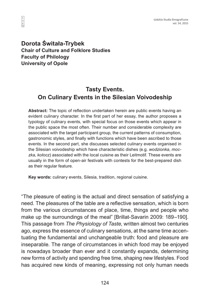 Dorota Świtała-Trybek Chair of Culture and Folklore Studies Faculty of Philology University of Opole Tasty Events. On Culinary Events in the Silesian Voivodeship Abstract: The topic of reflection undertaken herein are public events having an evident culinary character. In the first part of her essay, the author proposes a typology of culinary events, with special focus on those events which appear in the public space the most often. Their number and considerable complexity are associated with the target participant group, the current patterns of consumption, gastronomic styles, and finally with functions which have been ascribed to those events. In the second part, she discusses selected culinary events organised in the Silesian voivodeship which have characteristic dishes (e.g. wodzionka, moczka, kołocz) associated with the local cuisine as their Leitmotif. These events are usually in the form of open-air festivals with contests for the best-prepared dish as their regular feature. Key words: culinary events, Silesia, tradition, regional cuisine. “The pleasure of eating is the actual and direct sensation of satisfying a need. The pleasures of the table are a reflective sensation, which is born from the various circumstances of place, time, things and people who make up the surroundings of the meal” [Brillat-Savarin 2009: 189–190]. This passage from The Physiology of Taste, written almost two centuries ago, express the essence of culinary sensations, at the same time accentuating the fundamental and unchangeable truth: food and pleasure are inseparable. The range of circumstances in which food may be enjoyed is nowadays broader than ever and it constantly expands, determining new forms of activity and spending free time, shaping new lifestyles. Food has acquired new kinds of meaning, expressing not only human needs 124 and desires, but also cultural changes, consumption trends and access to foodstuffs as such. Lastly, the pro-food fashion arrived at the academic world (food studies), becoming the subject of inter-disciplinary scientific discussion [e.g. Curtin, Heldke 1992; Sutton 2001; Ashley, Hollows, Jones, Taylor 2004; Freedman 2007; Belasco 2008]. Culinary events – a proposal for a typology It does not take an expert to notice – if only on the basis of observation conducted in one’s closest environment – that cuisine often becomes the Leitmotif for many events or, strictly speaking, celebrations and festivals. It adds splendour to gatherings of varying formality; from local initiatives on football pitches or culture centres to large projects sponsored by government institutions. Food itself, and its abundance and variety, are a magnet which draws people of diverse social backgrounds, professions and ages. Eating is arguably the best attraction; Anna Wieczorkiewicz discusses this issue in relation to tourism and travelling: National cuisines [...] can be considered convenient props used in creating the realm of tourist attractions. Culinary attractions are created in order to enhance the tourist assets of a given place. Notes about local dishes, regional markets where local delicacies can be bought, culinary fairs or wine trails are often included in tourist information folders, along with descriptions of cultural events and historical monuments [Wieczorkiewicz 2008: 208]. These observations refer directly to culinary events, where a significant portion of the participants are, in fact, tourists visiting the place of the “gustatory spectacle”. Europe offers a wide range of culinary festivals, e.g. the truffle fair in the Italian city of Alba, the Oktoberfest in Munich, La Tomatina in Buñol in Spain, the Festival of New Beaujolais (Beaujol’Ympiades) in Lyon and Les Sarmentelles in Beaujeu [Sawala, Krawczyk, Bednarski 2005]. Outdoor events are organised in such a way that anybody can participate, even tourists from halfway across the globe, who are unfamiliar with the place and come there precisely to have fun and spend their time in engaging and new ways [Świtała-Trybek 2007: 348]. 125 Events centred around food, or with culinary aspects “in the background”, may assume forms that are as numerous as they are diverse. The typology presented below is based on a preliminary analysis of the phenomenon. It focuses primarily on the events that are most often observable in the public space. Their profusion and complexity is related to the location, the target group of participants, the predominant consumer models, gastronomic styles, and finally the functions ascribed to them. Some may be open (for all participants), others are targeted at a specific group of designated consumers; the duration varies from one day to a longer period of time (a week, a month). The majority of “festivals of flavour” is organised on non-working days or on the so-called long weekends (when bank holidays fall on a Monday or Friday), which has a direct influence on the turnout of visitors [Turkiewicz 1997: 25]. The first category of food-related events are fairs of traditional and regional products. The principle behind them is to promote produce characteristic for a given place (region or town). The place of origin and production is a highly important feature of regional and traditional food. Its unique, specific quality results from the local climate, tradition, as well as the natural, cultural and culinary heritage, the skills and knowledge passed from generation to generation. All of this creates an unbreakable bond between the product and the region, often accentuated in the name of the food [Byszewska, Kurpińska 2012: 10] Events of this type feature stalls selling cold cuts, bread, cheese, fruit preserves, honey, beer, liqueurs, wine etc., as well as folk art and craft products. The delicacies on offer at Polish fairs may be local, but some events also include products from other European countries; for this reason several events have been renamed “international fairs” (e.