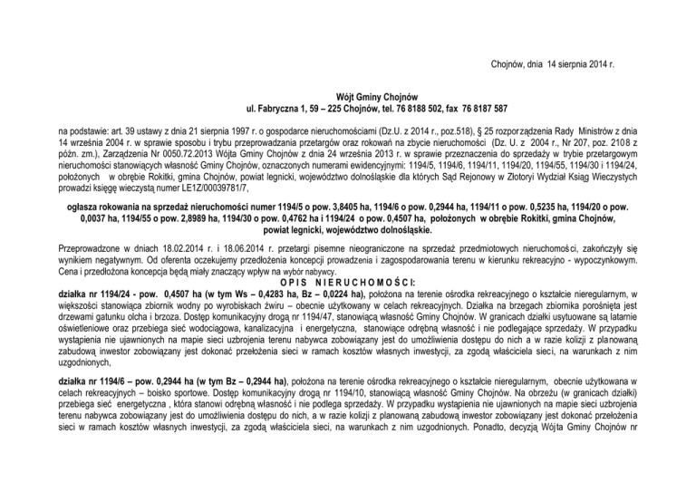 Chojnów, dnia 14 sierpnia 2014 r. Wójt Gminy Chojnów ul. Fabryczna 1, 59 – 225 Chojnów, tel. 76 8188 502, fax 76 8187 587 na podstawie: art. 39 ustawy z dnia 21 sierpnia 1997 r. o gospodarce nieruchomościami (Dz.U. z 2014 r., poz.518), § 25 rozpor ządzenia Rady Ministrów z dnia 14 września 2004 r. w sprawie sposobu i trybu przeprowadzania przetargów oraz rokowań na zbycie nieruchomości (Dz. U. z 2004 r., Nr 207, poz. 210 8 z późn. zm.), Zarządzenia Nr 0050.72.2013 Wójta Gminy Chojnów z dnia 24 września 2013 r. w sprawie przeznaczenia do sprzedaży w trybie przetargowym nieruchomości stanowiących własność Gminy Chojnów, oznaczonych numerami ewidencyjnymi: 1194/5, 1194/6, 1194/11, 1194/20, 1194/55, 1194/30 i 1194/24, położonych w obrębie Rokitki, gmina Chojnów, powiat legnicki, województwo dolnośląskie dla których Sąd Rejonowy w Złotoryi Wydział Ksiąg Wieczystych prowadzi księgę wieczystą numer LE1Z/00039781/7, ogłasza rokowania na sprzedaż nieruchomości numer 1194/5 o pow. 3,8405 ha, 1194/6 o pow. 0,2944 ha, 1194/11 o pow. 0,5235 ha, 1194/20 o pow. 0,0037 ha, 1194/55 o pow. 2,8989 ha, 1194/30 o pow. 0,4762 ha i 1194/24 o pow. 0,4507 ha, położonych w obrębie Rokitki, gmina Chojnów, powiat legnicki, województwo dolnośląskie. Przeprowadzone w dniach 18.02.2014 r. i 18.06.2014 r. przetargi pisemne nieograniczone na sprzedaż przedmiotowych nieruchomoś ci, zakończyły się wynikiem negatywnym. Od oferenta oczekujemy przedłożenia koncepcji prowadz enia i zagospodarowania terenu w kierunku rekreacyjno - wypoczynkowym. Cena i przedłożona koncepcja będą miały znaczący wpływ na wybór nabywcy. O P I S N I E R U C H O M O Ś C I: działka nr 1194/24 - pow. 0,4507 ha (w tym Ws – 0,4283 ha, Bz – 0,0224 ha), położona na terenie ośrodka rekreacyjnego o kształcie nieregularnym, w większości stanowiąca zbiornik wodny po wyrobiskach żwiru – obecnie użytkowany w celach rekreacyjnych. Działka na brzegach zbiornika porośnięta jest drzewami gatunku olcha i brzoza. Dostęp komunikacyjny drogą nr 1194/47, stanowiącą własność Gminy Chojnów. W granicach działki usytuowane są latarnie oświetleniowe oraz przebiega sieć wodociągowa, kanalizacyjna i energetyczna, stanowiące odrębną własność i nie podlegające sprzedaży. W przypadku wystąpienia nie ujawnionych na mapie sieci uzbrojenia terenu nabywca zobowiązany jest do umożliwienia dostępu do nich a w razie kolizji z planowaną zabudową inwestor zobowiązany jest dokonać przełożenia sieci w ramach kosztów własnych inwestycji, za zgodą właściciela siec i, na warunkach z nim uzgodnionych, działka nr 1194/6 – pow. 0,2944 ha (w tym Bz – 0,2944 ha), położona na terenie ośrodka rekreacyjnego o kształcie nieregularnym, obecnie użytkowana w celach rekreacyjnych – boisko sportowe. Dostęp komunikacyjny drogą nr 1194/10, stanowiącą własność Gminy Chojnów. Na obrzeżu (w granicach działki) przebiega sieć energetyczna , która stanowi odrębną własność i nie podlega sprzedaży. W przypadku wystąpienia nie ujawnionych na mapie sieci uzbrojenia terenu nabywca zobowiązany jest do umożliwienia dostępu do nich, a w razie kolizji z planowaną zabudową inwestor zobowiązany jest dokonać przełożenia sieci w ramach kosztów własnych inwestycji, za zgodą właściciela sieci, na warunkach z nim uzgodnionych. Ponadto, decyzją Wójta Gminy Chojnów nr RGG.7430-21/02 z dnia 10.07.2002 r. zatwierdzającą podział nieruchomości, na przedmiotowej działce ustanowiono drogę konieczną – dojazdową do działek numer 630/2 do 630/7, działka nr 1194/5 – pow. 3,8405 ha (w tym Ws – 3,6514 ha, Bz – 0,1891 ha), położona na terenie ośrodka rekreacyjnego o kształcie nieregularnym, w większości stanowiąca zbiornik wodny po wyrobiskach żwiru – obecnie użytkowany w celach rekreacyjnych. Działka na brzegach zbiornika porośnięta jest drzewami gatunku: olcha, brzoza, osika, topola, świerk i sosna. Dostęp komunikacyjny drogą nr 1194/10 stanowiącą własność Gminy Chojnów. W granicach działki usytuowane są latarnie oświetleniowe, słupy energetyczne oraz przebiega sieć wodociągowa i energetyczna, stanowiące odrębną własność i nie podlegające sprzedaży. W przypadku wystąpienia nie ujawnionych na mapie sieci uzbrojenia terenu nabywca zobowiązany jest do umożliwienia dostępu do nich, a w razie kolizji z planowaną zabudową inwestor zobowiązany jest dokonać przełożenia sieci w ramach kosztów własnych inwestycji, za zgodą właściciela sieci, na warunkach z nim uzgodnionych, działka nr 1194/20 – pow. 0,0037 ha (w tym Bz – 0,0037 ha), położona na terenie ośrodka rekreacyjnego o kształcie nieregularnym, zabudowana budynkiem wolnostojącym wc o powierzchni użytkowej 6 m2. Dostęp komunikacyjny drogą nr 1194/17, stanowiącą własność Gminy Chojnów. W przypadku wystąpienia nie ujawnionych na mapie sieci uzbrojenia terenu nabywca zobowiązany jest do umożliwienia dostępu do nich, a w razie kolizji z planowaną zabudową inwestor zobowiązany jest dokonać przełożenia sieci w ramach kosztów własnych inwestycji, za zgodą właściciela sieci, na warunkach z nim uzgodnionych, działka nr 1194/11 – pow. 0,5235 ha (w tym Bz – 0,5235 ha), położona na terenie ośrodka rekreacyjnego o kształcie nieregularnym, stanowiąca parking, zabudowana budynkiem murowanym – portiernią (dach płaski, kryty papą) o powierzchni 17,50 m 2. Działka na brzegach porośnięta jest drzewami gatunku: olcha, brzoza, topola i dąb. Dostęp komunikacyjny drogami nr 881/2 i 882, stanowiącymi własność Gminy Chojnów. W granicach działki usytuowane są latarnie oświetleniowe, słupy energetyczne oraz przebiega sieć energetyczna. W przypadku wystąpienia nie ujawnionych na mapie sieci uzbrojenia terenu nabywca zobowiązany jest do umożliwienia dostępu do nich, a w razie kolizji z planowaną zabudową inwestor zobowi