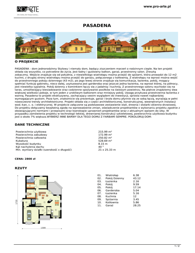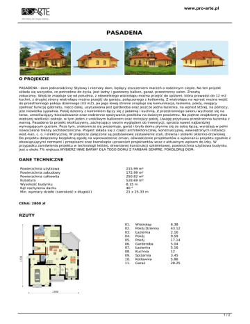 www.pro-arte.pl PASADENA O PROJEKCIE PASADENA - dom jednorodzinny Stylowy i niemały dom, będący ziszczeniem marzeń o rodzinnym cieple. Na ten projekt składa się wszystko, co potrzebne do życia. Jest ładny i gustowny balkon, garaż, przestronny salon. Zresztą zobaczmy. Wejście znajduje się od południa, z niewielkiego wiatrołapu można przejść do spiżarni, która prowadzi do 12 m2 kuchni, z drugiej strony wiatrołapu można przejść do garażu, połączonego z kotłownią. Z wiatrołapu na wprost można wejść do przestronnego pokoju dziennego (43 m2), po jego lewej stronie znajduje się komunikacja, łazienka, pokój, mogący spełniać funkcję gabinetu, nieco dalej, usytuowana jest garderoba oraz jeszcze jedna łazienka, na wprost której, na północy, jest niewielka sypialnia. Pokój dzienny z kominkiem łączy się z jadalnią i kuchnią. Z przestronnego salonu wychodzi się na taras, umożliwiający biesiadowanie oraz codzienne spożywanie posiłków na świeżym powietrzu. Na piętrze znajdziemy dwa większej wielkości pokoje, w tym jeden z urokliwym balkonem oraz mniejszy pokój. Uwagę przykuwa przestrzenna łazienka z wanną. Pasadena to projekt ekskluzywny, zachęcający swoim wyglądem do inwestycji, sprosta nawet najbardziej wymagającym gustom. Poza tym, znakomicie się prezentuje, garaż i bryła domu płynnie się ze sobą łączą, wyrażają w pełni nowoczesne trendy architektoniczne. Projekt składa się z części architektonicznej, konstrukcyjnej, wewnętrznych instalacji wod.-kan, c. o. i elektrycznej. W projekcie załączone są podstawowe zestawienie stali, drewna i stolarki okienno-drzwiowej. Do projektu dołączamy bezpłatną zgodę na wprowadzenie zmian, oświadczenie projektantów o wykonaniu projektu zgodnie z obowiązującymi normami i przepisami oraz kserokopie uprawnień projektantów wraz z aktualnym wpisem do izby. W przypadku zamówienia projektu w technologii lekkiej, drewnianej konstrukcji szkieletowej, powierzchnia użytkowa budynku jest o około 7% większa.WYBIERZ INNE BARWY DLA TEGO DOMU Z FARBAMI SEMPRE. POKOLORUJ DOM: DANE TECHNICZNE Powierzchnia użytkowa Powierzchnia zabudowy Powierzchnia całkowita Kubatura Wysokość budynku Kąt nachylenia dachu Min. wymiary działki (szerokość x długość) 215.99 m² 172.99 m² 250.82 m² 528.69 m³ 8.15 m 40 ° 21 x 25.33 m CENA: 2800 zł RZUTY 01. 02. 03. 04. 05. 06. 07. 08. 09. 10. 11. Wiatrołap Pokój Dzienny Łazienka Pokój Pokój Garderoba Łazienka Kuchnia Spiżarnia Kotłownia Garaż 6.38 43.12 2.16 9.59 17.14 5.04 5.16 12 3.45 5.86 28.25 1/2 www.pro-arte.pl 01. 02. 03. 04. 05. Komunikacja Pokój Pokój Łazienka Pokój 8.35 31.43 3.96 9.75 24.34 tel. (32) 43-50-829, 502 575 920, [email protected], www.pro-arte.pl 2/2 Powered by TCPDF (www.tcpdf.org)