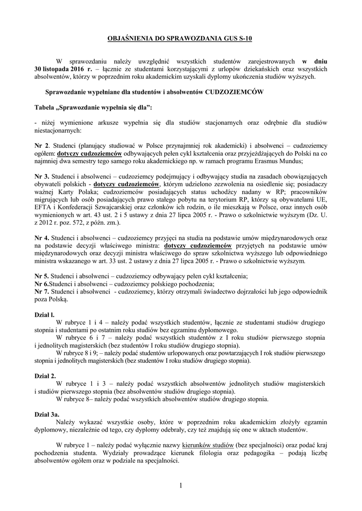 OBJAŚNIENIA DO SPRAWOZDANIA GUS S-10 W sprawozdaniu należy uwzględnić wszystkich studentów zarejestrowanych w dniu 30 listopada 2016 r. – łącznie ze studentami korzystającymi z urlopów dziekańskich oraz wszystkich absolwentów, którzy w poprzednim roku akademickim uzyskali dyplomy ukończenia studiów wyższych. Sprawozdanie wypełniane dla studentów i absolwentów CUDZOZIEMCÓW Tabela „Sprawozdanie wypełnia się dla”: - niżej wymienione arkusze wypełnia się dla studiów stacjonarnych oraz odrębnie dla studiów niestacjonarnych: Nr 2. Studenci (planujący studiować w Polsce przynajmniej rok akademicki) i absolwenci – cudzoziemcy ogółem: dotyczy cudzoziemców odbywających pełen cykl kształcenia oraz przyjeżdżających do Polski na co najmniej dwa semestry tego samego roku akademickiego np. w ramach programu Erasmus Mundus; Nr 3. Studenci i absolwenci – cudzoziemcy podejmujący i odbywający studia na zasadach obowiązujących obywateli polskich - dotyczy cudzoziemców, którym udzielono zezwolenia na osiedlenie się; posiadaczy ważnej Karty Polaka; cudzoziemców posiadających status uchodźcy nadany w RP; pracowników migrujących lub osób posiadających prawo stałego pobytu na terytorium RP, którzy są obywatelami UE, EFTA i Konfederacji Szwajcarskiej oraz członków ich rodzin, o ile mieszkają w Polsce, oraz innych osób wymienionych w art. 43 ust. 2 i 5 ustawy z dnia 27 lipca 2005 r. - Prawo o szkolnictwie wyższym (Dz. U. z 2012 r. poz. 572, z późn. zm.). Nr 4. Studenci i absolwenci – cudzoziemcy przyjęci na studia na podstawie umów międzynarodowych oraz na podstawie decyzji właściwego ministra: dotyczy cudzoziemców przyjętych na podstawie umów międzynarodowych oraz decyzji ministra właściwego do spraw szkolnictwa wyższego lub odpowiedniego ministra wskazanego w art. 33 ust. 2 ustawy z dnia 27 lipca 2005 r. - Prawo o szkolnictwie wyższym. Nr 5. Studenci i absolwenci – cudzoziemcy odbywający pełen cykl kształcenia; Nr 6.Studenci i absolwenci – cudzoziemcy polskiego pochodzenia; Nr 7. Studenci i absolwenci - cudzoziemcy, którzy otrzymali świadectwo dojrzałości lub jego odpowiednik poza Polską. Dział l. W rubryce 1 i 4 – należy podać wszystkich studentów, łącznie ze studentami studiów drugiego stopnia i studentami po ostatnim roku studiów bez egzaminu dyplomowego. W rubryce 6 i 7 – należy podać wszystkich studentów z I roku studiów pierwszego stopnia i jednolitych magisterskich (bez studentów I roku studiów drugiego stopnia). W rubryce 8 i 9; – należy podać studentów urlopowanych oraz powtarzających I rok studiów pierwszego stopnia i jednolitych magisterskich (bez studentów I roku studiów drugiego stopnia). Dział 2. W rubryce 1 i 3 – należy podać wszystkich absolwentów jednolitych studiów magisterskich i studiów pierwszego stopnia (bez absolwentów studiów drugiego stopnia). W rubryce 8– należy podać wszystkich absolwentów studiów drugiego stopnia. Dział 3a. Należy wykazać wszystkie osoby, które w poprzednim roku akademickim złożyły egzamin dyplomowy, niezależnie od tego, czy dyplomy odebrały, czy też znajdują się one w aktach studentów. W rubryce 1 – należy podać wyłącznie nazwy kierunków studiów (bez specjalności) oraz podać kraj pochodzenia studenta. Wydziały prowadzące kierunek filologia oraz pedagogika – podają liczbę absolwentów ogółem oraz w podziale na specjalności. 1 W rubryce 3 i 4 - należy podać tylko absolwentów studiów pierwszego stopnia i jednolitych studiów magisterskich (bez absolwentów studiów drugiego stopnia wykazanych w rubryce 11 i 12). W rubryce 11 i 12 - należy podać liczbę absolwentów studiów drugiego stopnia, tj. osób, które w poprzednim okresie ukończyły studia pierwszego stopnia i obecnie ukończyły studia drugiego stopnia. Dział 4a. W rubryce 1 – należy podać wyłącznie nazwy kierunków studiów (bez specjalności) oraz podać kraj pochodzenia studenta. W rubryce 2 - należy wpisać "m" dla studiów magisterskich (studia drugiego stopnia i jednolite magisterskie), "l" dla studiów pierwszego stopnia kończących się uzyskaniem tytułu licencjata, a w rubryce 3 cyfrę oznaczającą czas trwania studiów, np. studia magisterskie o 5-letnim cyklu kształcenia oznacza się symbolem "m-5". Kierunek lekarski należy wykazać jako studia magisterskie i w rubryce 3 oznaczyć: lekarski - "m-6". W przypadku studiów pomostowych należy podać rzeczywisty czas trwania studiów. W rubryce 4 i 5 - należy podać liczbę studentów zarejestrowanych w dniu 30 listopada br., łącznie ze studentami korzystającymi z urlopów. W rubrykach 10 i 11 - należy podać studentów I roku studiów, którzy w roku sprawozdawczym korzystają z urlopu (studenckiego lub dziekańskiego) oraz studentów, którzy powtarzają I rok studiów. Różnica między rubrykami 8 i 10 oraz 9 i 11 stanowi liczbę studentów, którzy w roku sprawozdawczym zostali przyjęci na studia na UJ CM w ramach rekrutacji na I rok studiów. W rubryce 24 i 25 – należy podać studentów ostatniego roku studiów na studiach drugiego stopnia. W rubryce 26 i 27 - należy podać liczbę studentów, którzy w roku akademickim 2014/2015 zakończyli ostatni semestr studiów, lecz do dnia 30 listopada bieżącego roku sprawozdawczego nie złożyli egzaminu dyplomowego. Dział 5. i 6. Studentów niepełnosprawnych należy wykazać według głównego rodzaju niepełnosprawności. Studentów niepełnosprawnych studiujących na dwóch lub więcej kierunkach należy wykazać na każdym z tych kierunków oddzielnie we wszystkich rubrykach z wyjątkiem rubryki 3. Do Działu 5 (studenci niepełnosprawni) należy dołączyć imienną listę studentów wykazywanych w tej części wraz ze wskazaniem rodzaju niepełnosprawności. Wypełnia się na podstawie orzeczeń o stopniu niepełnosprawności wydanych na podstawie ustawy z dnia 27 sierpnia 1997 r. o rehabilitacji