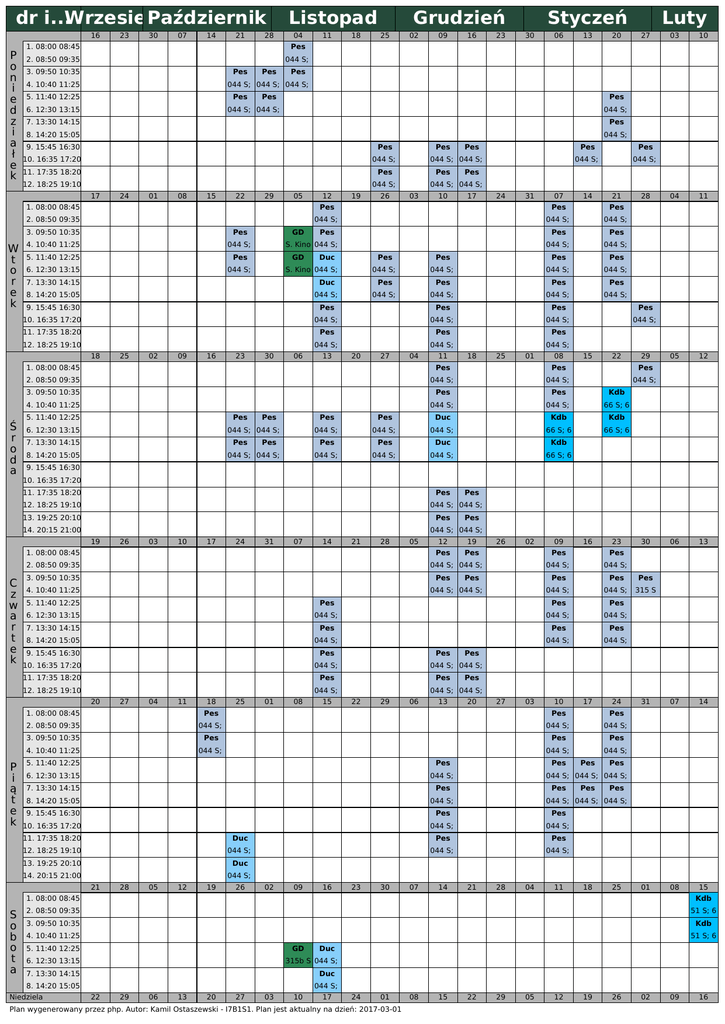 dr i...Wrzesień Październik 16 P o n i e d z i a ł e k 23 30 07 14 21 28 1. 08:00 08:45 Listopad 04 18 Grudzień 25 02 2. 08:50 09:35 Pes 4. 10:40 11:25 Pes 5. 11:40 12:25 Pes 6. 12:30 13:15 06 13 20 Luty 27 03 10 04 11 05 12 06 13 31 07 14 01 08 Pes Pes Pes 044 S; 7. 13:30 14:15 Pes 8. 14:20 15:05 044 S; 9. 15:45 16:30 Pes 10. 16:35 17:20 044 S; 11. 17:35 18:20 Pes 12. 18:25 19:10 044 S; 24 01 08 15 22 29 05 3. 09:50 10:35 Pes 4. 10:40 11:25 044 S; 5. 11:40 12:25 Pes 6. 12:30 13:15 044 S; GD 12 19 26 Pes Pes 044 S; 044 S; Pes Pes 044 S; Pes 03 10 17 24 31 07 14 21 Pes Pes Pes 044 S; 044 S; 044 S; Pes Pes Pes 044 S; 044 S; S. Kino 044 S; GD Pes 044 S; 044 S; 044 S; Duc S. Kino 044 S; Pes Pes Pes Pes 044 S; 044 S; 044 S; 044 S; 7. 13:30 14:15 Duc Pes Pes Pes Pes 8. 14:20 15:05 044 S; 044 S; 044 S; 044 S; 044 S; 28 9. 15:45 16:30 Pes Pes Pes Pes 10. 16:35 17:20 044 S; 044 S; 044 S; 044 S; 11. 17:35 18:20 Pes Pes Pes 12. 18:25 19:10 044 S; 044 S; 044 S; 25 02 09 16 23 30 06 13 20 27 04 11 18 25 01 08 15 22 1. 08:00 08:45 Pes Pes 2. 08:50 09:35 044 S; 044 S; 3. 09:50 10:35 Pes Pes Kdb 66 S; 6 4. 10:40 11:25 5. 11:40 12:25 Pes 6. 12:30 13:15 Pes 044 S; 044 S; 7. 13:30 14:15 Pes 8. 14:20 15:05 Pes 044 S; 044 S; 044 S; 044 S; 044 S; Pes Duc Kdb Kdb 044 S; 044 S; 044 S; 66 S; 6 66 S; 6 Pes Pes Duc Kdb 044 S; 044 S; 044 S; 66 S; 6 29 Pes Pes 9. 15:45 16:30 10. 16:35 17:20 11. 17:35 18:20 Pes 12. 18:25 19:10 Pes 044 S; 044 S; 13. 19:25 20:10 Pes 14. 20:15 21:00 Pes 044 S; 044 S; 19 26 03 10 17 24 31 07 14 21 28 05 1. 08:00 08:45 2. 08:50 09:35 12 19 Pes Pes 26 02 044 S; 044 S; 3. 09:50 10:35 Pes 4. 10:40 11:25 Pes 044 S; 044 S; 09 16 23 Pes Pes 044 S; 044 S; Pes Pes 044 S; 044 S; 315 S Pes Pes Pes 6. 12:30 13:15 044 S; 044 S; 044 S; 7. 13:30 14:15 Pes Pes Pes 8. 14:20 15:05 044 S; 044 S; 044 S; 9. 15:45 16:30 Pes 10. 16:35 17:20 044 S; 11. 17:35 18:20 Pes 12. 18:25 19:10 044 S; 27 04 11 18 25 01 08 15 Pes Pes 044 S; 044 S; Pes Pes 044 S; 044 S; 22 29 06 13 20 27 03 10 17 24 1. 08:00 08:45 Pes Pes Pes 2. 08:50 09:35 044 S; 044 S; 044 S; 3. 09:50 10:35 Pes Pes Pes 4. 10:40 11:25 044 S; 044 S; 044 S; 5. 11:40 12:25 Pes 6. 12:30 13:15 044 S; 7. 13:30 14:15 Pes 8. 14:20 15:05 044 S; Pes Pes Pes Pes 044 S; 044 S; 11. 17:35 18:20 Duc Pes Pes 12. 18:25 19:10 044 S; 044 S; 044 S; Duc 044 S; 21 28 05 12 19 26 02 09 16 23 30 07 14 Pes Pes Pes 044 S; 044 S; 044 S; 9. 15:45 16:30 14. 20:15 21:00 Pes 044 S; 044 S; 044 S; 10. 16:35 17:20 13. 19:25 20:10 30 Pes 5. 11:40 12:25 20 S o b o t a Styczeń 30 044 S; 044 S; 18 P i ą t e k 23 044 S; 044 S; 044 S; 2. 08:50 09:35 C z w a r t e k 16 044 S; 3. 09:50 10:35 17 Ś r o d a 09 Pes 1. 08:00 08:45 W t o r e k 11 21 28 04 11 18 25 15 1. 08:00 08:45 Kdb 2. 08:50 09:35 51 S; 6 3. 09:50 10:35 Kdb 4. 10:40 11:25 51 S; 6 5. 11:40 12:25 GD 6. 12:30 13:15 Duc 315b S 044 S; 7. 13:30 14:15 Duc 8. 14:20 15:05 044 S; Niedziela 22 29 06 13 20 27 03 10 17 24 01 Plan wygenerowany przez php. Autor: Kamil Ostaszewski - I7B1S1. Plan jest aktualny na dzień: 2017-03-01 08 15 22 29 05 12 19 26 02 09 16