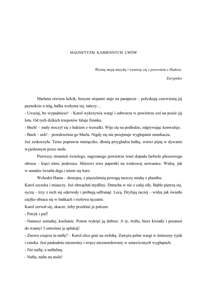 MAGNETYZM KAMIENNYCH LWÓW Wezmę moją muzykę i wyniosę cię z powrotem z Hadesu. Eurypides Marlena otwiera lufcik, bosymi stopami staje na parapecie – połyskują czerwienią jej paznokcie u nóg, halka wzdyma się, tańczy… - Uważaj, bo wypadniesz! – Karol wykrzywia wargi i odtwarza w powietrzu coś na pozór jej lotu. Od tych dzikich trzepotów faluje firanka. - Buch! – mały stoczył się z hukiem z wersalki. Wije się na podłodze, odgrywając konwulsje. - Buch – uch! – przedrzeźnia go Marla. Nigdy się nie przejmuje wygłupami smarkacza. Już zeskoczyła. Teraz poprawia ramiączko, dłonią przygładza halkę, wierci piętą w dywanie wyjedzonym przez mole. Pierwszy strumień świeżego, nagrzanego powietrza wnet dopada farfocle pluszowego obrusa – kręci nimi, podrzuca. Mierzwi siwe paprotki na wiekowej serwantce. Widzę, jak w smudze światła drga i mieni się kurz. Wchodzi Hania – dostojna, z pięcioletnią powagą taszczy miskę z plastiku. Karol szczeka i miauczy. Już obwąchał mydliny. Dmucha w nie z całej siły. Bąble piętrzą się, syczą – trzy z nich się oderwały i próbują odfrunąć. Lecą. Dryfują raczej – widzę jak światło ciężko obraca się w bańkach i rozlewa tęczami. Karol zerwał się, skacze, żeby przekłuć je palcem. - Pstryk i puf! - Namocz szmatkę, kochanie. Potem wykręć ją dobrze. A ty, trollu, bierz kwiatki i pozanoś do wanny! I ostrożnie je spłukaj! - Znowu czujesz tu naftę? – Karol chce grać na zwłokę. Zawęża pełne wargi w śmieszny ryjek i cmoka. Jest paskudnie nieznośny i wręcz niezmordowany w ustawicznych wygłupach. - Nie naftę, a naftalinę. - Nafta, nafta na mole! - Naftę w głowie masz, durniu! – nie wytrzymuję. Chyba palnę go w ucho lub zasadzę kuksańca. – Czekaj, czekaj potworze, poskarżę się matce! - Już się boję! - No, spokój! – mityguje Marla. – Skończmy już z tym pokojem… Wzdycham i macham ręką. Jednak ona ma rację. Siostry niczym roboty walczą z kurzem na półkach. Kończę porządki w szafie – głaszczę czarną jesionkę babki – jej ulubioną, po czym wtaczam odkurzacz. Włączam. W królestwie ryku wreszcie nikt nie paple! *** Kurze są nieśmiertelne – rysuję w nich palcem. Hieroglify i smoki, i Karola -fokę. Jeszcze jakiś bohomaz, jeszcze jakieś bazgroły ciut do chińskich podobne. Albo może japońskich? Naftalina i kurz… - Tu się ukrywasz, Nuta? – to Marla. Więc kiwam głową. Puszczam jej perskie oko. - Będę w pracy do czwartej, jakby zadzwonił Jacek… Odbierz trolla w południe. A Haneczkę już mama przyprowadzi wieczorem. Acha, sznycli nie przypal. Obierzecie ogórki. Weź śmietanę z lodówki. Jak przećwiczysz kartofle, wstaw etiudy do garnka, tylko na średni ogień! I pilnuj. Gdy będą pyrkać, skręcisz gaz na minimum… - Spoko. - Co też ja gadam! - Kumam, Marla. Jest O.K… Drzwi trzasnęły. Już wyszła, teraz sunie po schodach. Teraz pędzi jak strzała – mija rzędy kamienic, plamy cienia i światła. Nad jej głową kołyszą się kiście akacji – kiedyś urząd je wyciął, lecz odrosły i rosną, i szeleszczą cudownie. Dudnią obcasy szpilek, frunie za nią apaszka, białe poły prochowca wybrzuszone jak żagle gonią Marlę z łopotem. Widzę siostrę jak biegnie, jak dopada przystanku – wspieram głowę o poręcz starego fotela babki. O, nadjeżdża autobus – warcząc, połyka ludzi. Nie muszę zamykać oczu, by zobaczyć, co zechcę. Wszystko, z jednym wyjątkiem, jednak nie myślę o tym. Nie teraz. Nie w tej chwili – może nawet nie dziś …? Posiedzę jeszcze kwadrans, nim przećwiczę Schumanna. Mało czasu! Dajemy nasz koncert już w piątek… Może mama się skusi? Eee…, to nie tak. Po prostu jeszcze nie wiadomo, czy przydzielą jej wolne – prosiła o nie dawno, jednak w pełni sezonu jest to niezbyt realne, twierdzi ten… jej kierownik. Nazywamy go Gburem albo Kurzym Korpusem. Tak czy siak muszę orać, aby się nie wygłupić. Praca ludzi wzbogaca – mawia Donata Proboszcz, nasza wychowawczyni. Teraz myślę i marzę w dusznym pokoju babki. Nikogo to nie dziwi, bo tu stoi instrument. Więc nikt się nie domyśla, jak uwielbiam to miejsce. Zegar z martwą kukułką, pył i kurz, bibeloty. Krzywe meble sprzed wojny: wieczne, głuche skrzypienia – ich uparte melodie… Melodie zapomnianych, zbytecznych przedmiotów. Sprężyny ożywają pojedynczym brzdęknięciem. Korniki pożerają ramy sztychów i luster. Za kredensem jest dziura – słychać mysie chroboty, które milkną, gdy tylko stuknąć parę akordów. I ten dziwaczny zapach – bzu, lawendy, starości… W domu tak boski spokój, że uwierzyć nie sposób. Sięgam do starych szuflad – szperam w kartach albumów. Są opasłe i pachną kuleczkami na mole. Naftaliną, zwalczaną przez matkę i siostrę – szukają jej w tych gratach, wyrzucają do kosza. Kiedyś widziałam w filmie radzieckim czy ruskim, jak ciężarna kobieta… Jak je jadła po prostu! Gryzła je albo nawet połykała w całości… Naftalina i kurz. Więc albumy: najstarszy jest schowany w safianie, w takim zmyślnym pokrowcu. Karty mną się i kruszą. Przypatruję się starym, zżółkłym fotografiom – twarze patrzą przez sepię. Wszyscy upozowani – większość zdjęć wykonano w przedwojennym atelier, dlatego są wyraźne, pomimo, iż zgryzione przez czas. No i przez mole. Gość z pokaźnym cygarem nazywał się Olo i był znanym aktorem – wiem, bo mówiła babcia. A tamta w kapeluszu, w gigantycznej lawinie strusich i pawich piór, to … „cukierku, nie pytaj!”. A ta otyła dama w futrze z fok, to prababka, a ta chuda dziewczyna, ta w spiczastych lakierkach, to nasza babka Ida… Drugi album też w skórze – chropowatej, brązowej, która mi się kojarzy z korą parkowych drzew. Albo z aligatorem. Karty są oddzielone dziwną, mleczną bibułą – pergaminem podobno! Fotografie wyblakły - większość z nich wykonywał w p